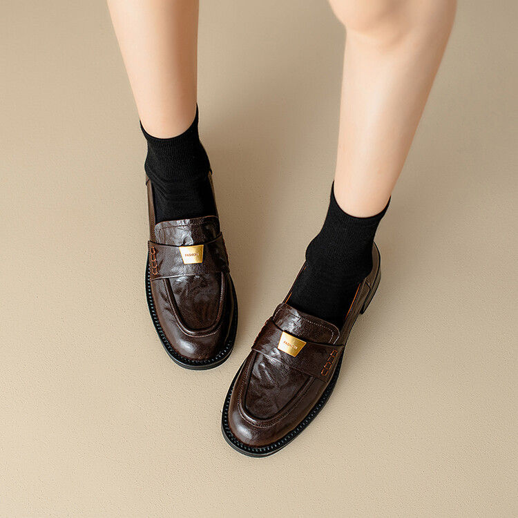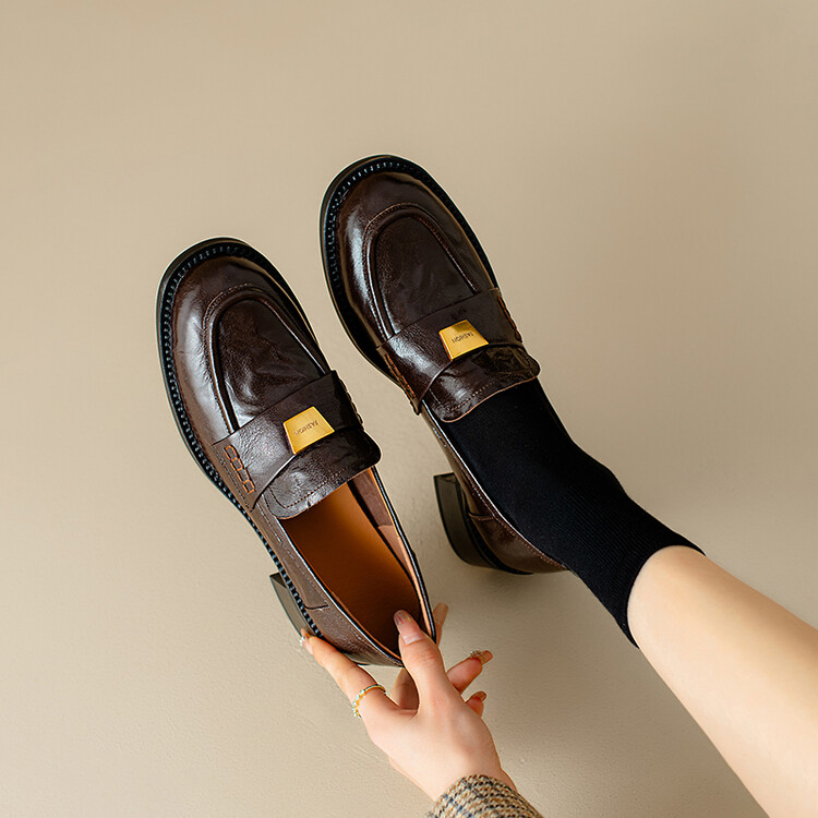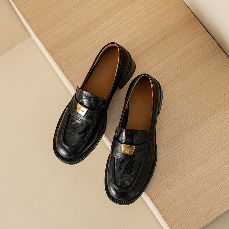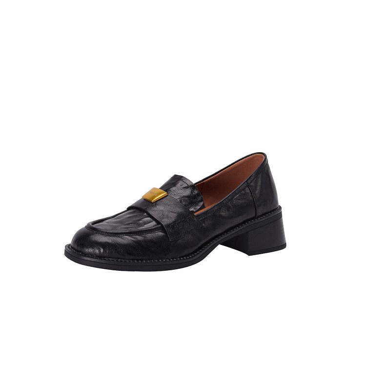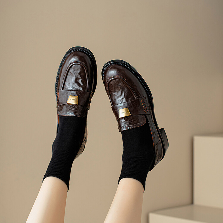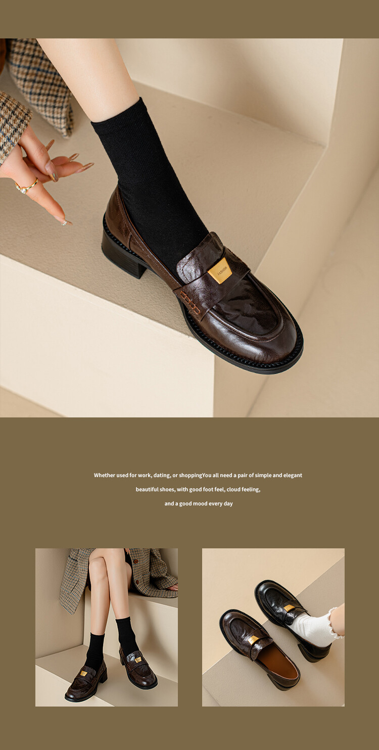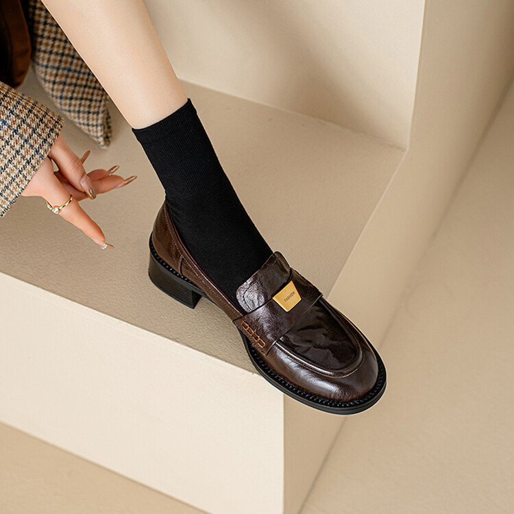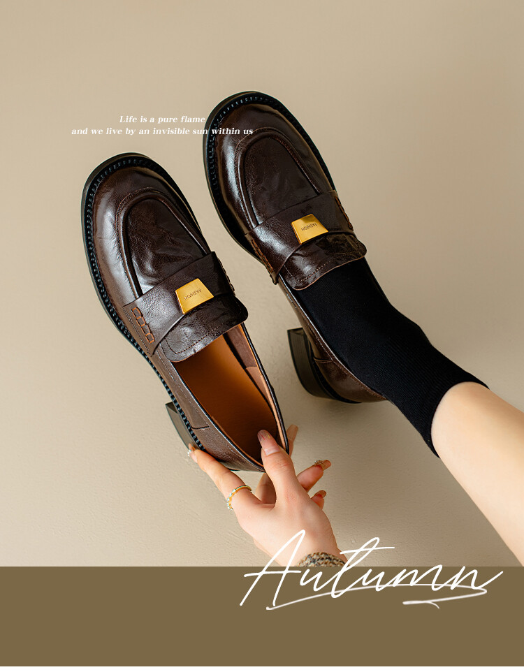 【预售5天】复古粗跟圆头乐福鞋女春秋新款手抓纹羊皮一脚蹬单鞋英伦风小皮鞋NJMK&K836