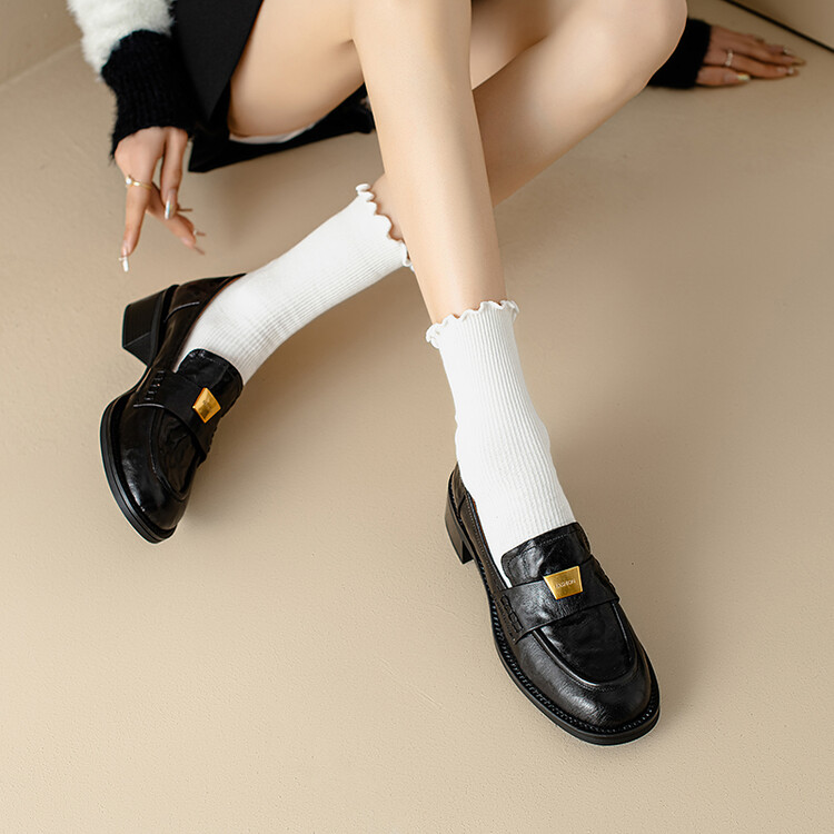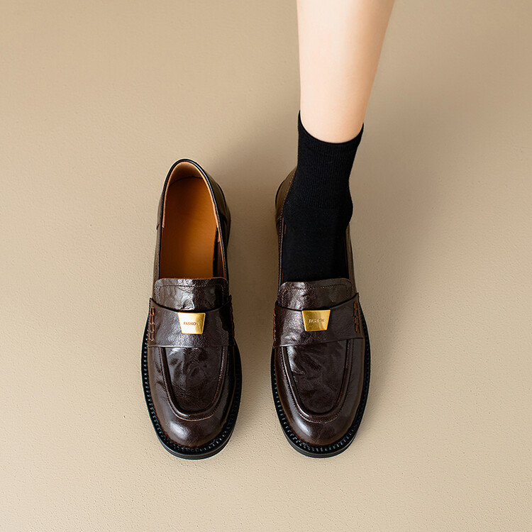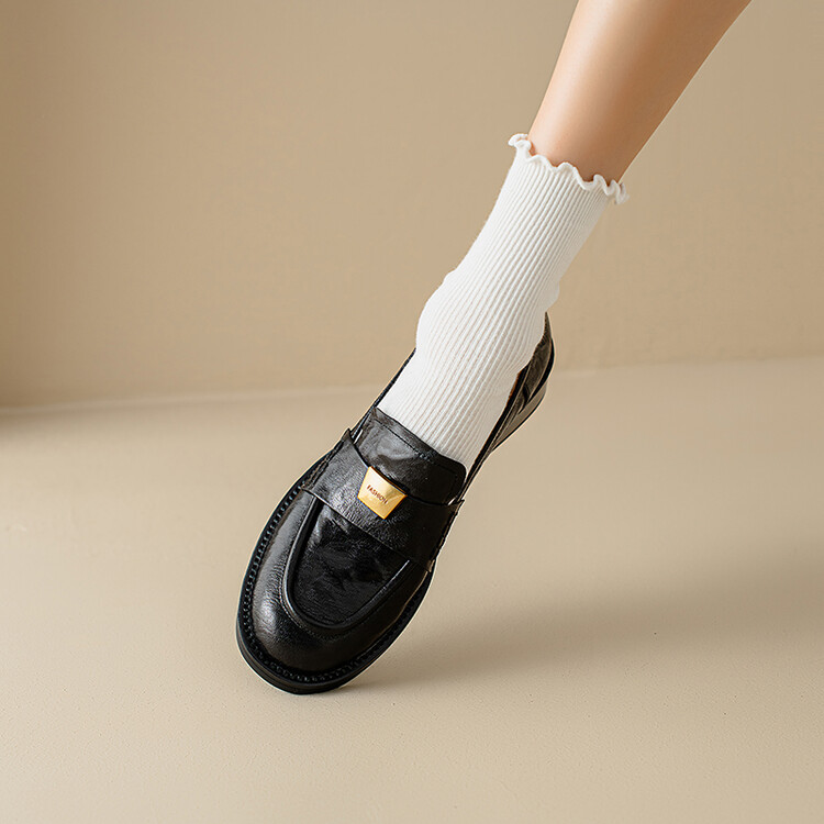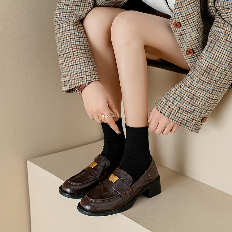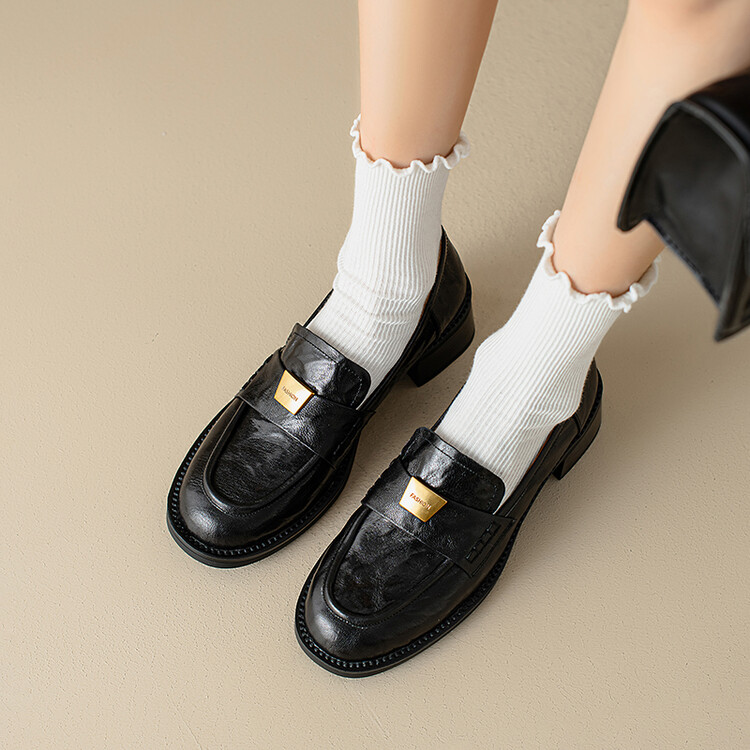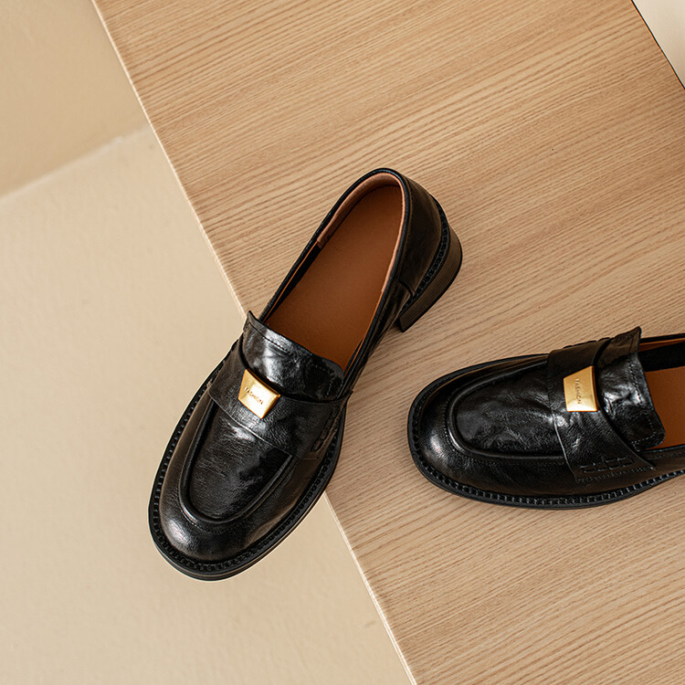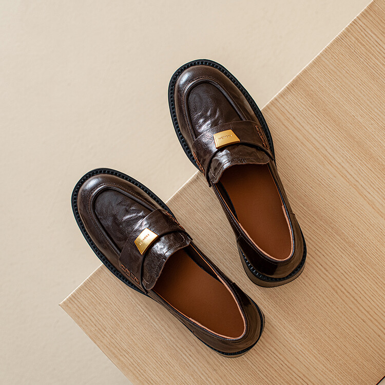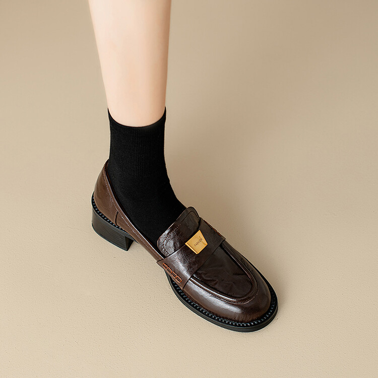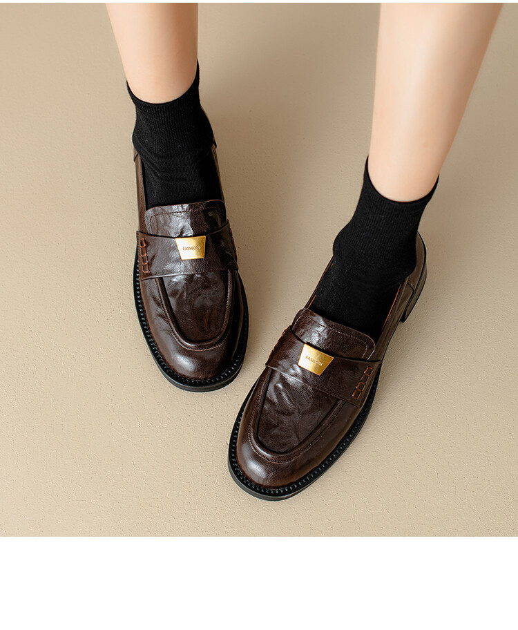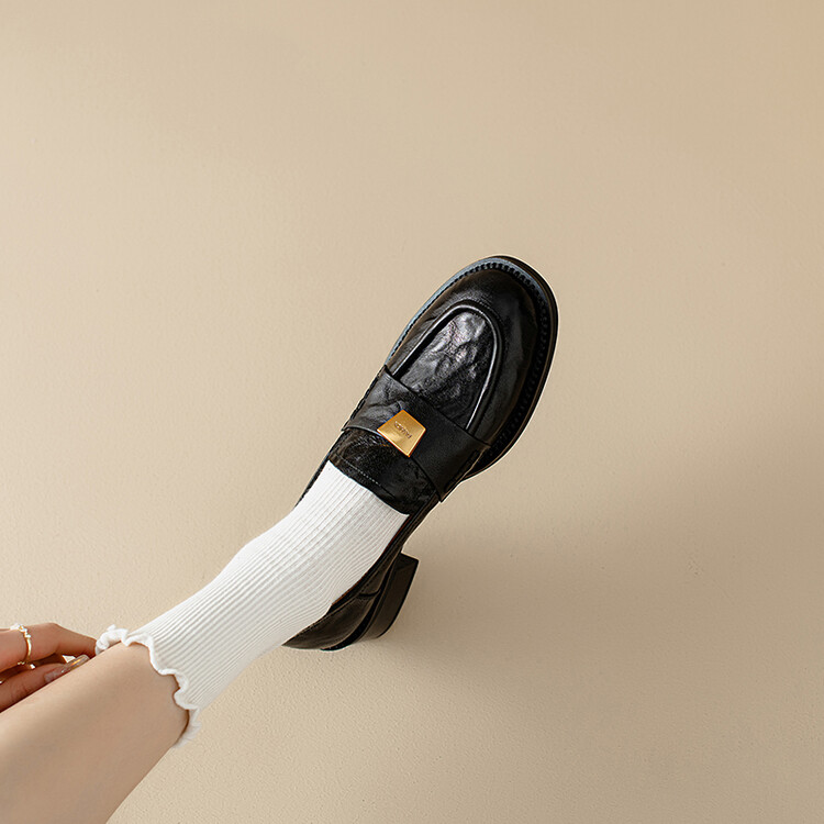 【预售5天】复古粗跟圆头乐福鞋女春秋新款手抓纹羊皮一脚蹬单鞋英伦风小皮鞋NJMK&K836