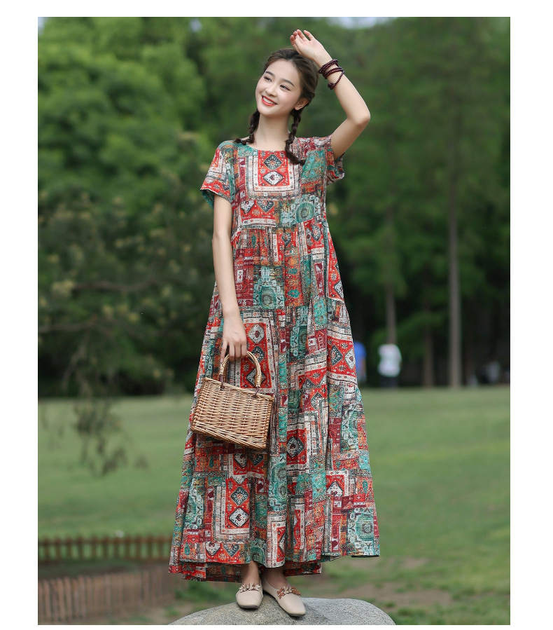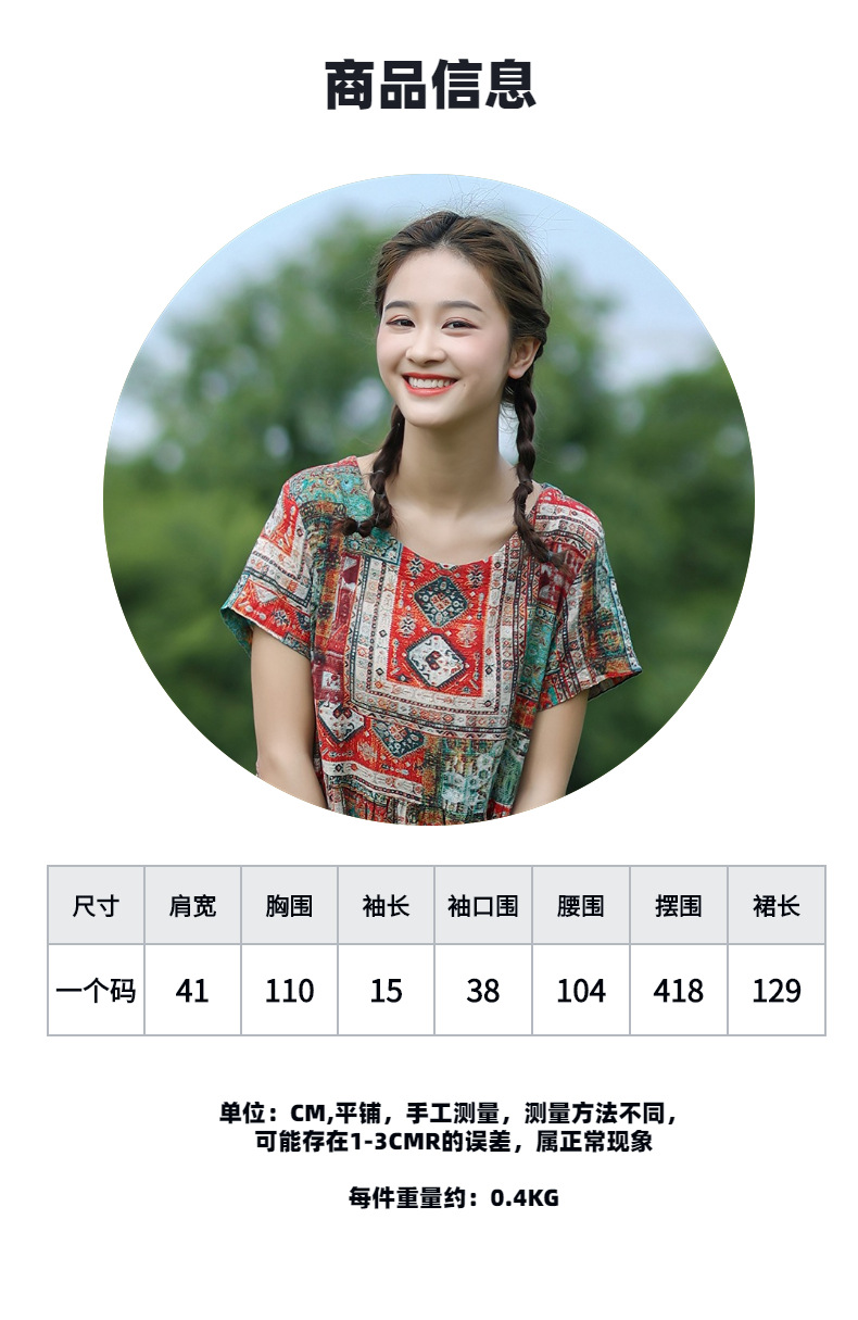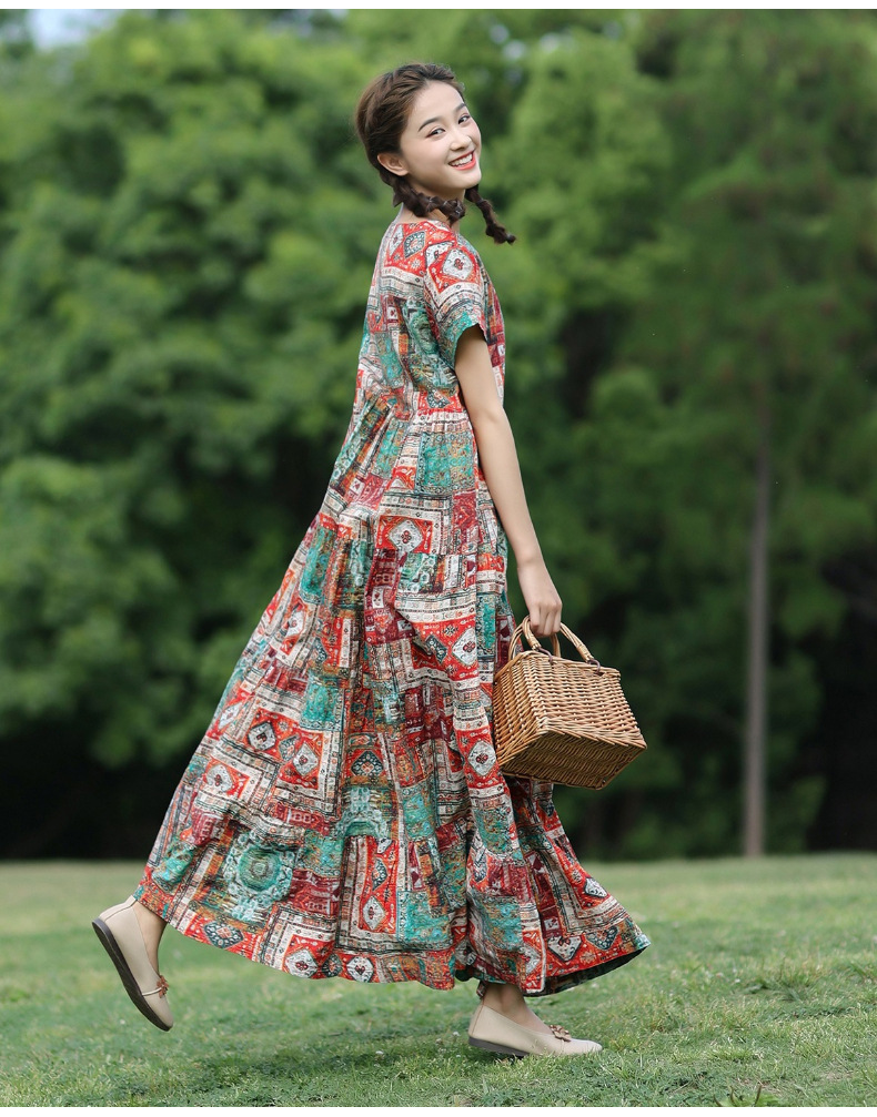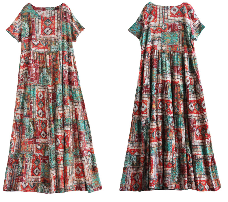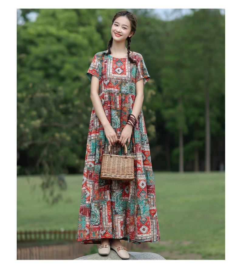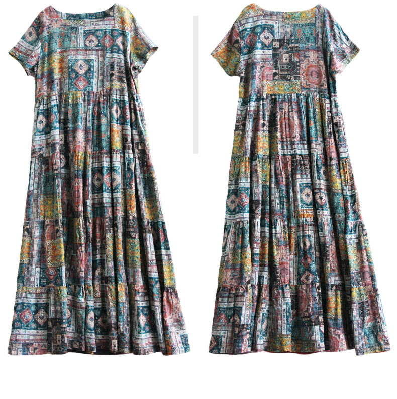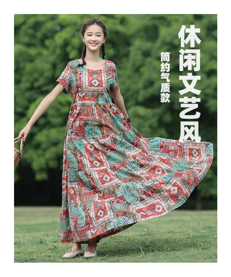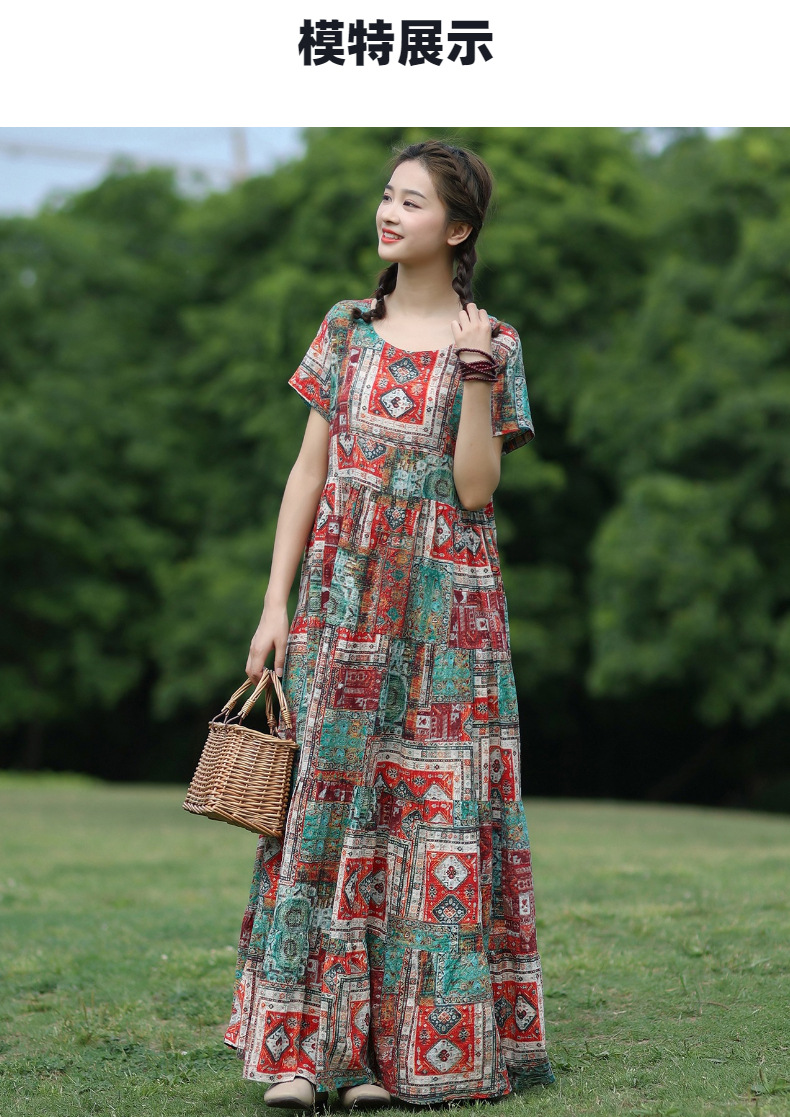 【GYS】A60035夏休闲大摆连衣裙2023新款简约圆领短袖薄棉麻宽松格子长裙