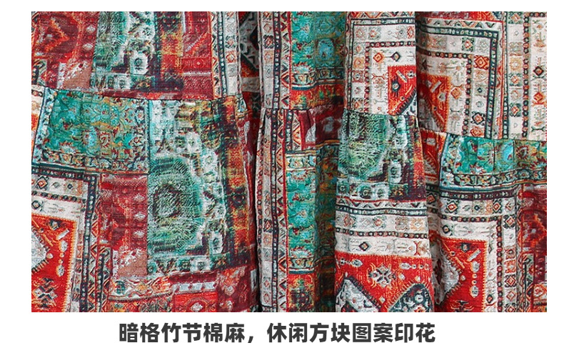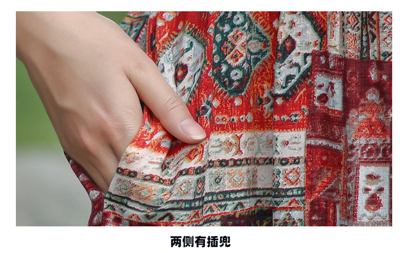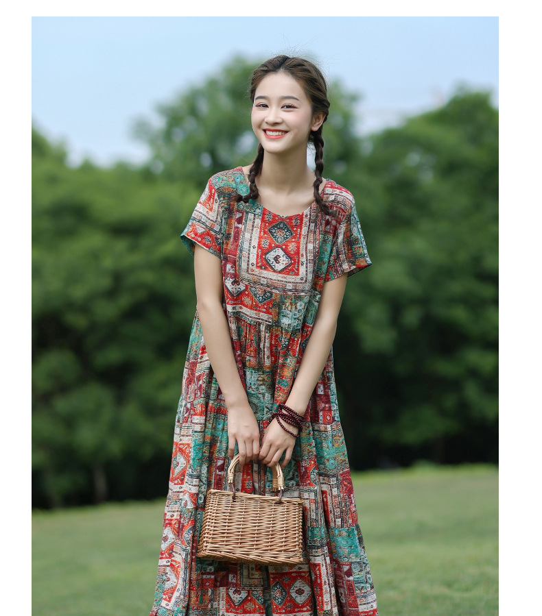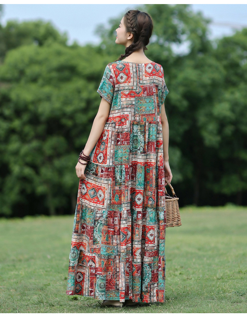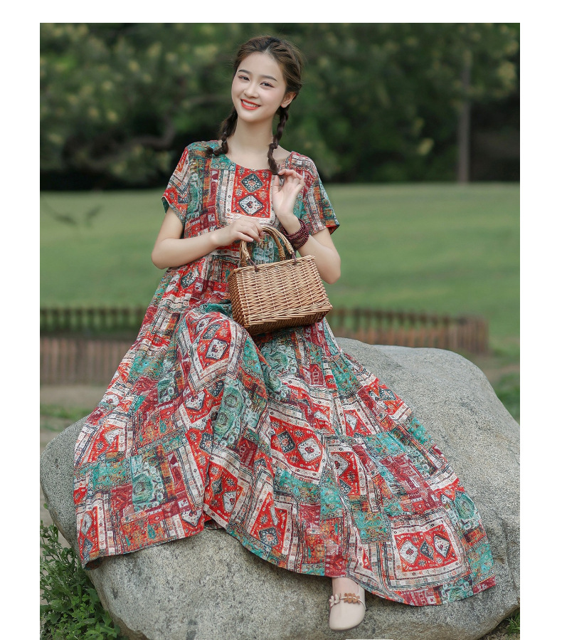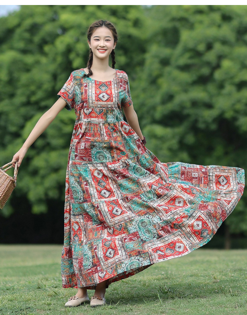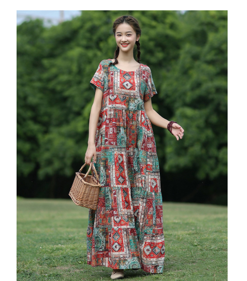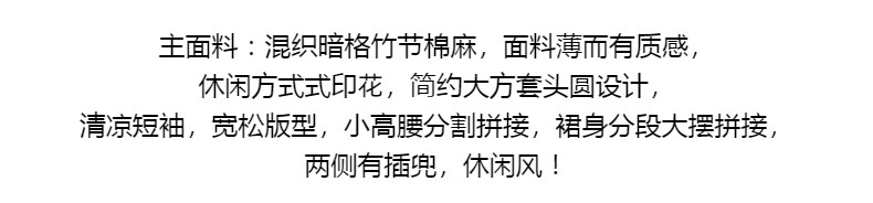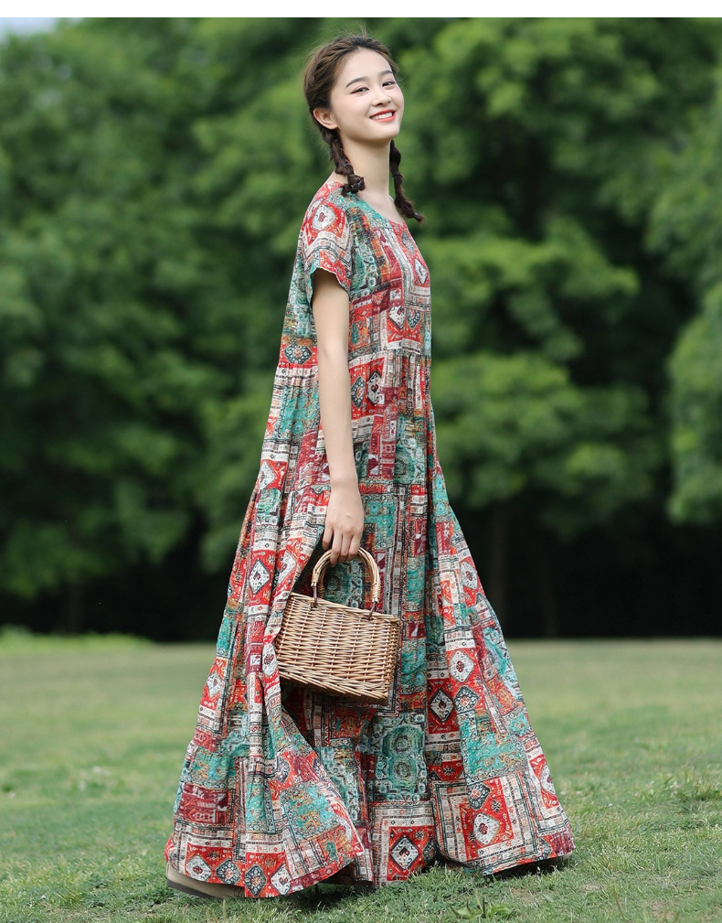 【GYS】A60035夏休闲大摆连衣裙2023新款简约圆领短袖薄棉麻宽松格子长裙