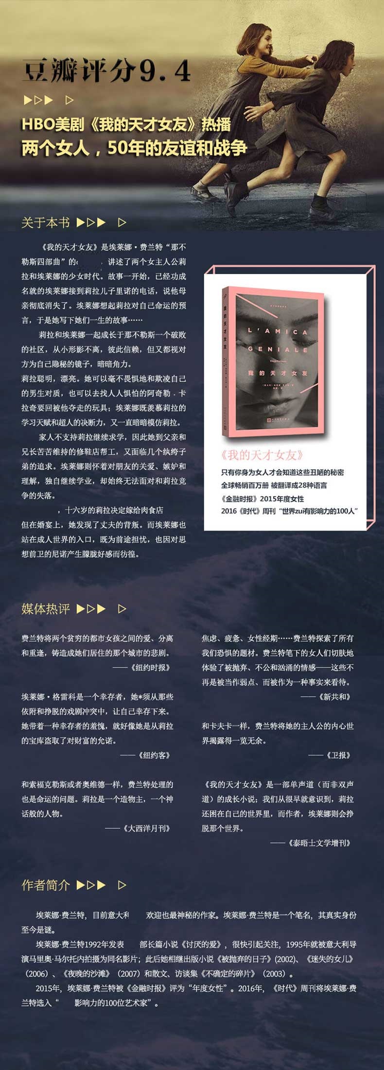 《我的天才女友》是埃莱娜·费兰特“那不勒斯四部曲”的*部,讲述了两个女主人公莉拉和埃莱娜的少女时代。故事一开始,已经功成名就的埃莱娜接到莉拉儿子里诺的电话,说他母亲彻底消失了。埃莱娜想起莉拉对自己命运的预言,于是她写下她们一生的故事……