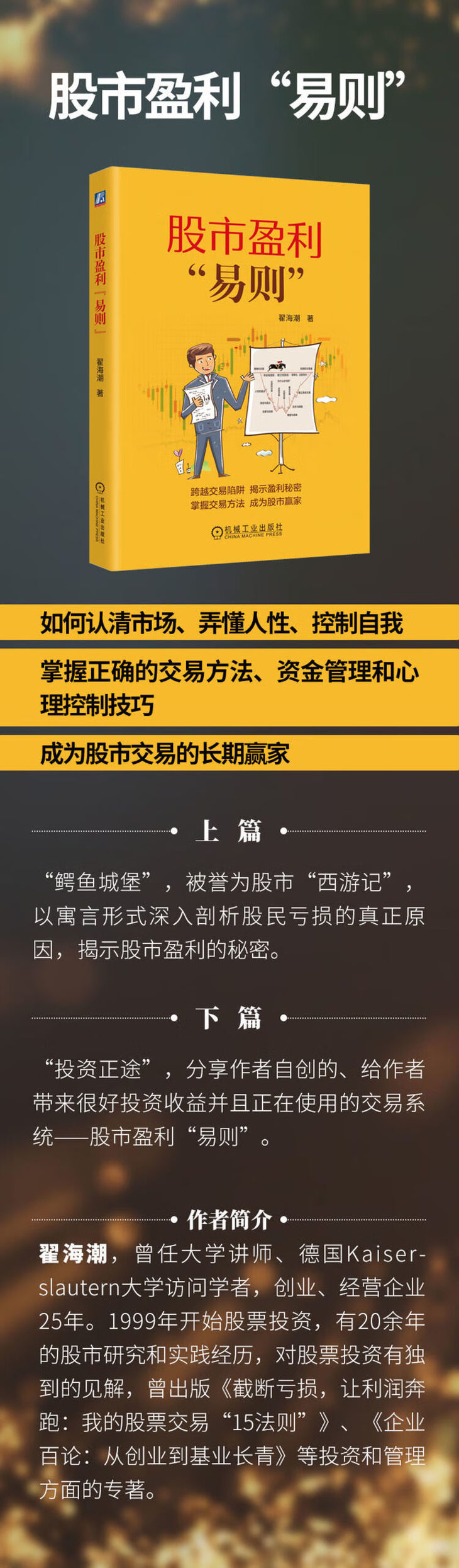 翟海潮,曾任大学讲师、德国Kaiserslautern大学访问学者,创业、经营企业25年。1999年开始股票投资,有20余年的股市研究和实践经历,对股票投资有独到的见解,曾出版《截断亏损,让利润奔跑:我的股票交易“15法则”》、《企业百论:从创业到基业长青》等投资和管理方面的专著。