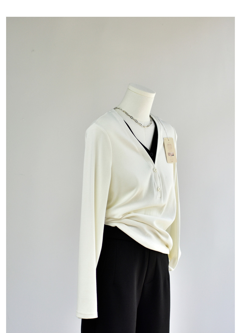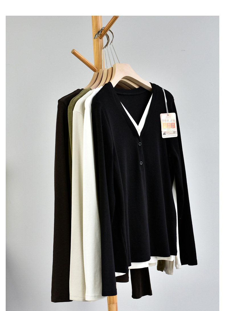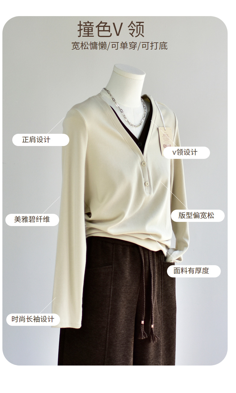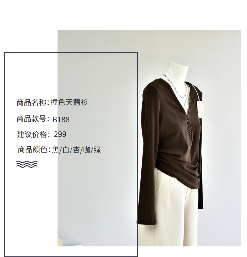 丁摩 【撞色天鹅衫】新款美雅碧棉v领假两件撞色针织开衫打底衫上4ZF-120902