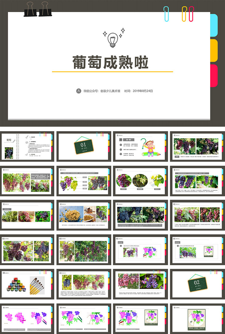 通过图片素材和实物的观察,说一说葡萄的叶子是什么形状的?葡萄的藤蔓有什么特点?葡萄一颗颗的圆形组合在一起又有怎样的空间关系?葡萄的颜色又有哪些呢?试着将自己观察到的用笔画下来,通过简单的形状感受自然中的形态和色彩之美。