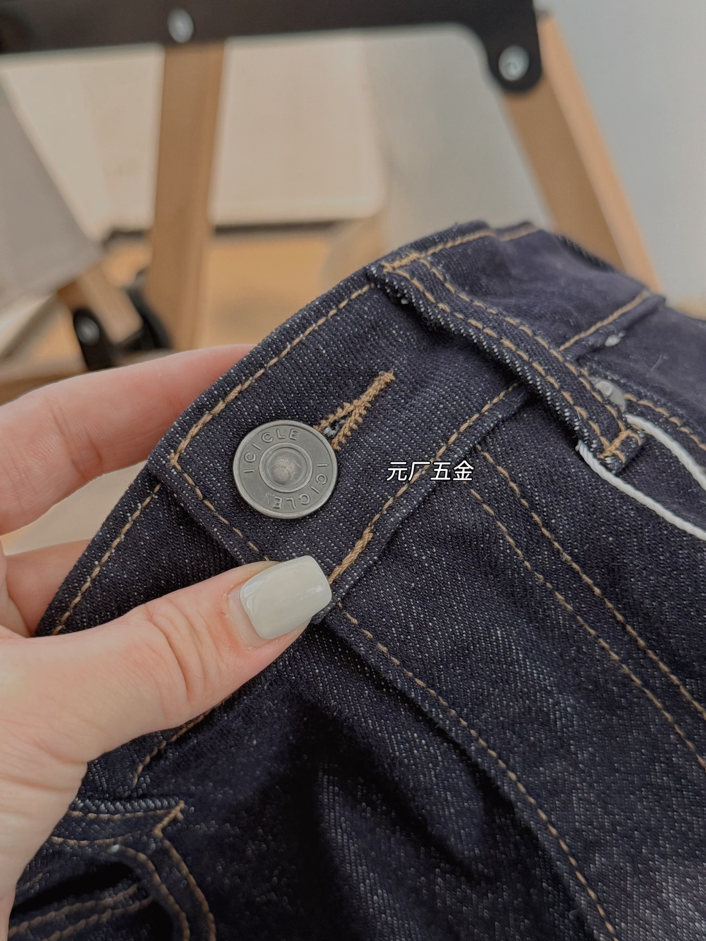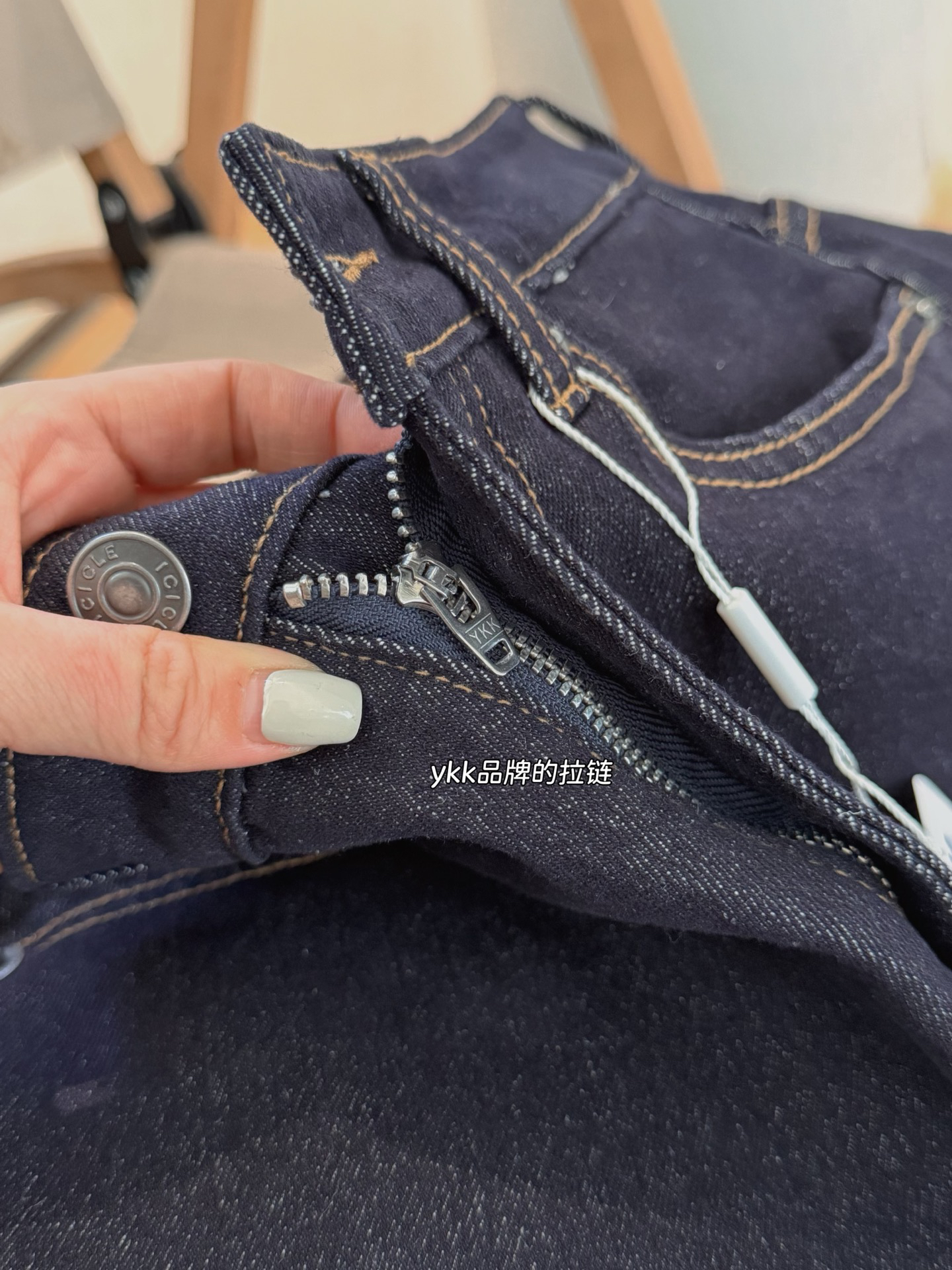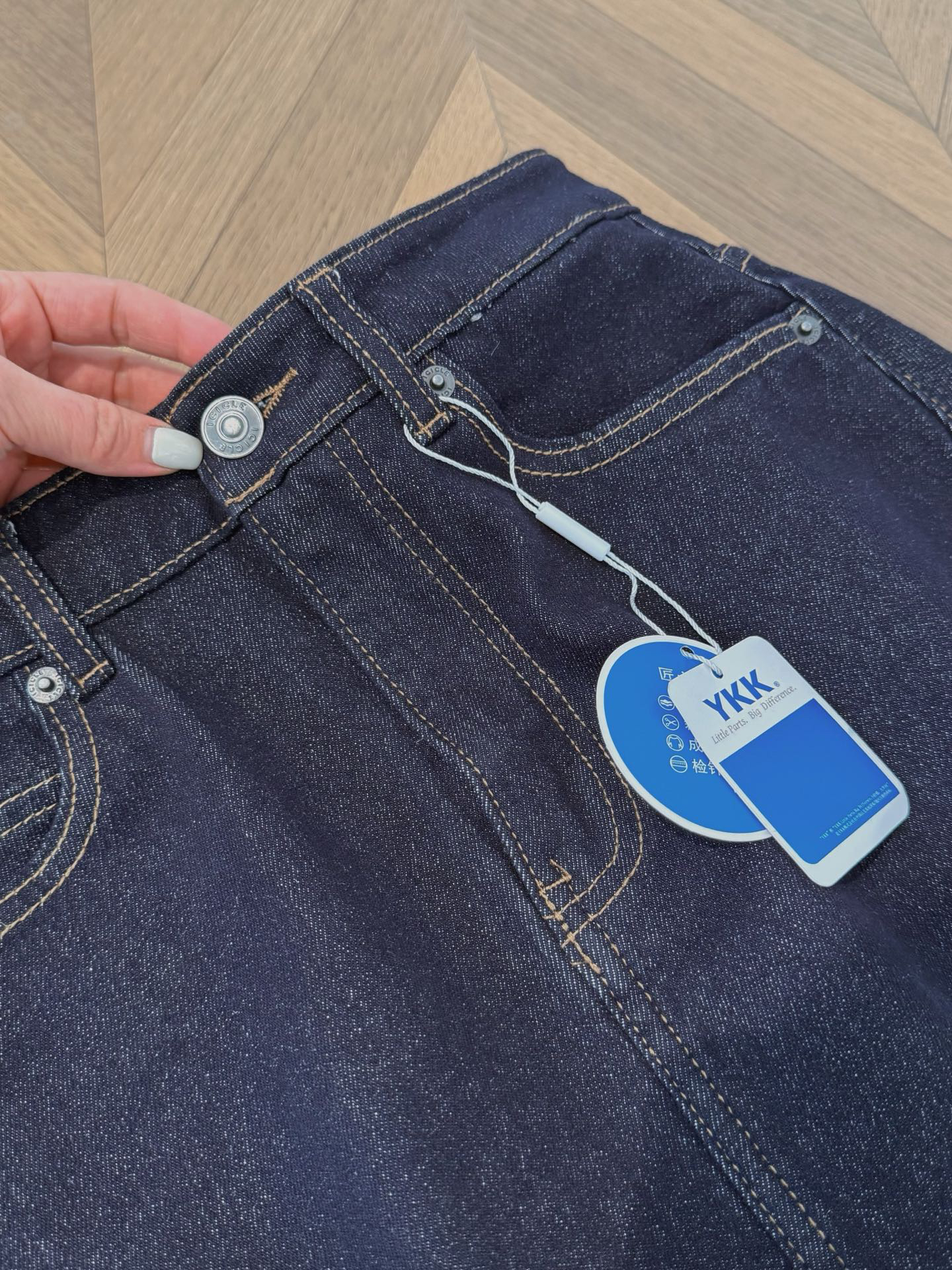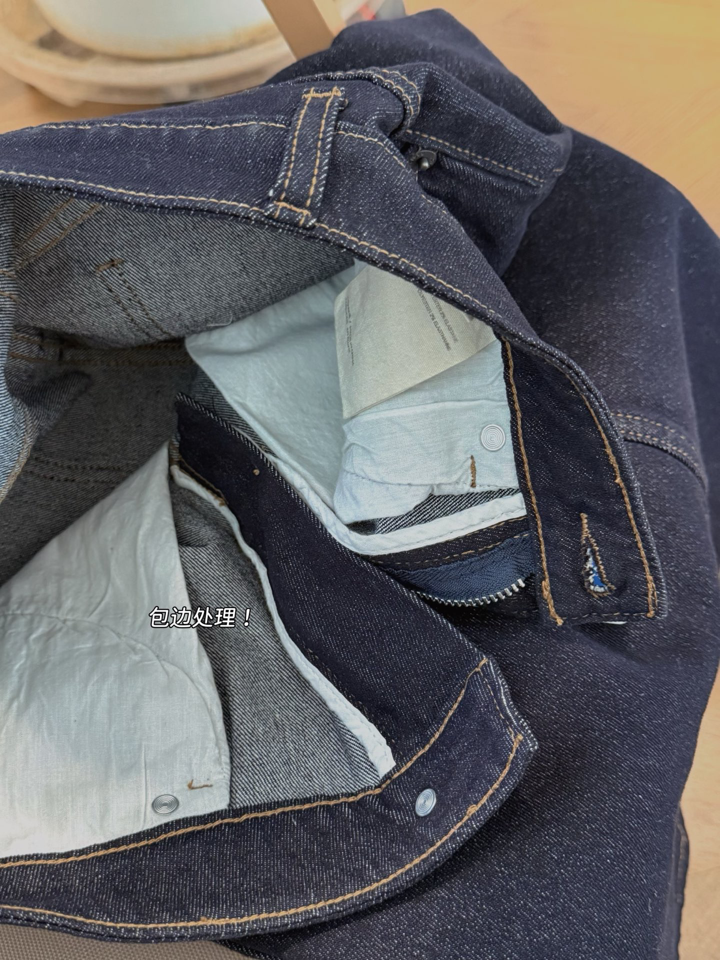 裙身全部双明线辑边,选用英国高士线工艺,棕黄色的线迹与藏青丹宁形成经典撞色!线迹工整 重点位置均有套结加固!