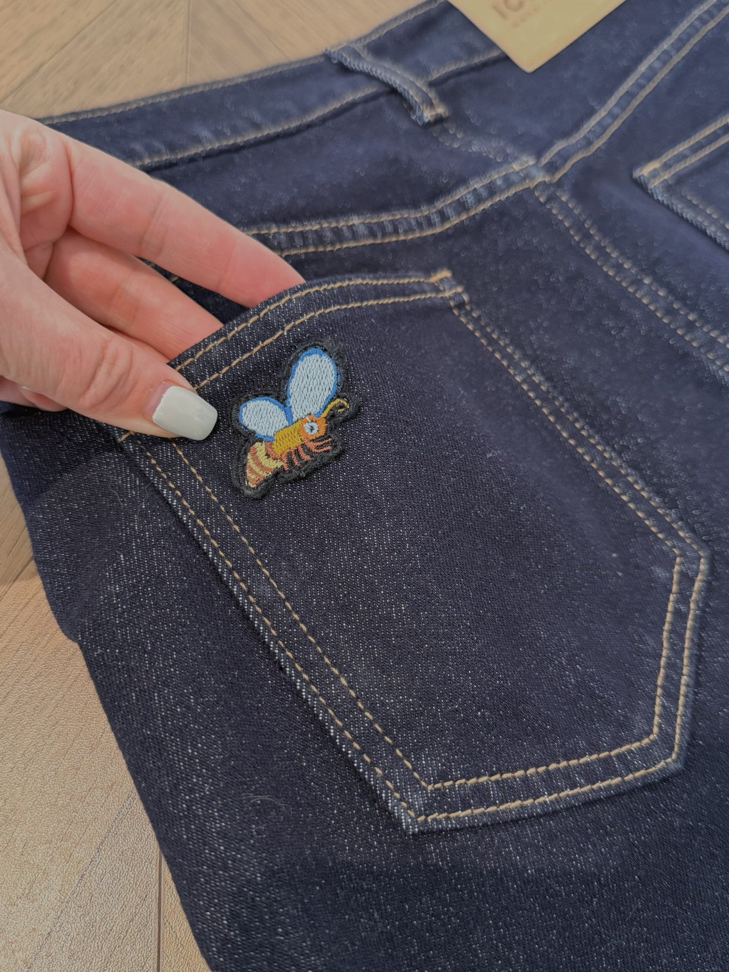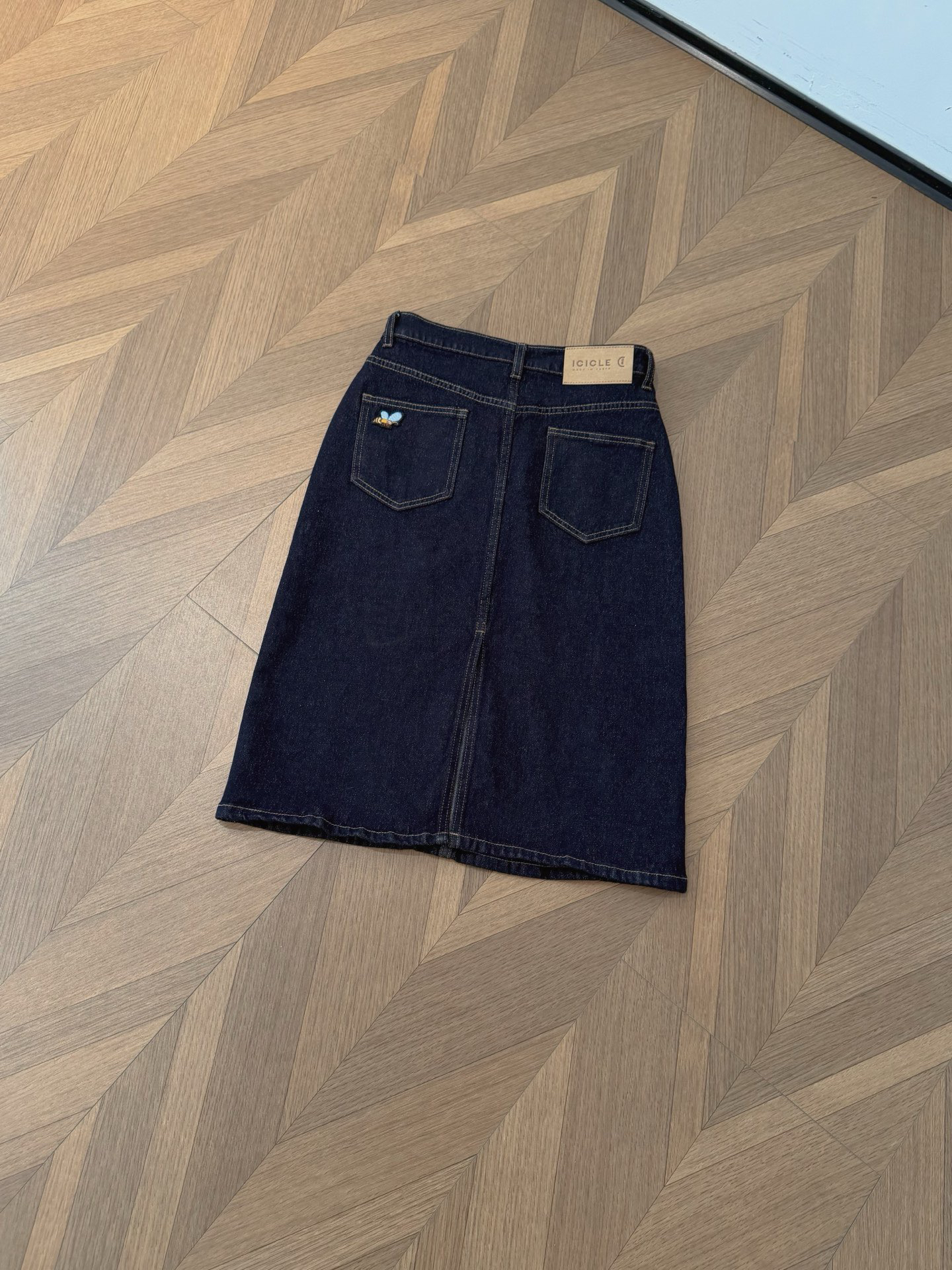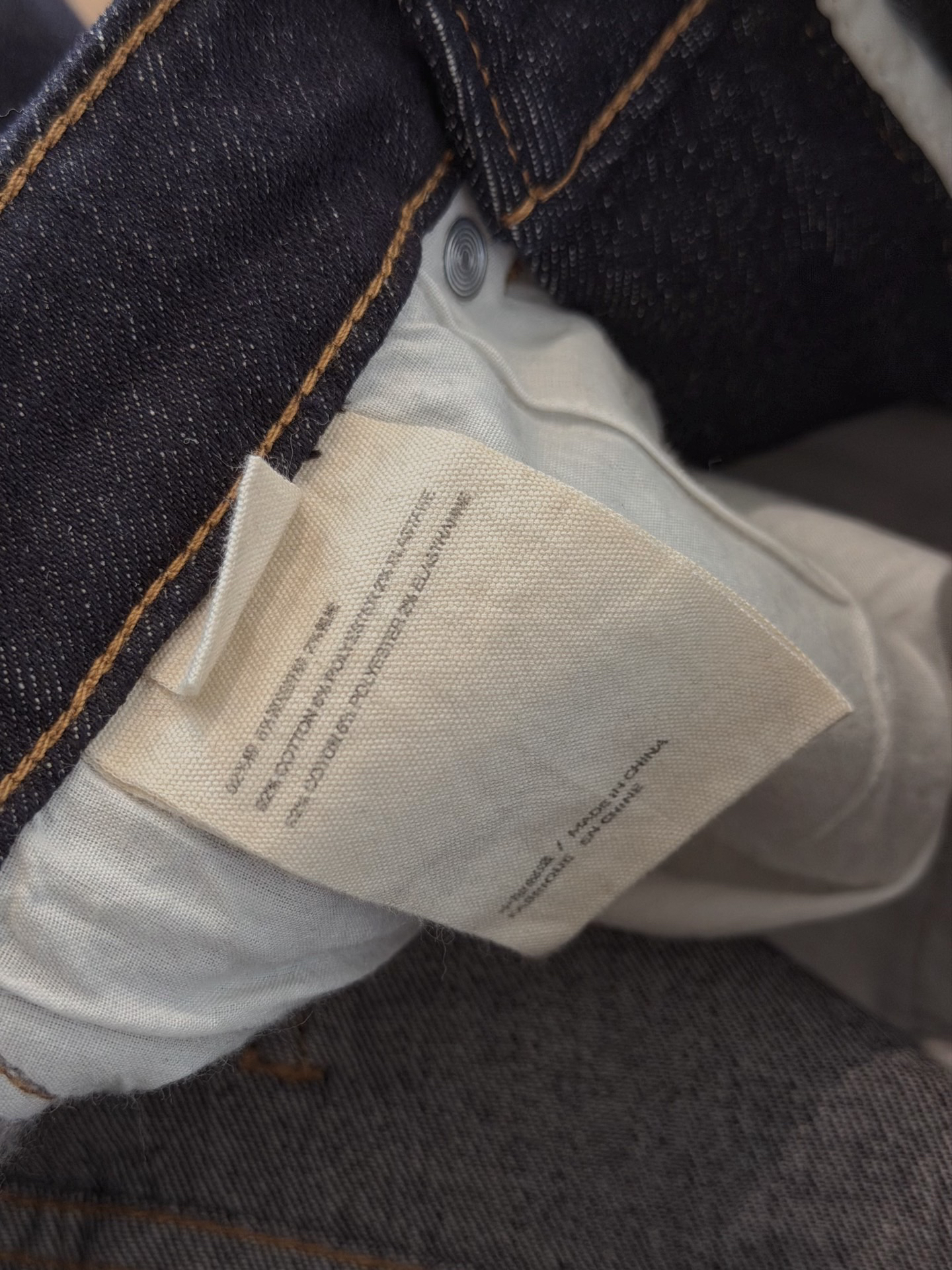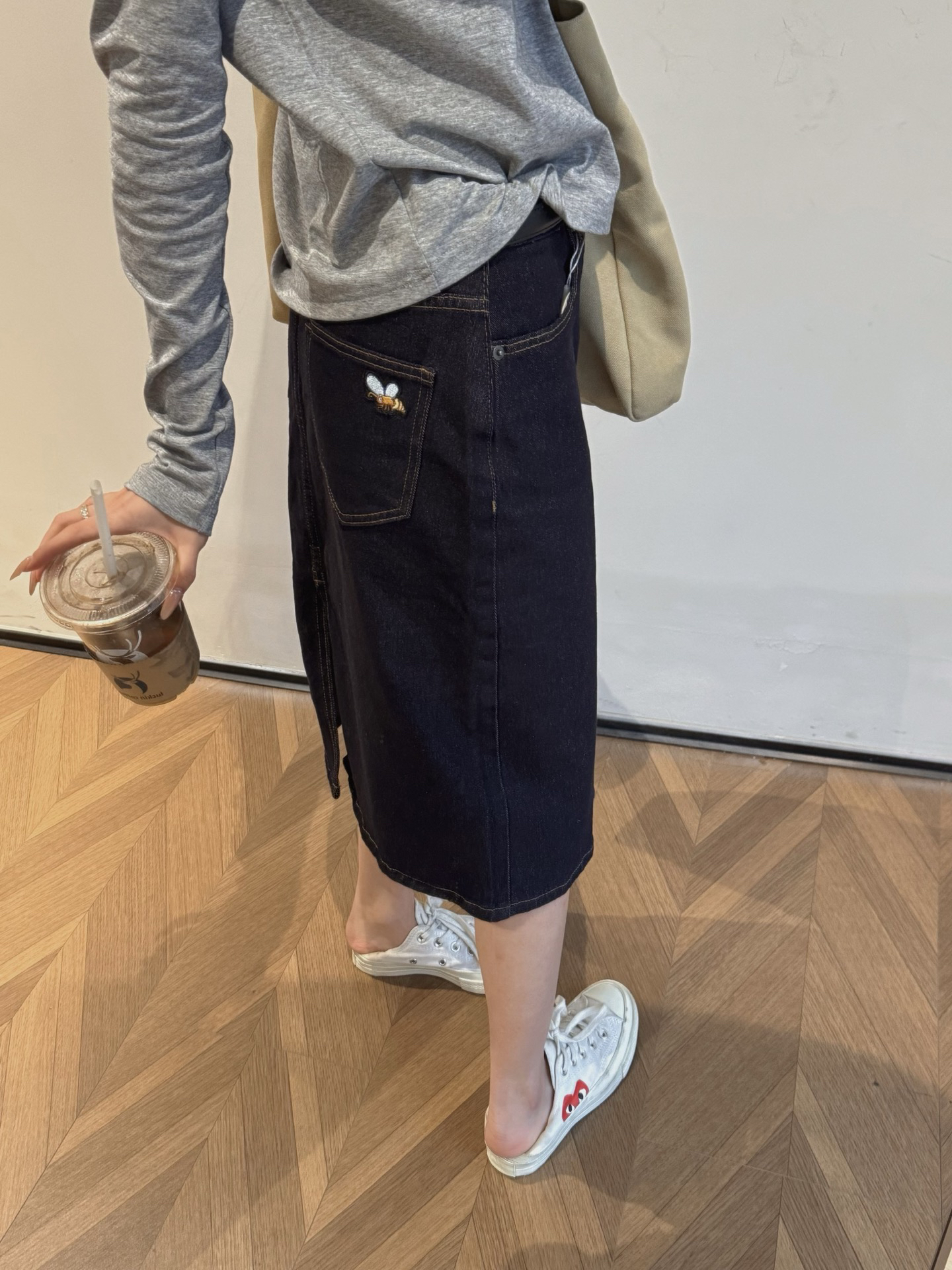 裙身全部双明线辑边,选用英国高士线工艺,棕黄色的线迹与藏青丹宁形成经典撞色!线迹工整 重点位置均有套结加固!