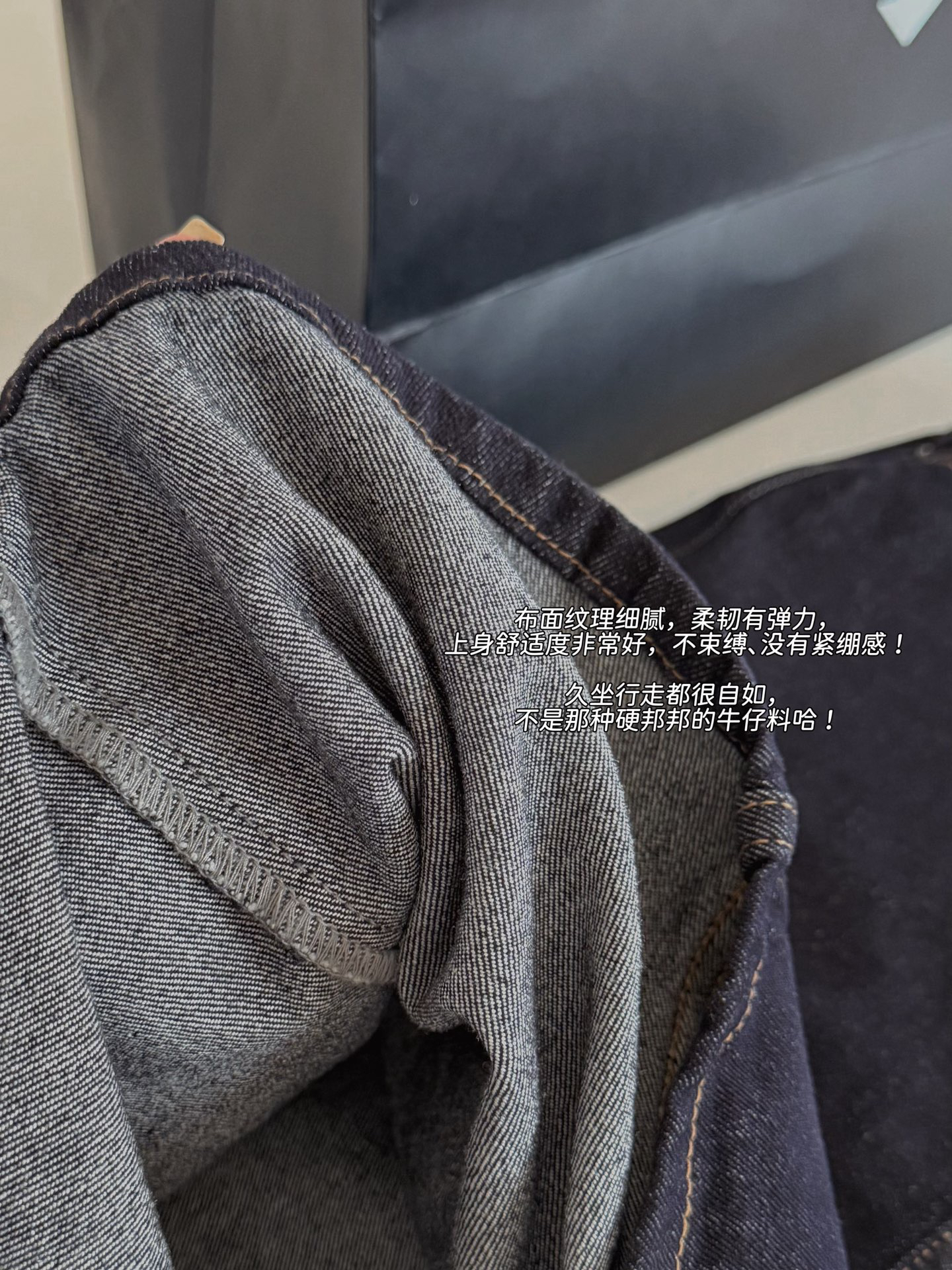 布面纹理细腻,柔韧有弹力,上身舒适度非常好,不束缚、没有紧绷感!久坐行走都很自如,不是那种硬邦邦的牛仔料哈!