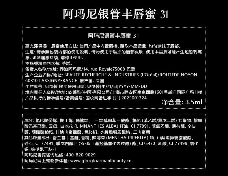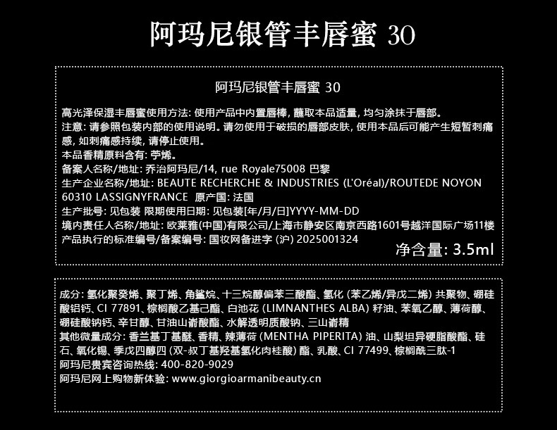 【年终限时大促】【香港直邮】Armani/阿玛尼小冰棒唇釉3.5ml #30 #31 #33 #34
