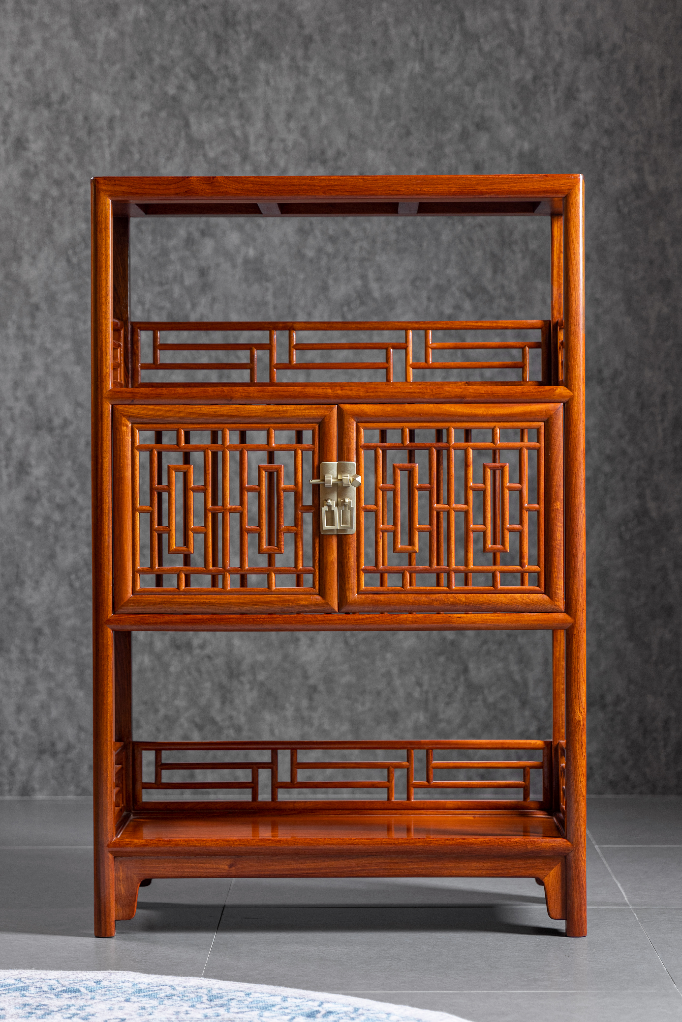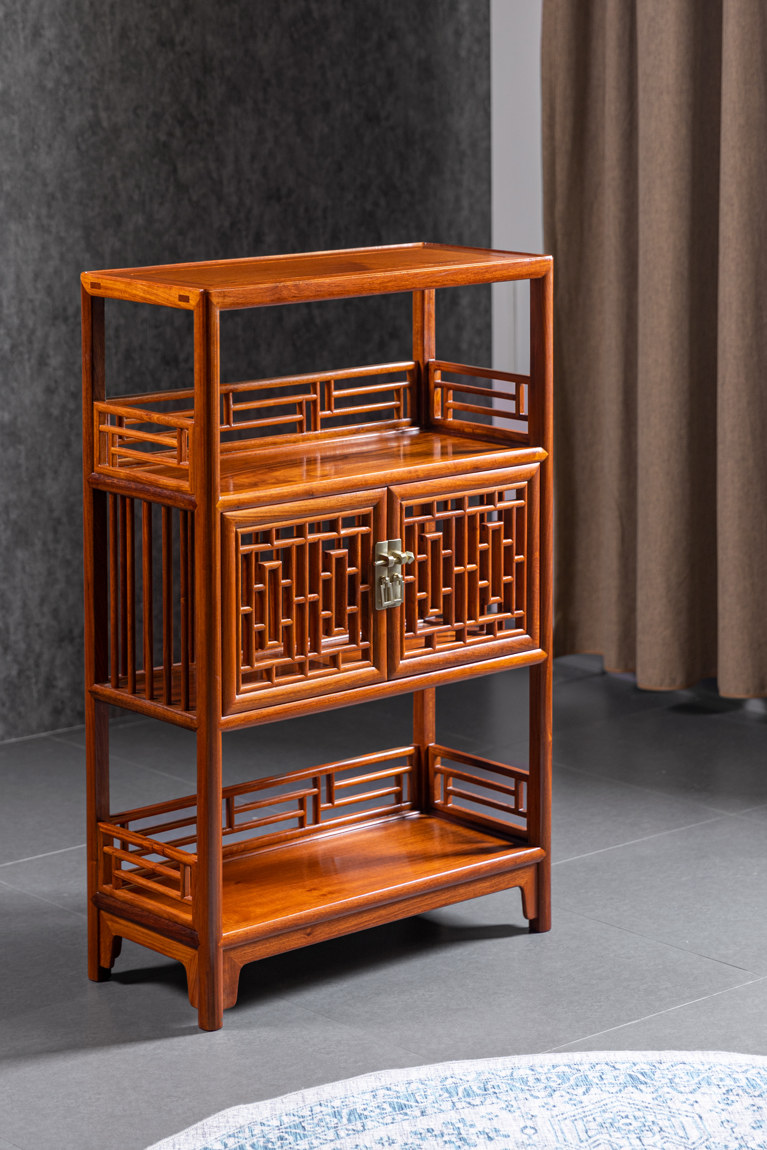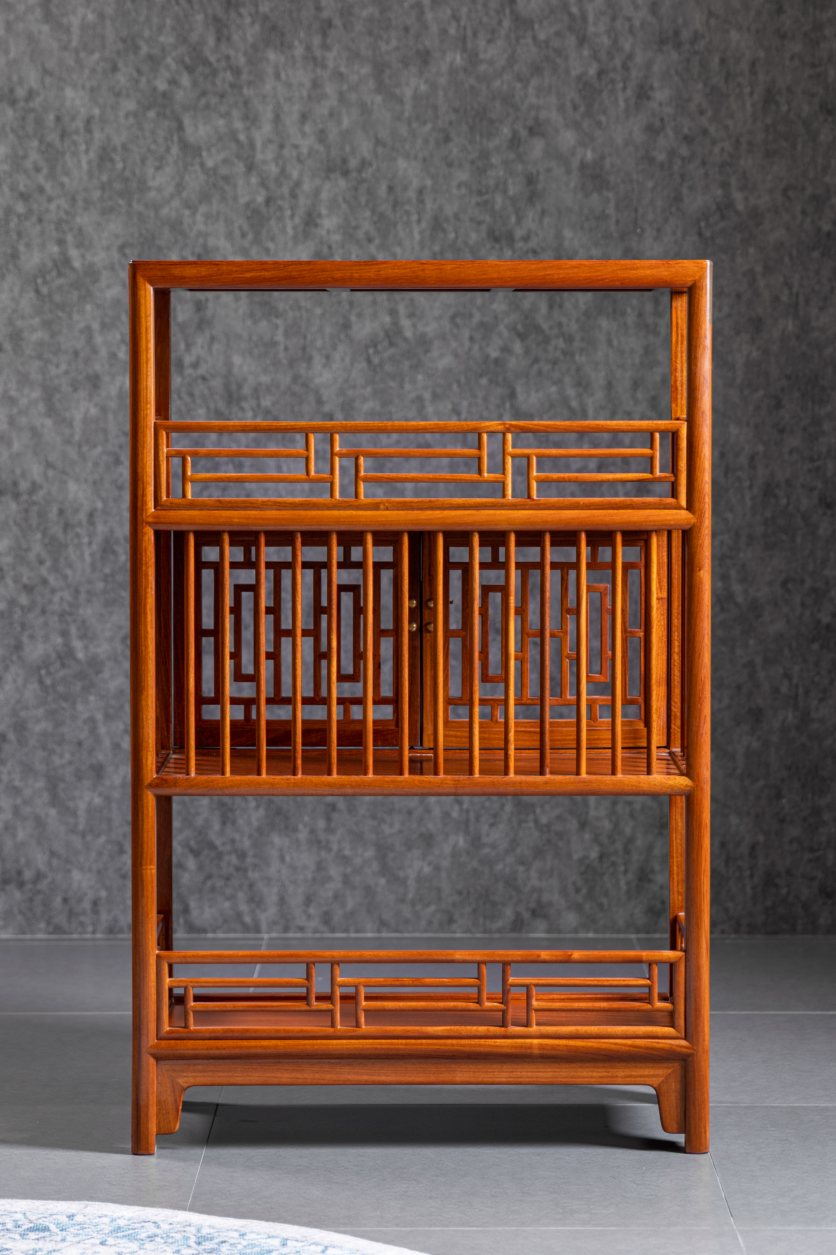 架格用方材共三层,中间一层背面及侧面均装直棂,柜门为近似“步步紧”灯笼框图案的透棂门。