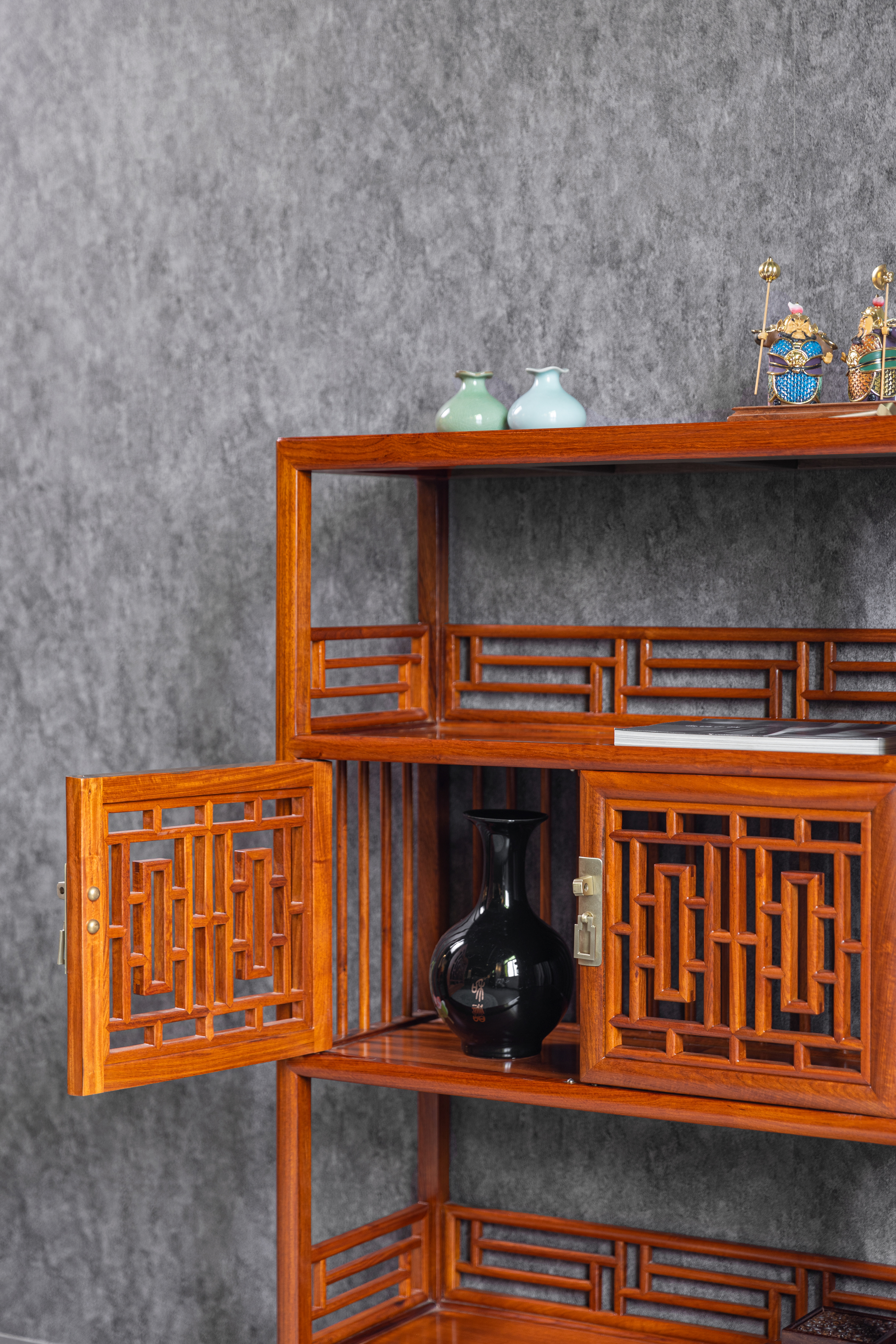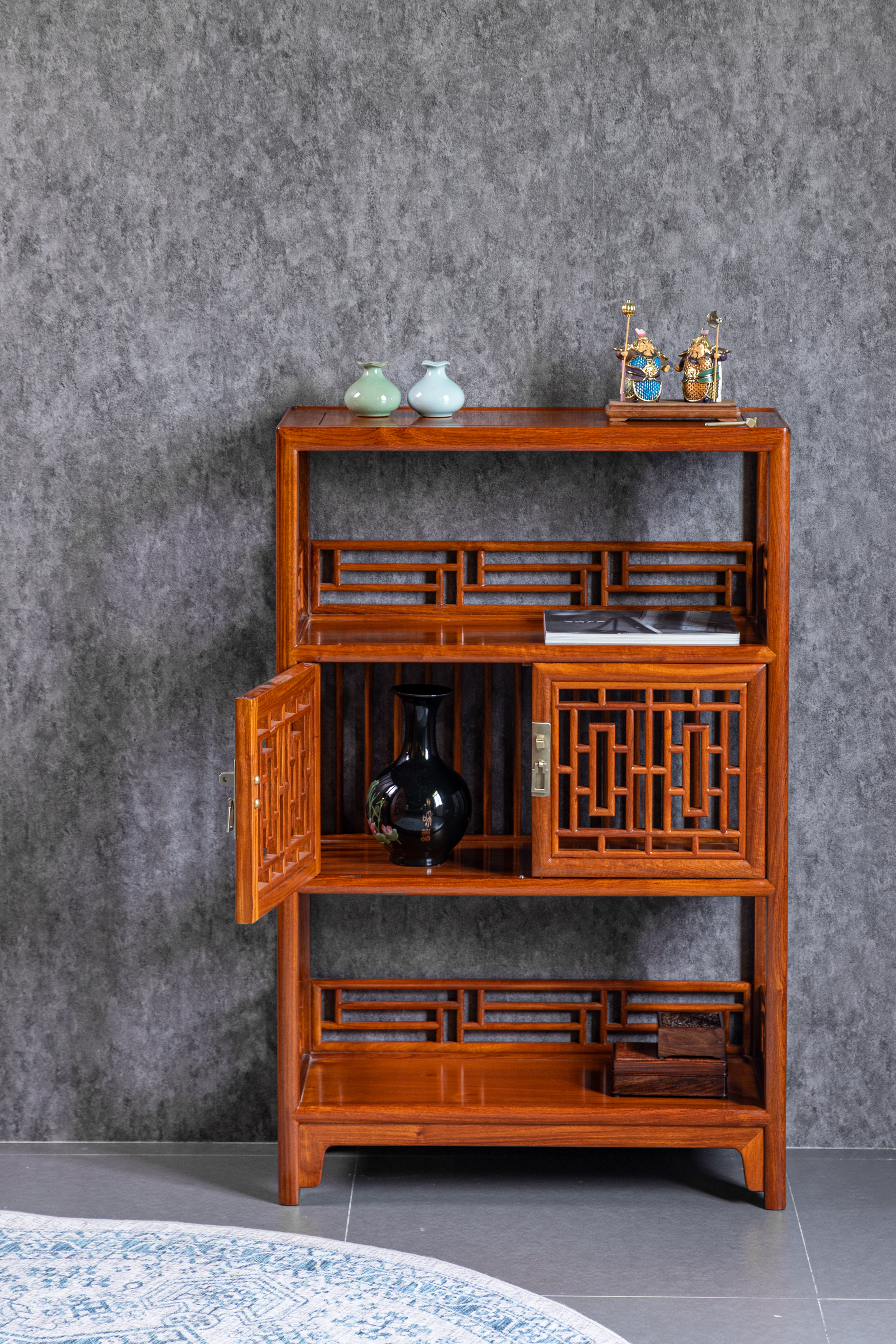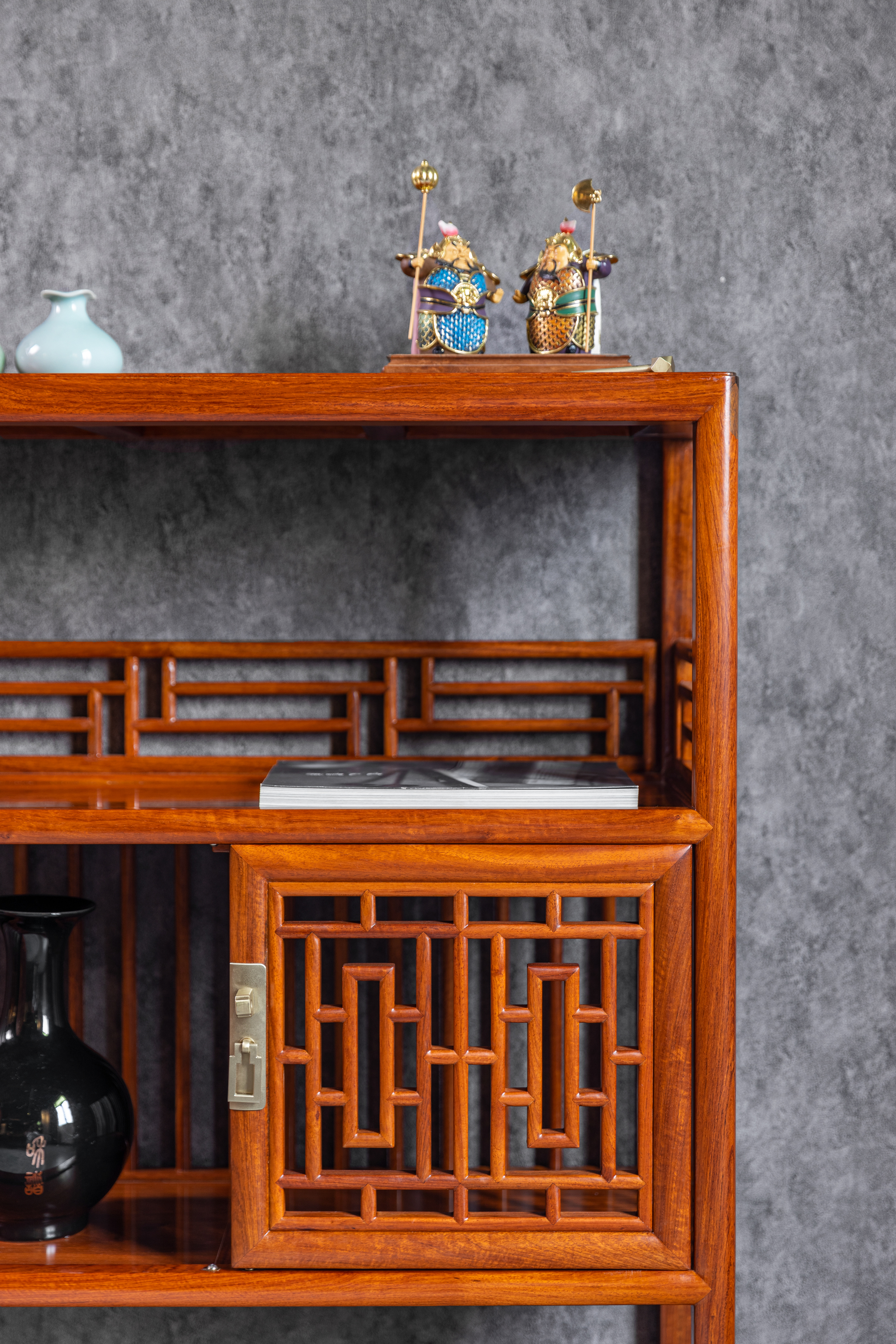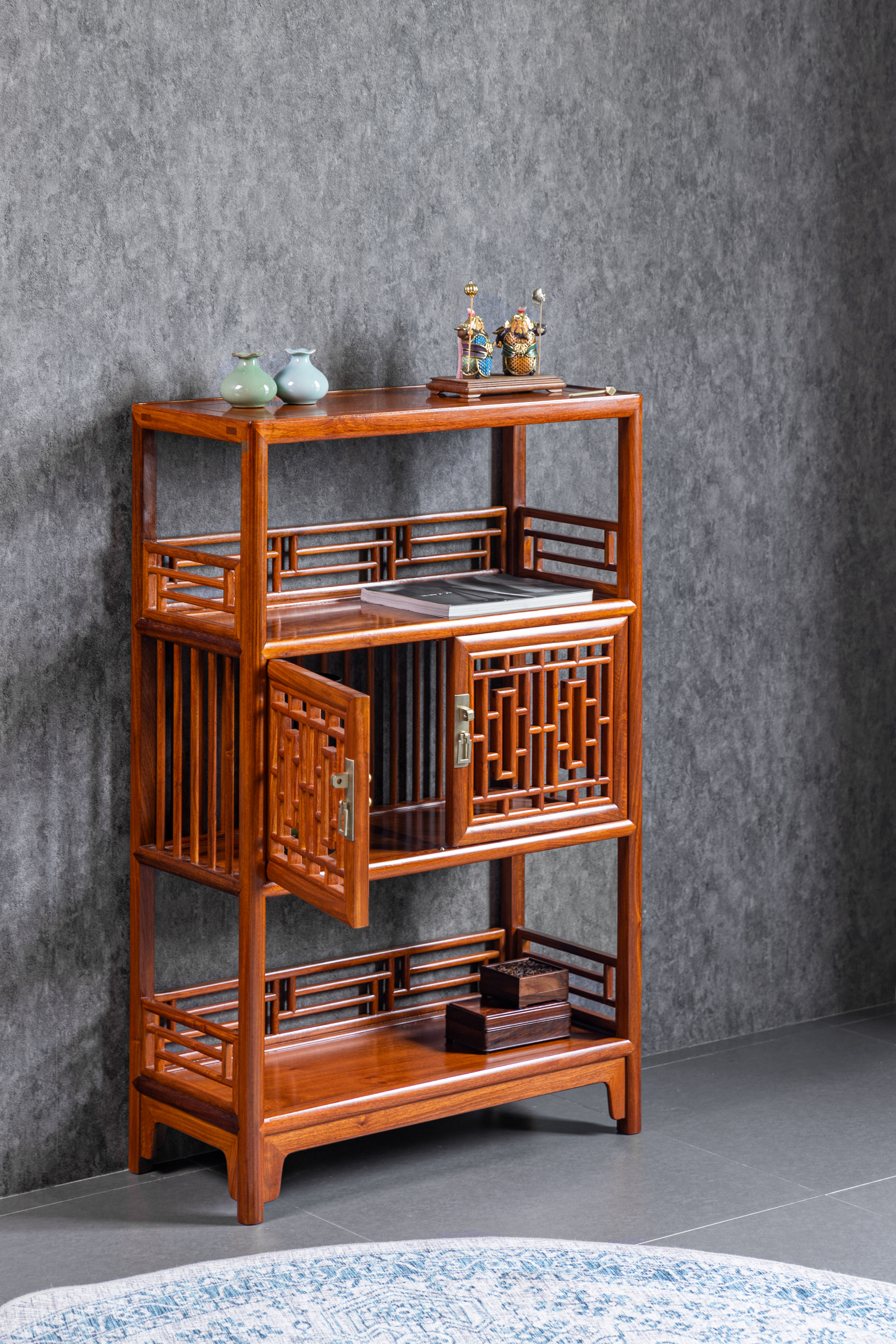 架格用方材共三层,中间一层背面及侧面均装直棂,柜门为近似“步步紧”灯笼框图案的透棂门。
