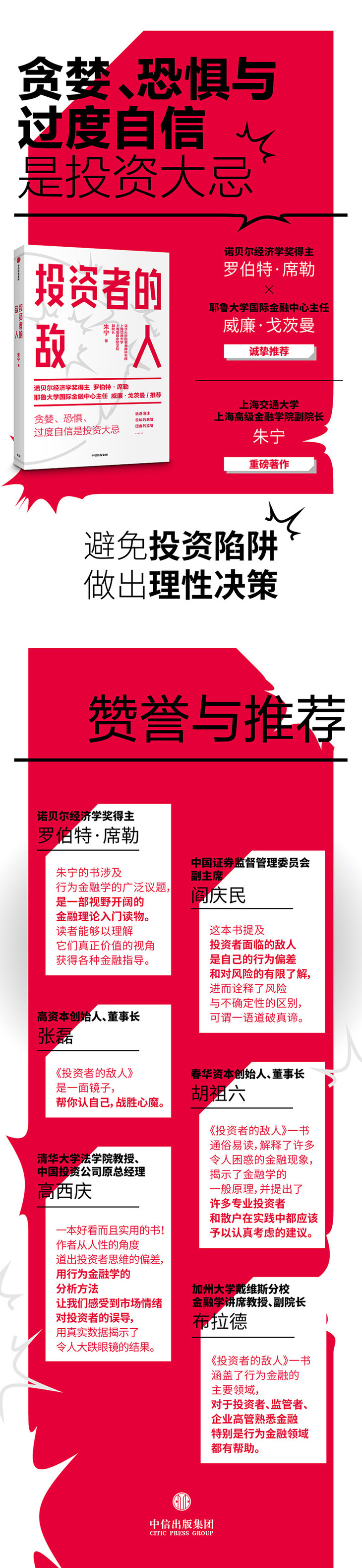 朱宁教授在行为金融领域做出过非常有影响力的开创性研究,揭示了人类金融决策中普遍存在的行为偏差。他的《投资者的敌人》一书涵盖了行为金融的主要领域,对于投资者、监管者、企业高管熟悉金融特别是行为金融领域都有帮助。