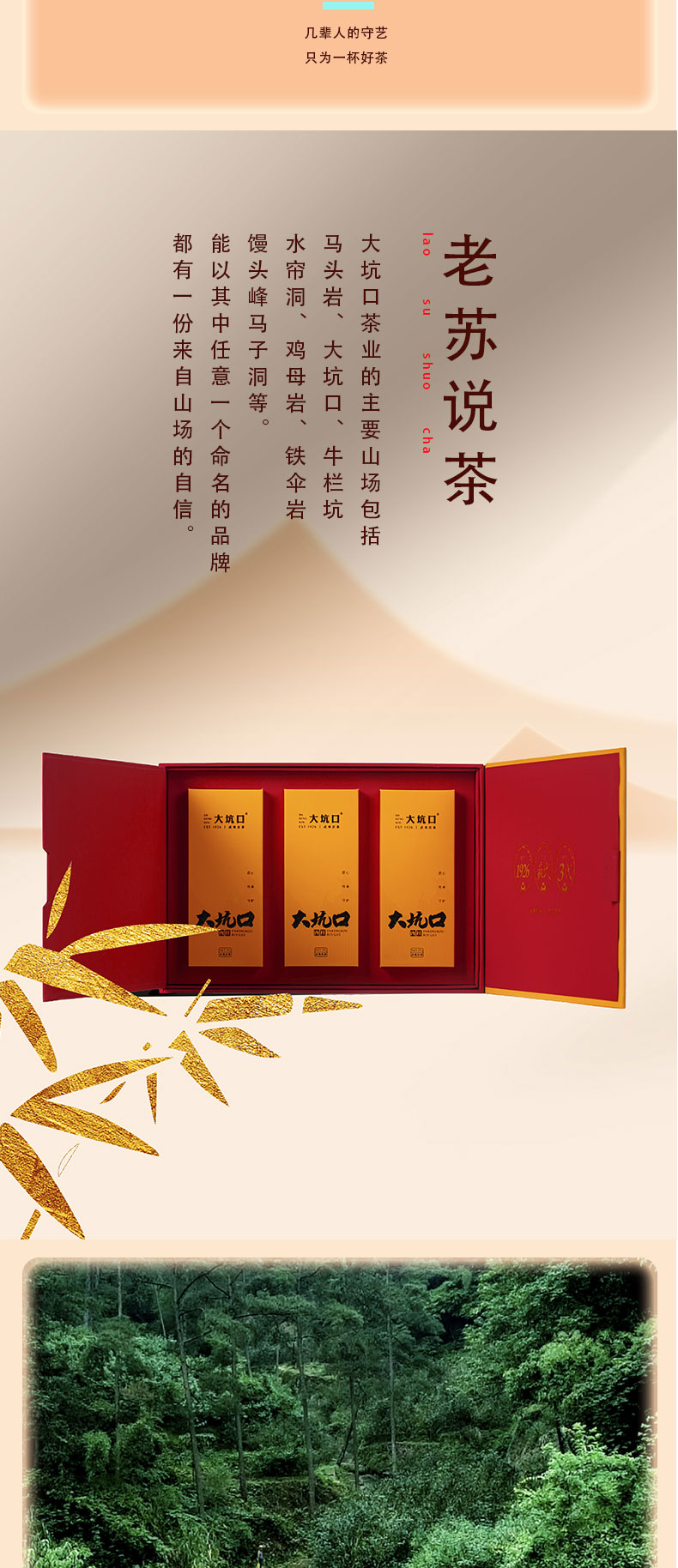 大坑口岩茶有限公司,位于武夷山市-天心村,茶山分布于正岩产区的“三坑、两涧”,由首批非物质文化遗产武夷岩茶制作技艺传承人:苏炳溪和第二批传承人:苏德发先生的精心手工制作,造就了大坑口岩茶的独特品质
