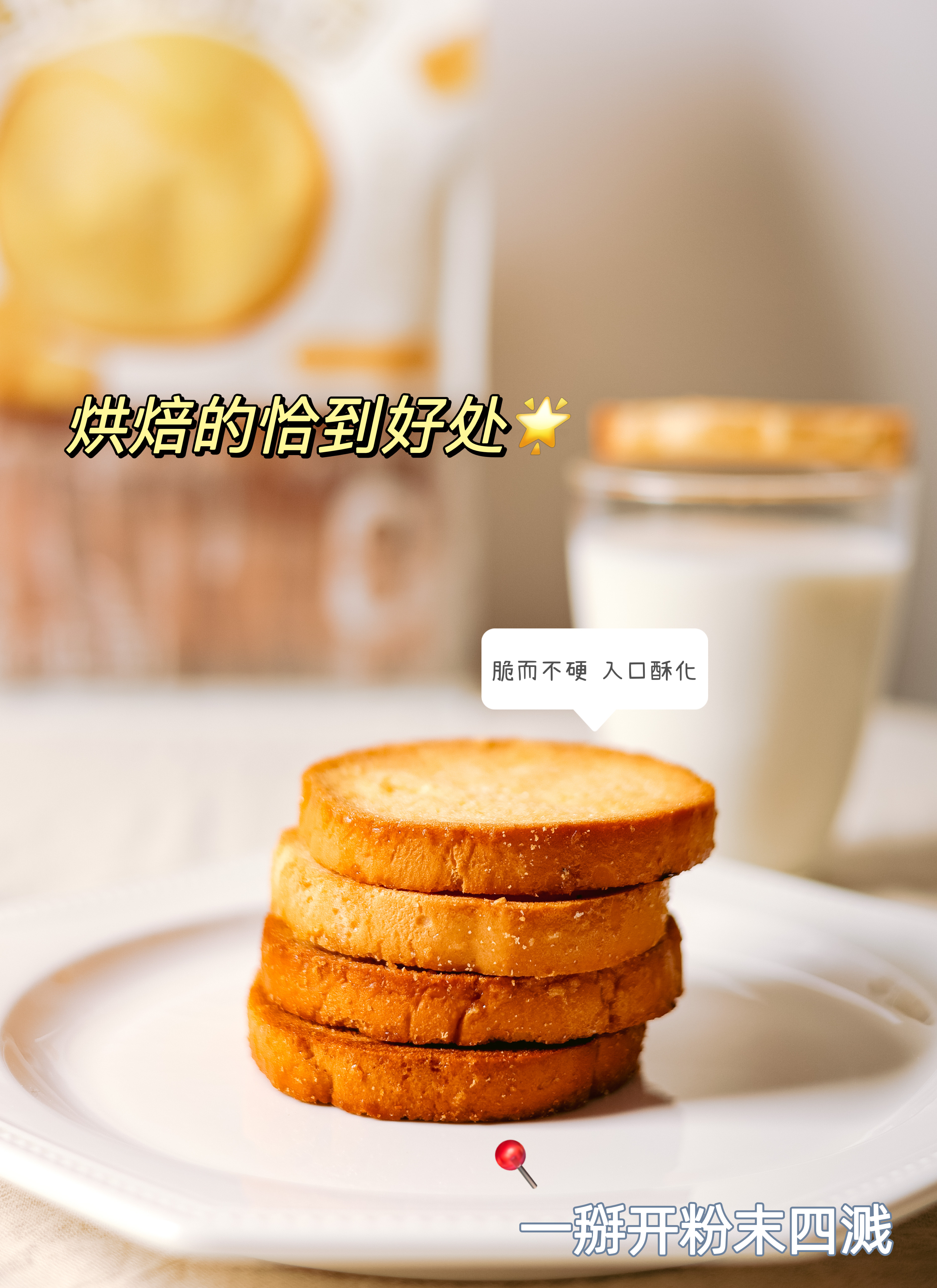 烤得焦黄的脆吐司,黄油的奶香醇正浓郁,融入到小麦原本的谷香之中,不是单纯的甜,口感丰富妙不可言。咬一口,能发出“咔滋咔滋”的声音,烘焙得恰到好处,脆而不硬,入口酥化,一掰开粉末四溅,别提多满足啦🤩