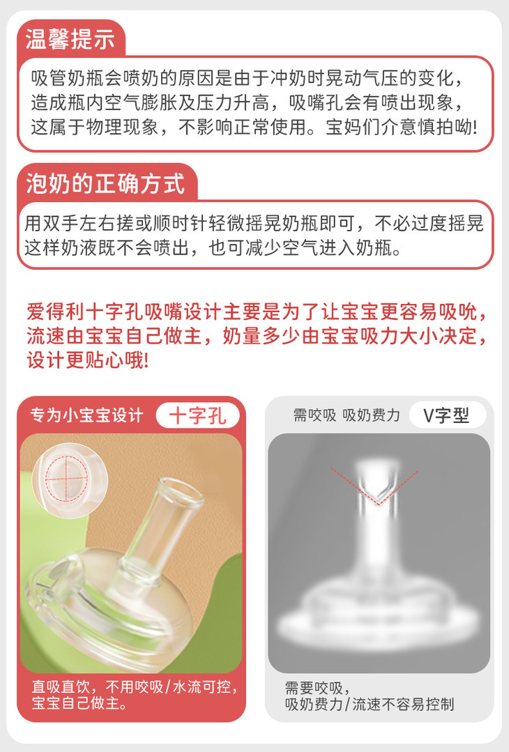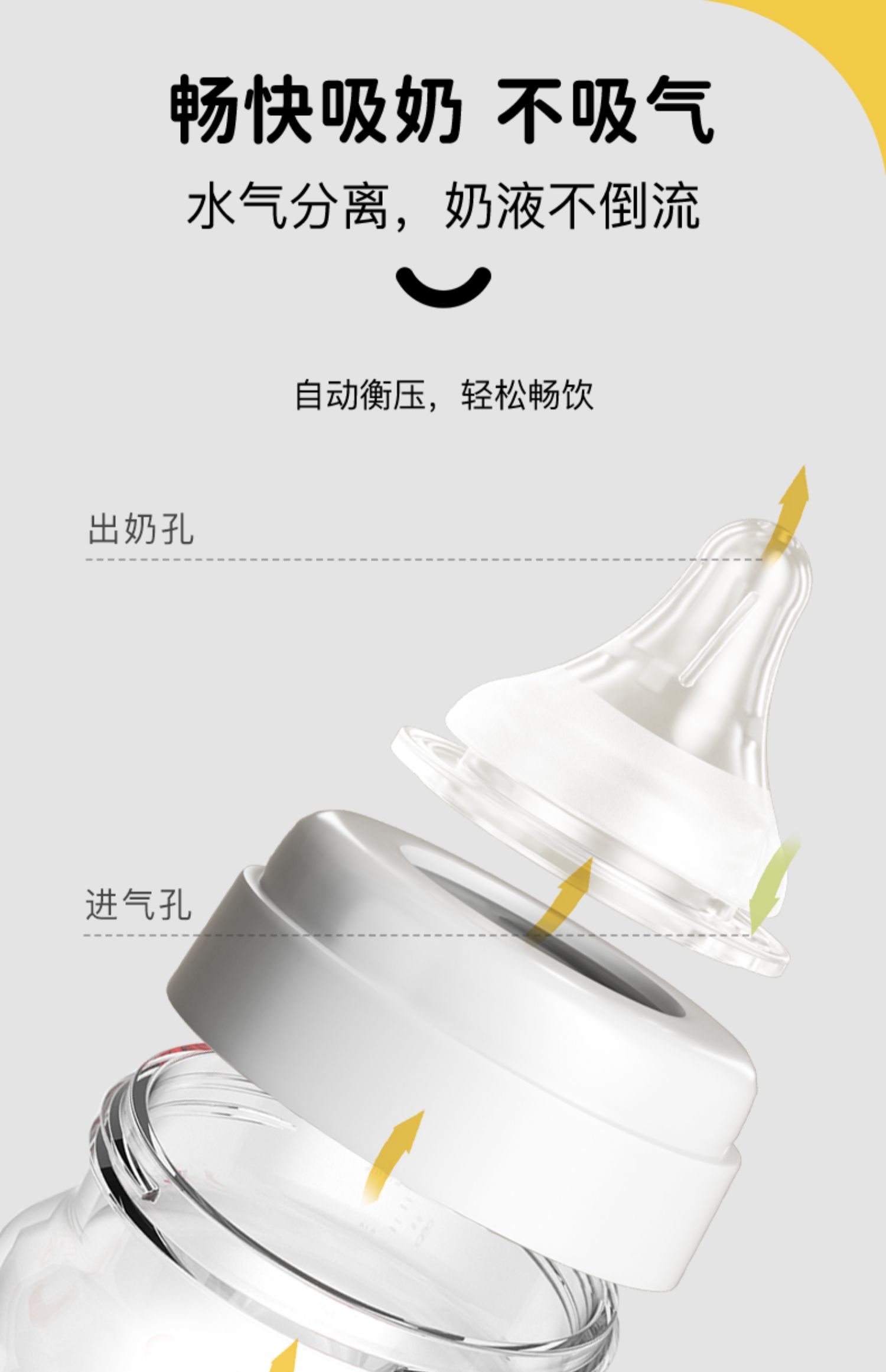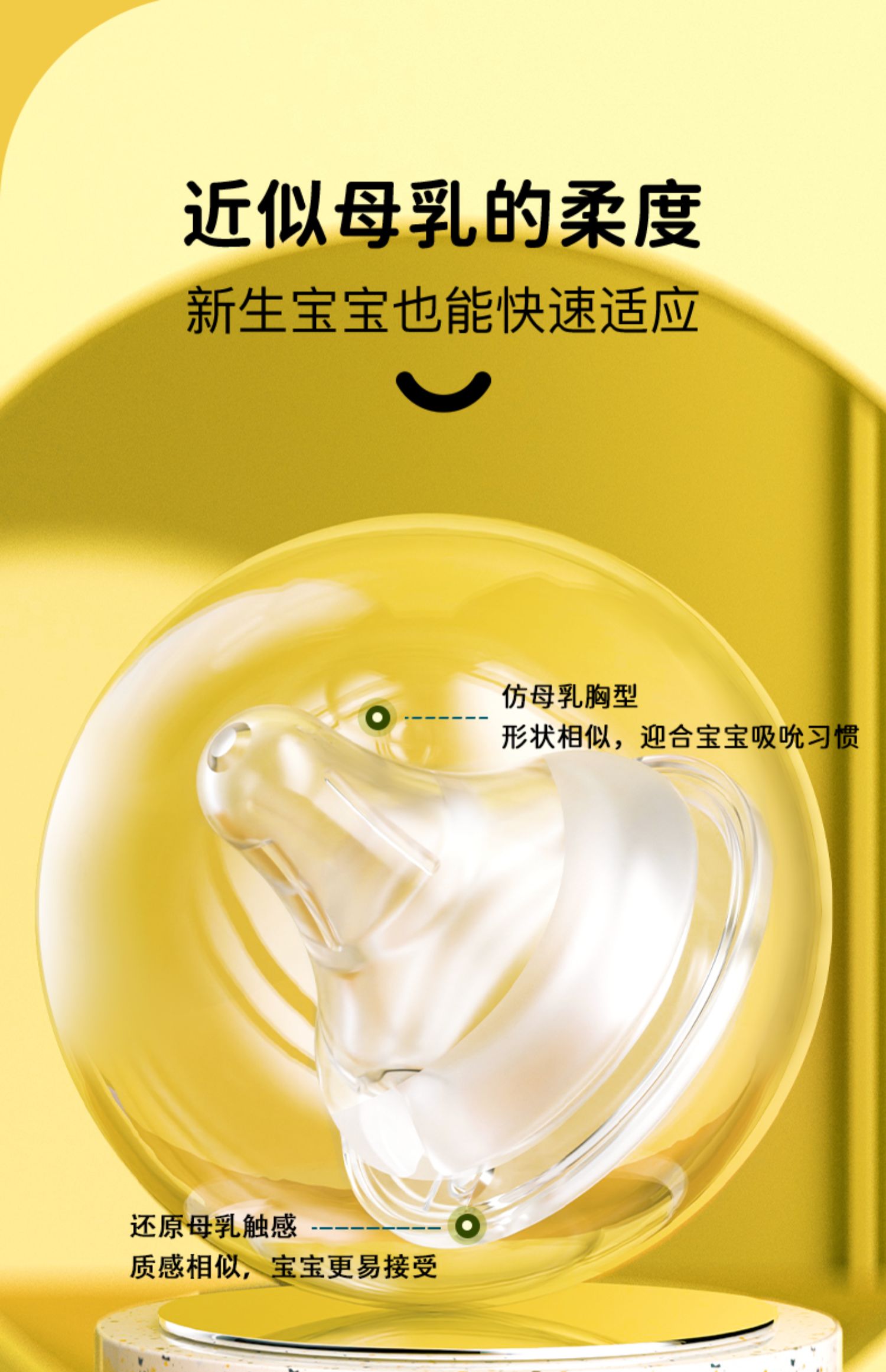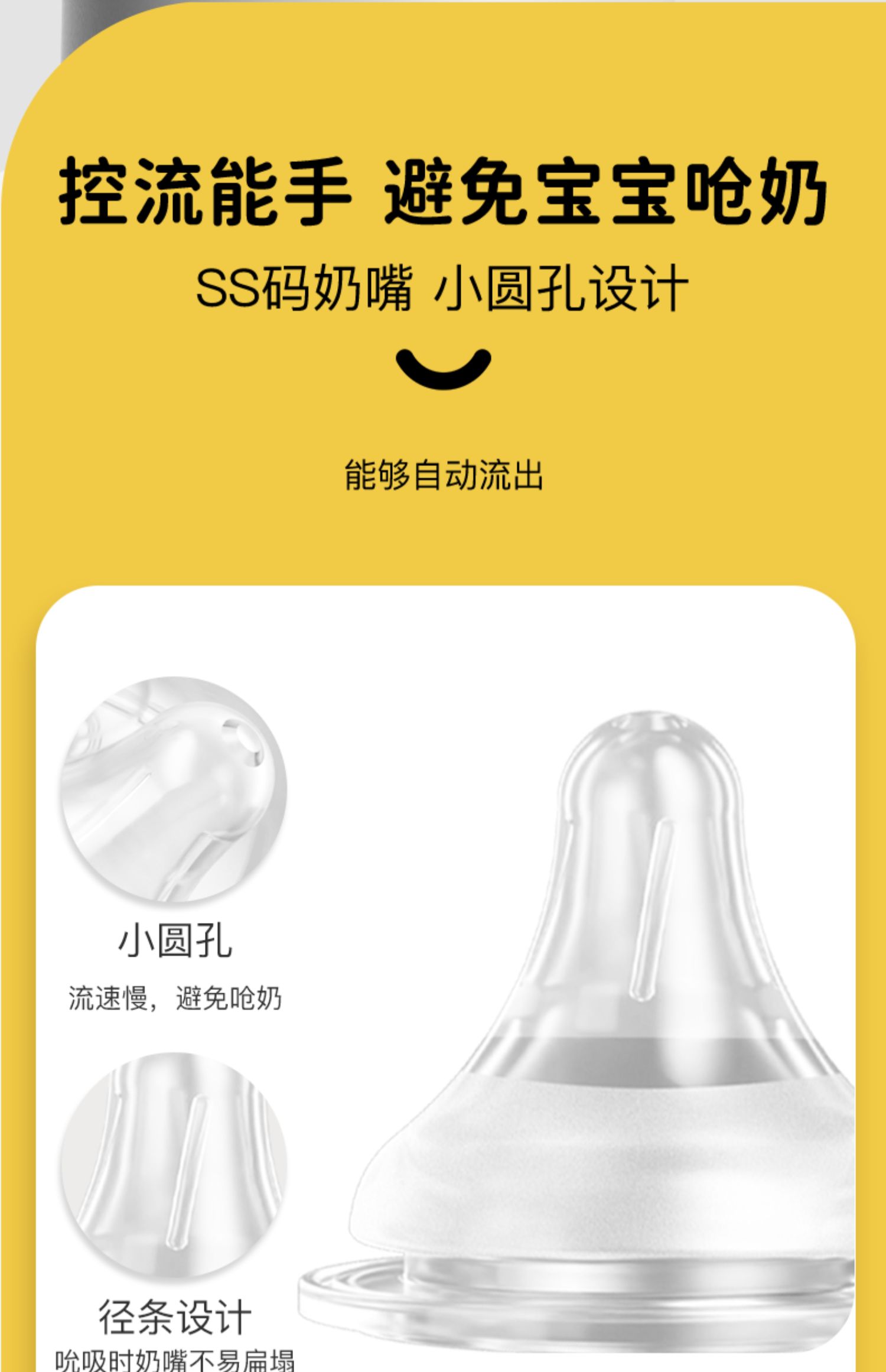 奶嘴柔软,食品级硅胶,透气阀设计,有一定防呛效果