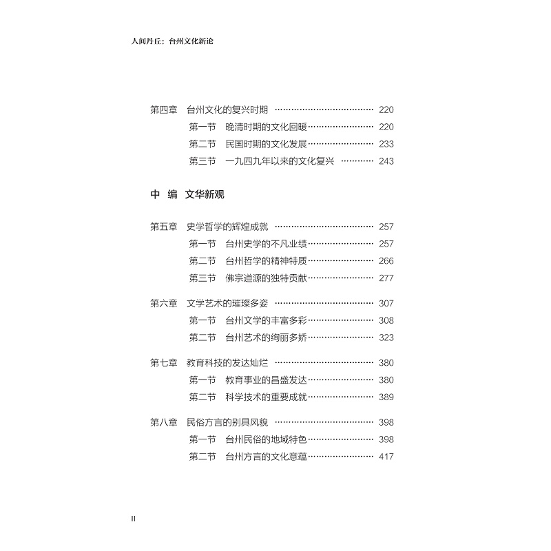 本书系我社《台州文化新论》(2020年版)之增订版。本书系统梳理了台州文化研究的最新成果,从中华文化与地域文化的关系着眼,将台州文化置于中国地域文化的谱系中,分析其区域背景、演进理路和基本特性。其中,上编“文脉新释”,着眼于从历时性方面梳理台州文脉;中编“文化新观”,着眼于从共时性方面彰显台州文化;下编“文韵新析”,着眼从综合性方面呈现台州文韵。本书以总分结合、纵横交织的策略,力图多层次、多维度地展现台州文化及其风貌,进一步挖掘其精神魅力,阐扬其时代价值。 本书吸收学界最新研究成果,全面梳理台州文化的区域背景、演进历程,系统分析台州文化的辉煌成就、独特价值,细致探讨台州文化的主要类型、基本精神,综合把握台州文化的未来发展与传播。相信本书的出版,在对外传播台州魅力、提升台州知名度、宣传台州文化,对内向广大市民普及台州地方人文历史、提升市民的人文社科素养、增强全市人民的地方文化认同等方面都具有重要的意义。