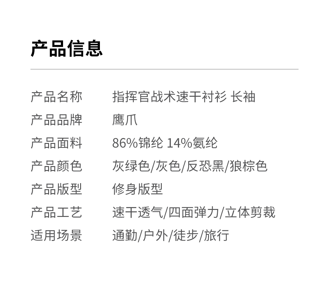 【战术版型 四面弹力 速干透气】鹰爪指挥官速干衬衫长袖