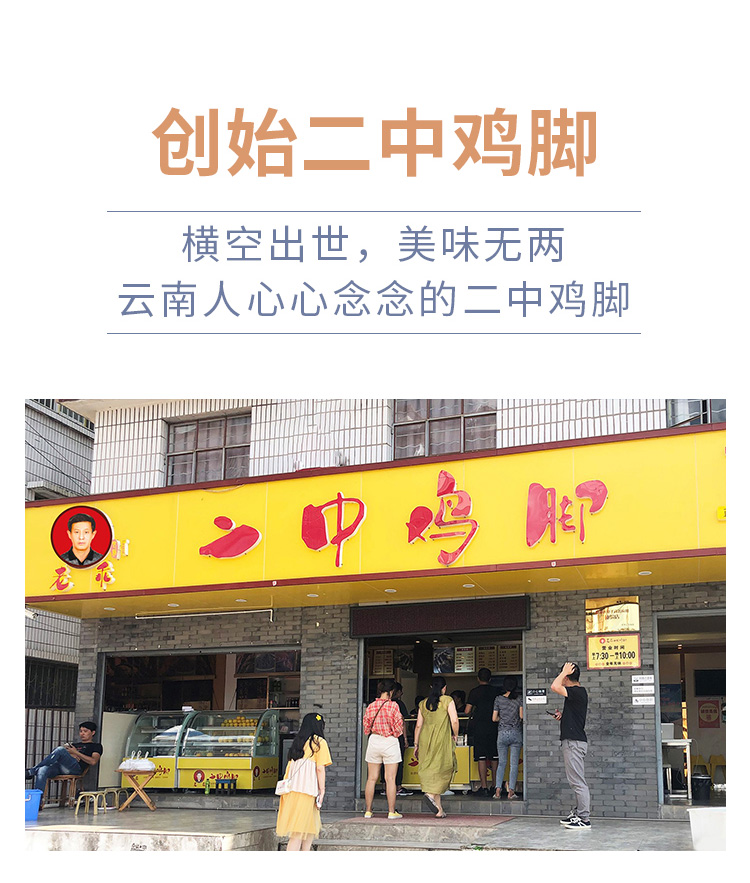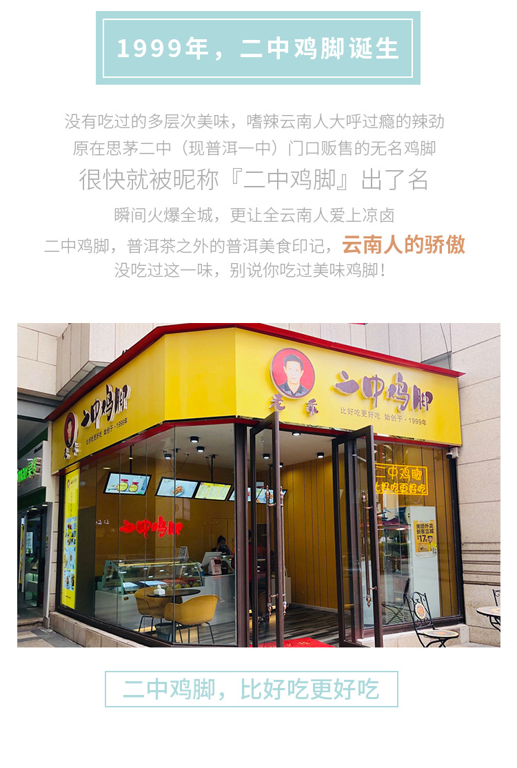 - “二中鸡脚’’是云南普洱的苏建云&金建华夫妇于1999年在思茅二中(现普洱一中)门口售卖自家精心制作的私房鸡脚,因为美味独特让人食指大动而名声大噪,从而得名“二中鸡脚”(意为二中门口售卖的鸡脚)