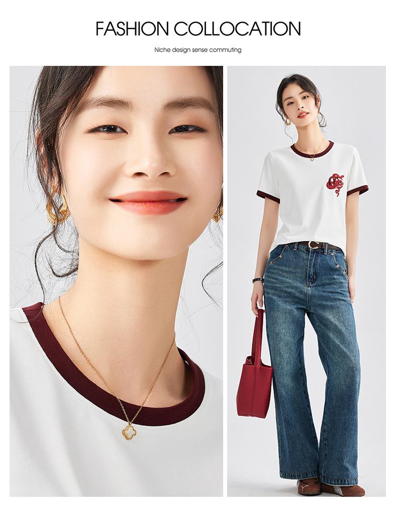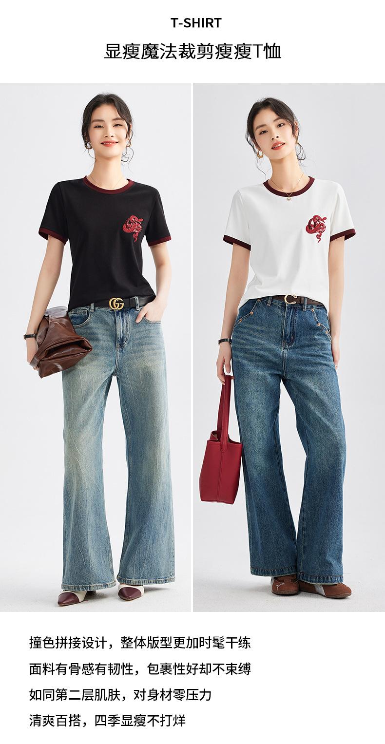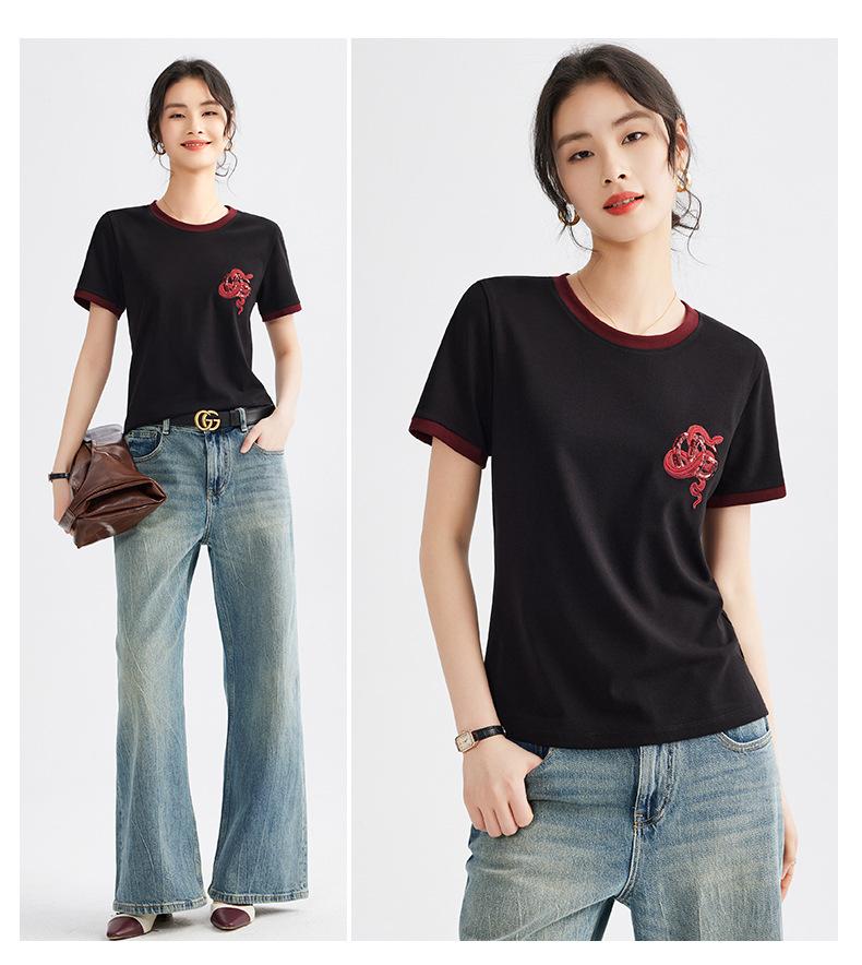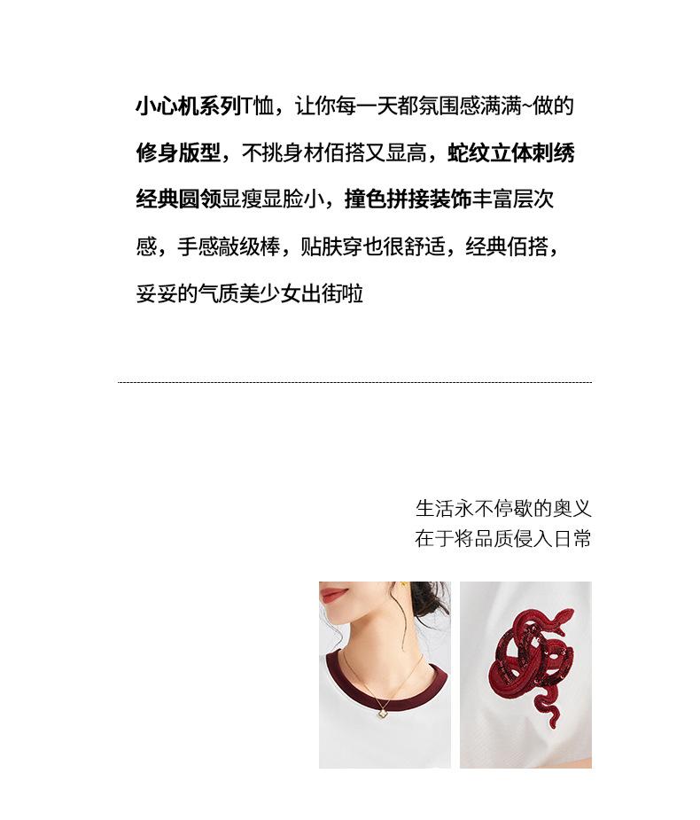 【自】全新升级【铂金会员100/天猫129/差价29】(01853) 洛诗琳2025早春款蛇年刺绣T恤衫女时尚撞色圆领上衣