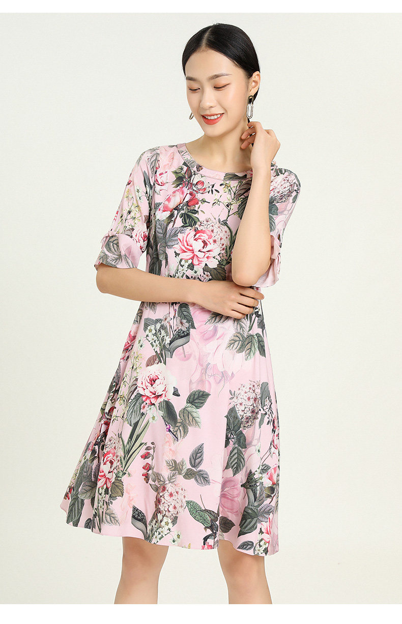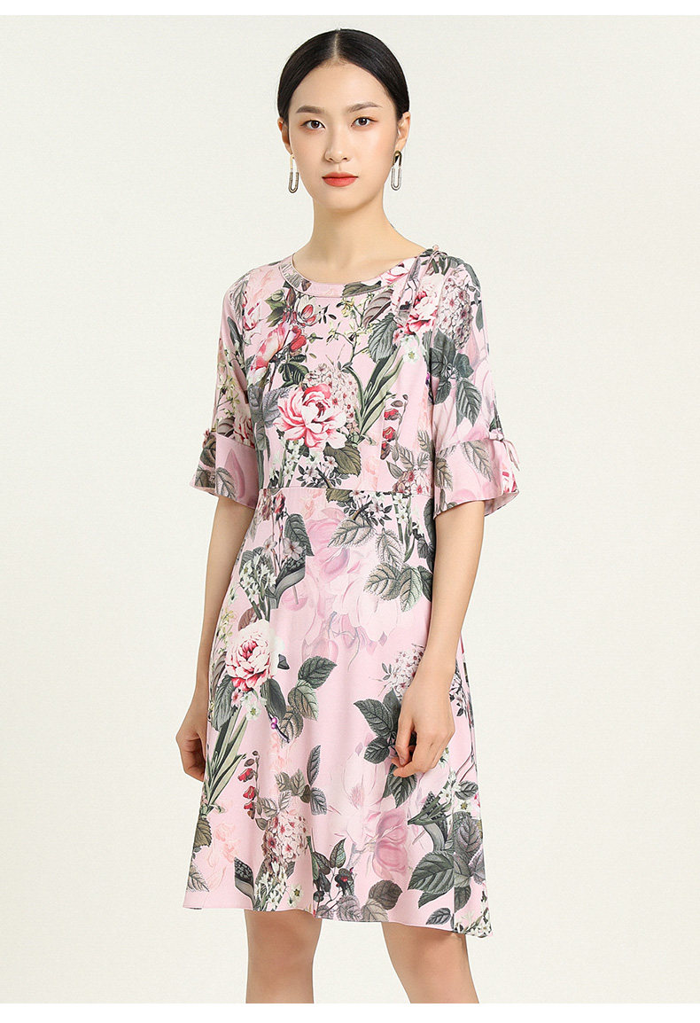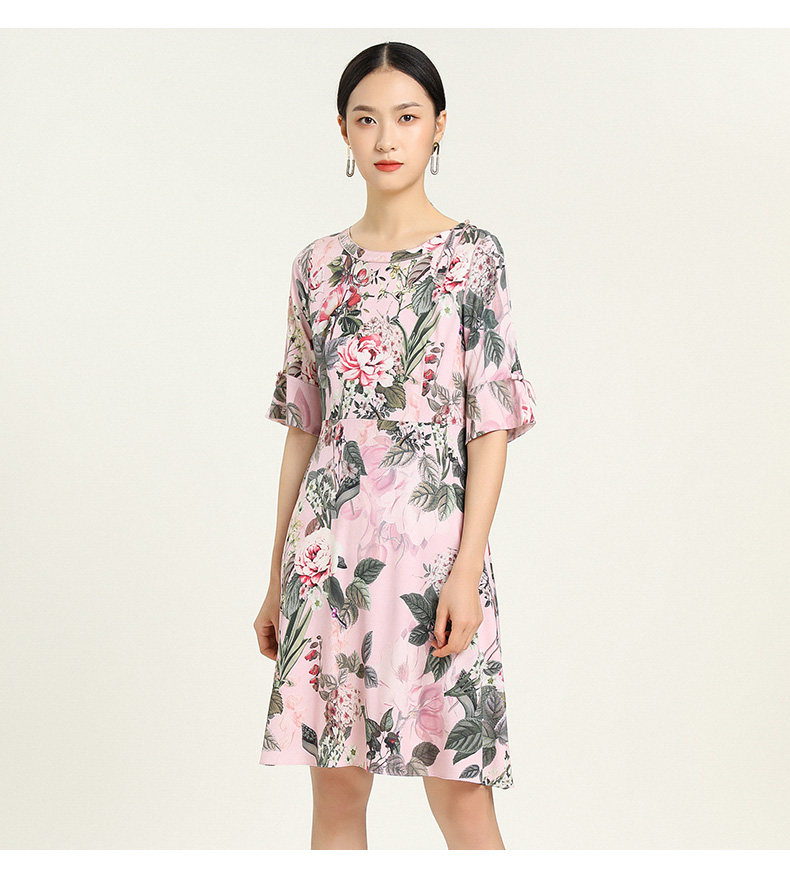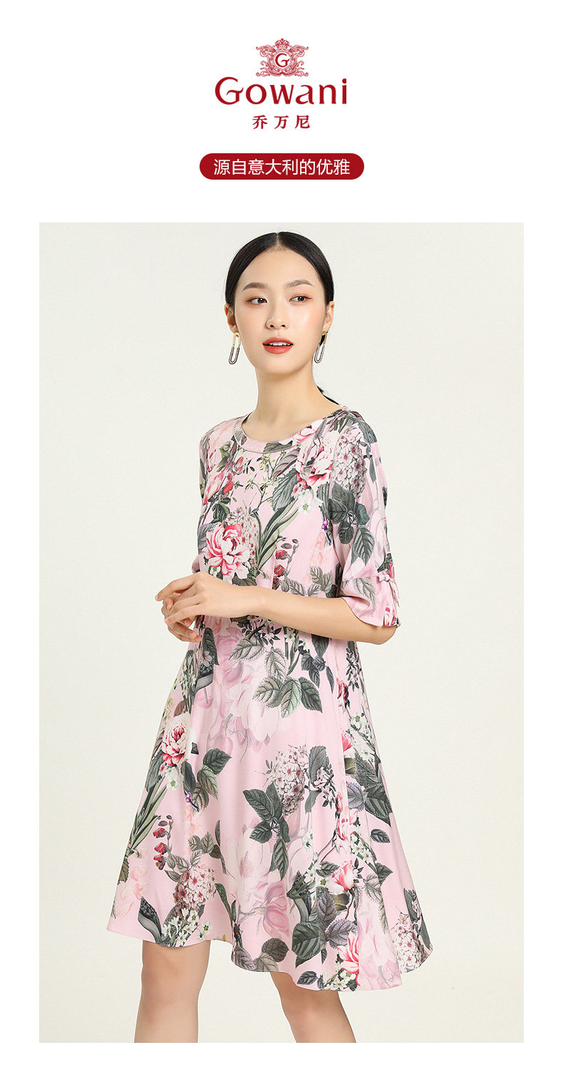 乔万尼减龄印花短袖收腰显瘦显白圆领真丝连衣裙EB2E908