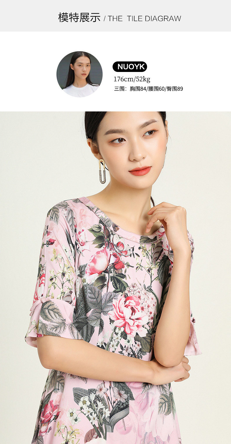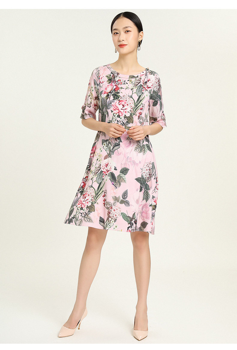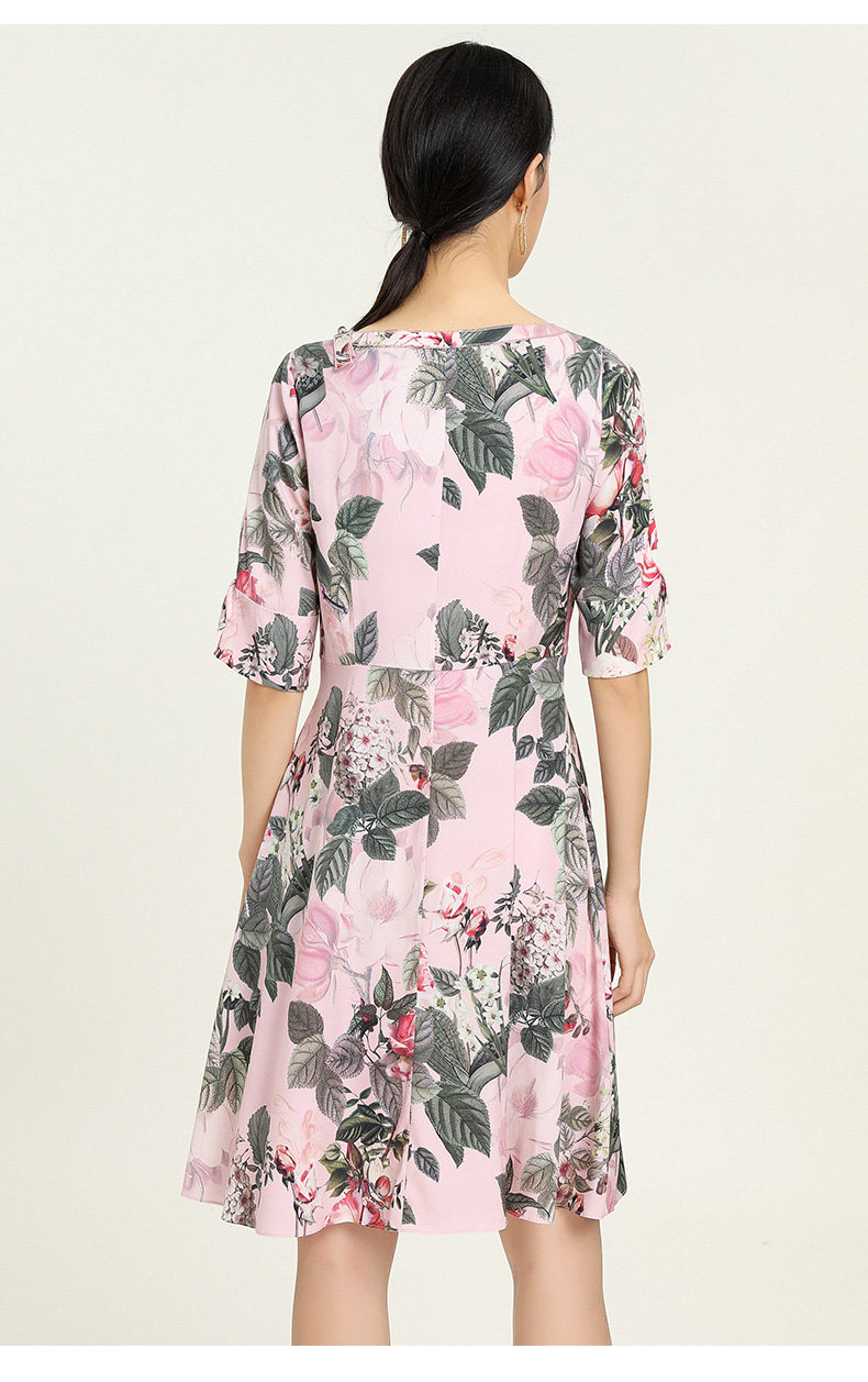 乔万尼减龄印花短袖收腰显瘦显白圆领真丝连衣裙EB2E908