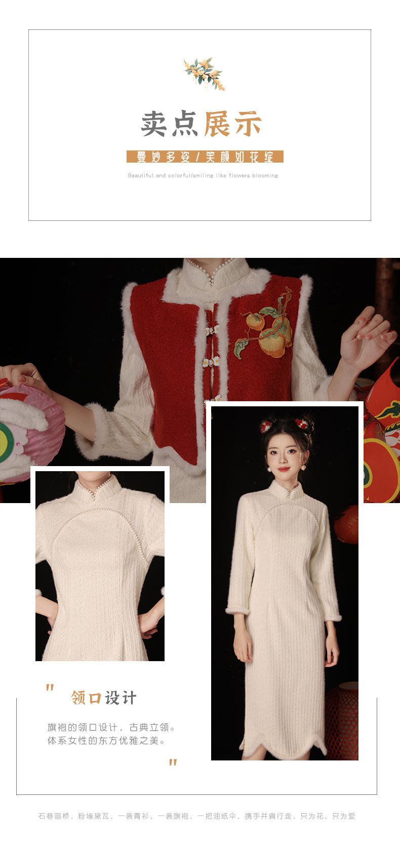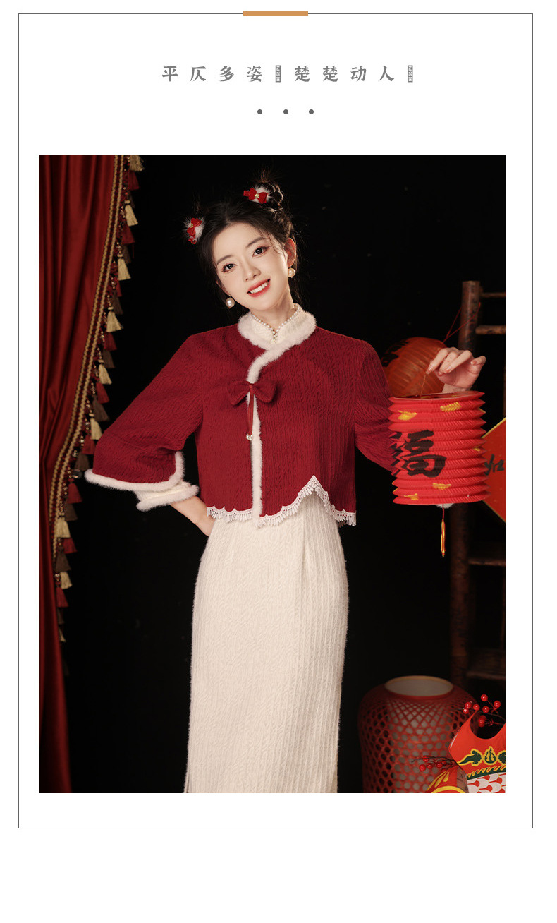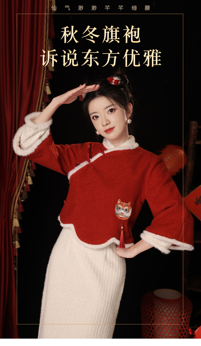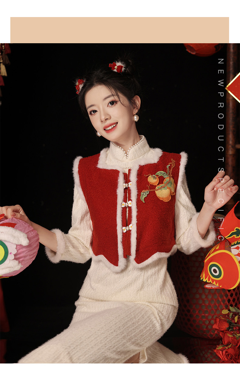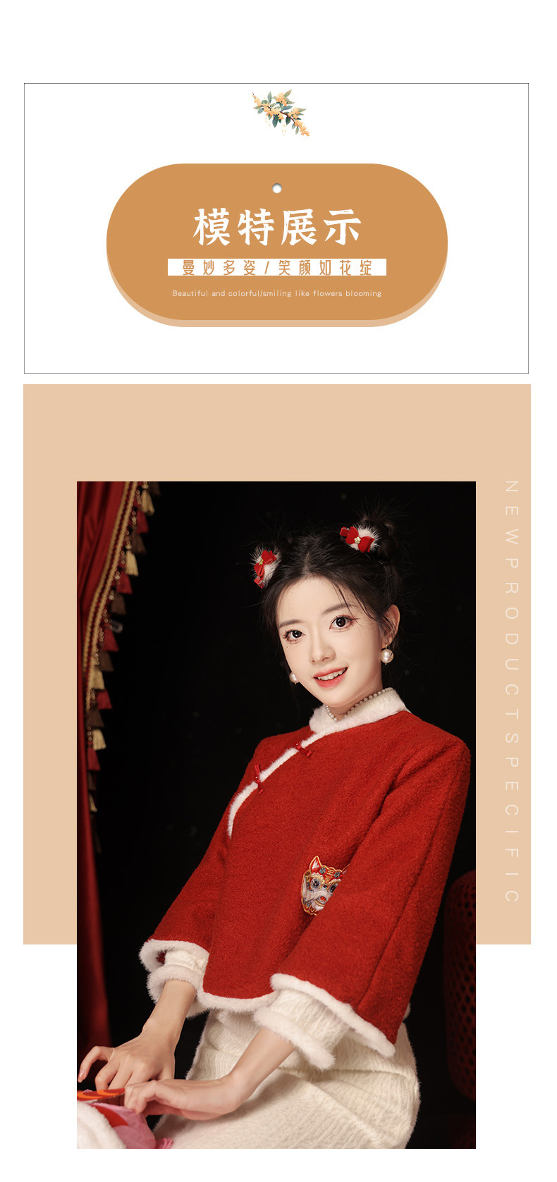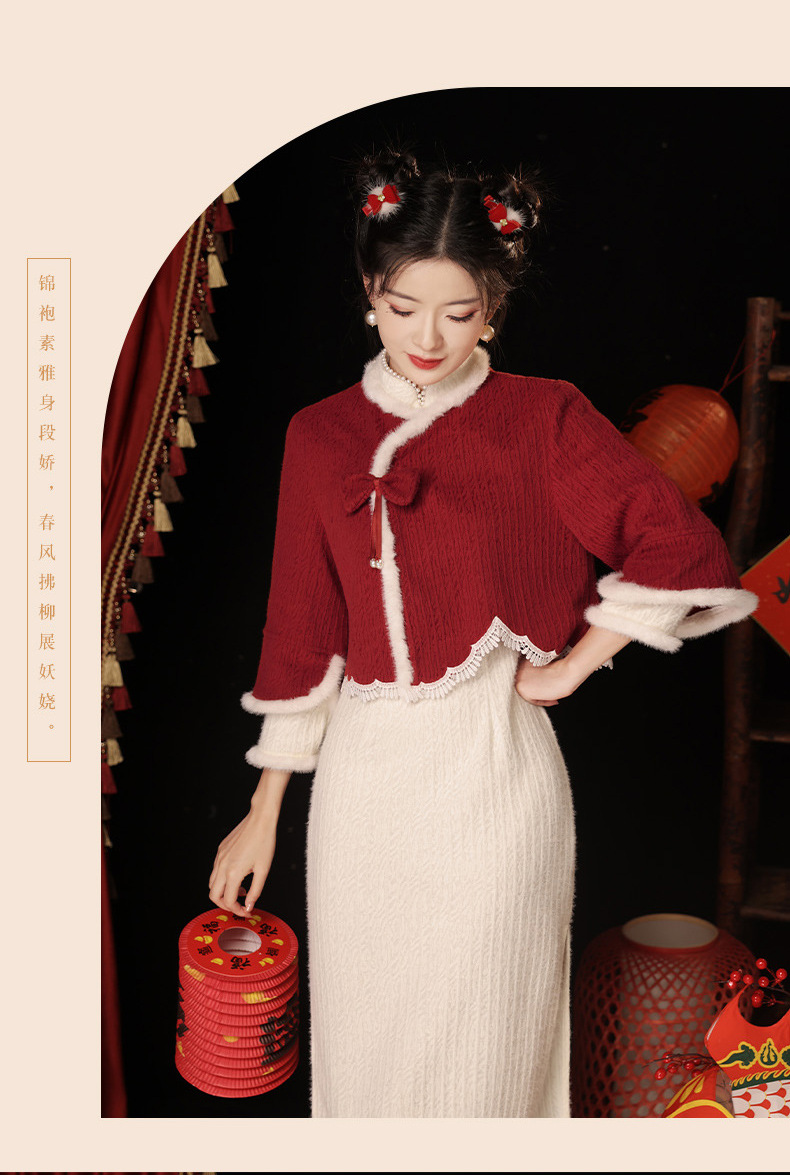 加绒羽毛纱袖口带毛旗袍,宴会拜年日常短袄马夹两件套JQZ-856