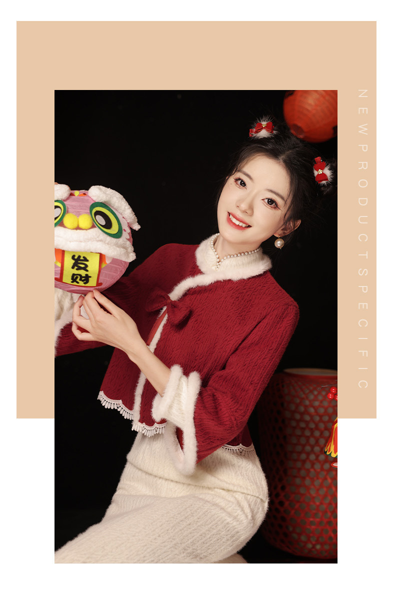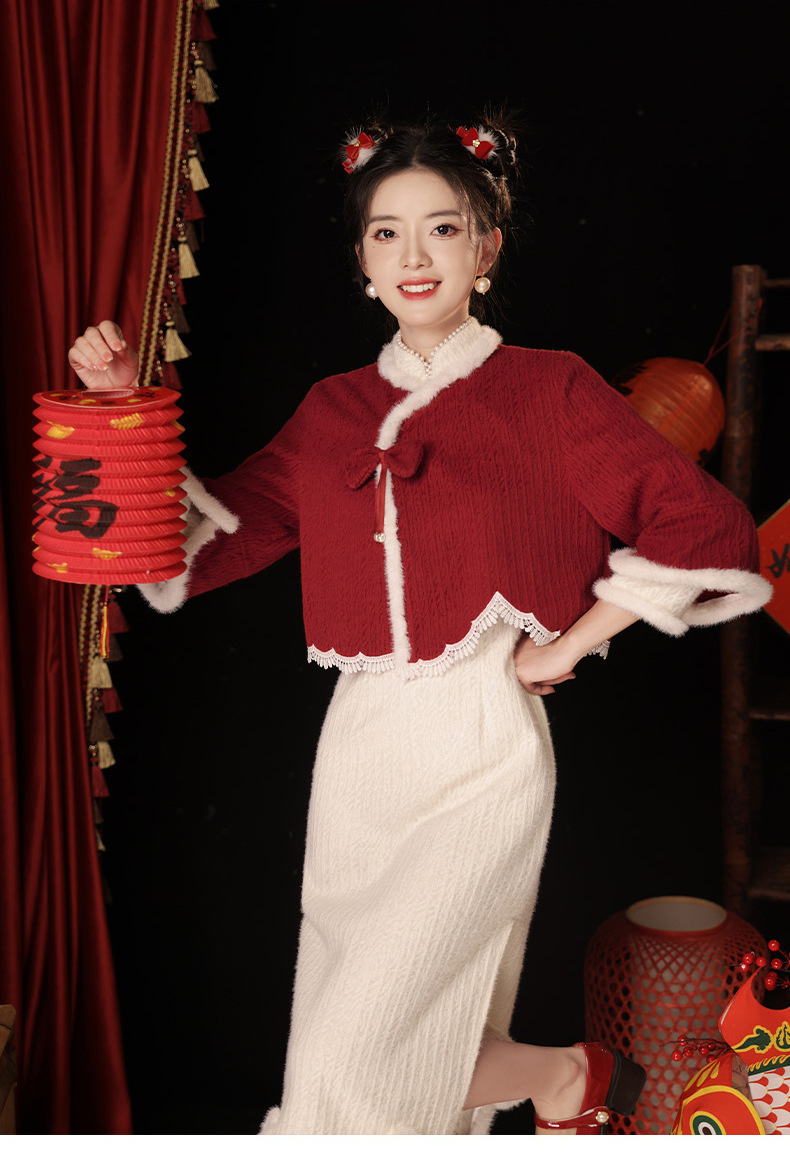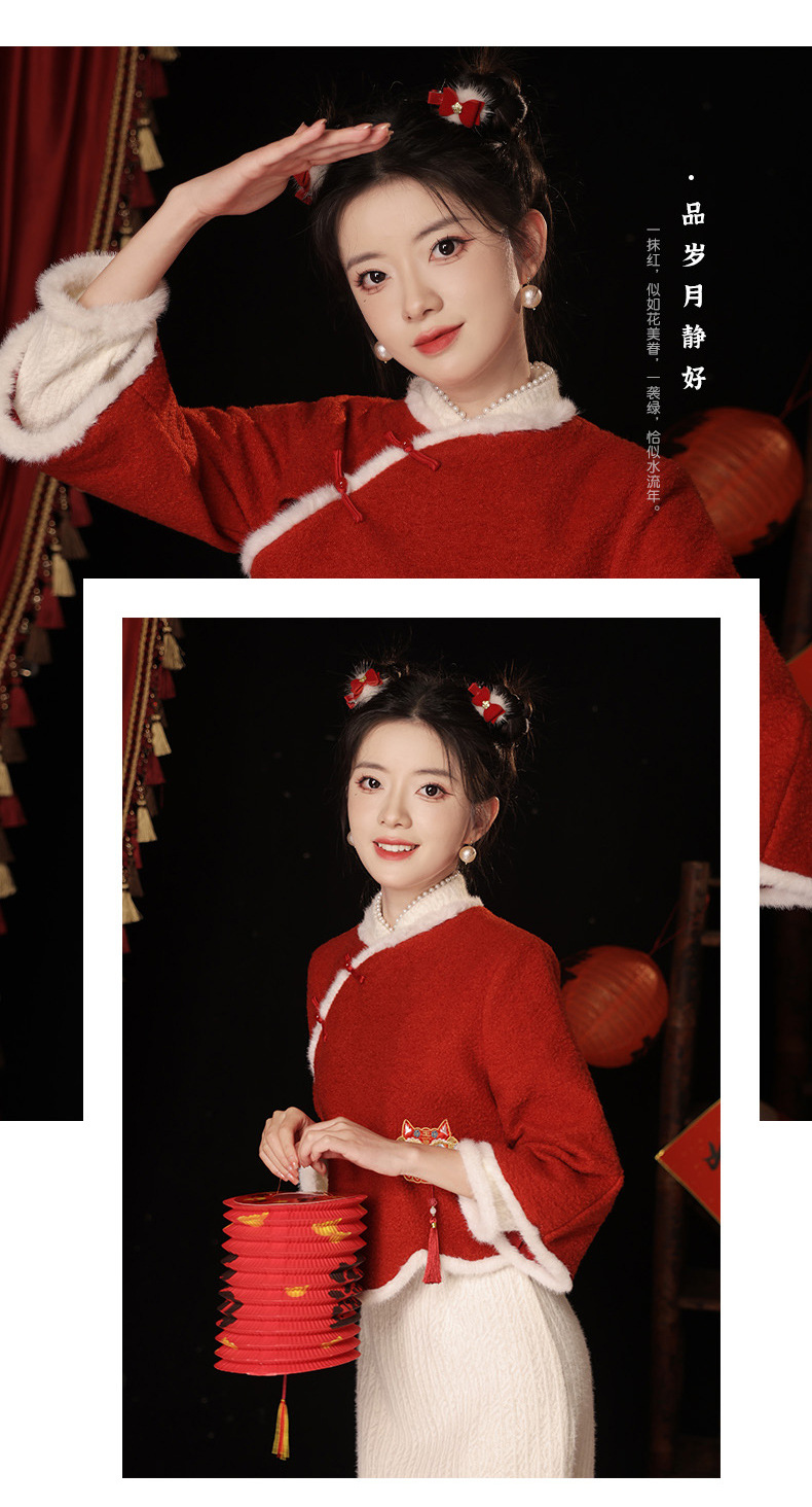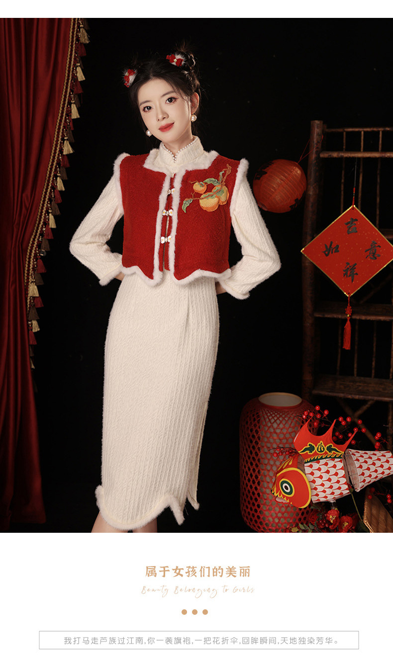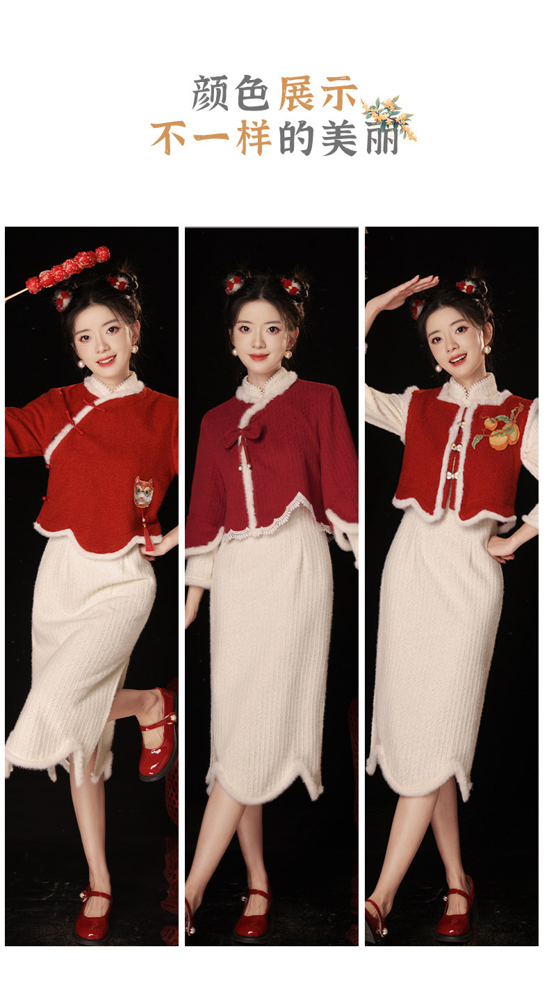 加绒羽毛纱袖口带毛旗袍,宴会拜年日常短袄马夹两件套JQZ-856