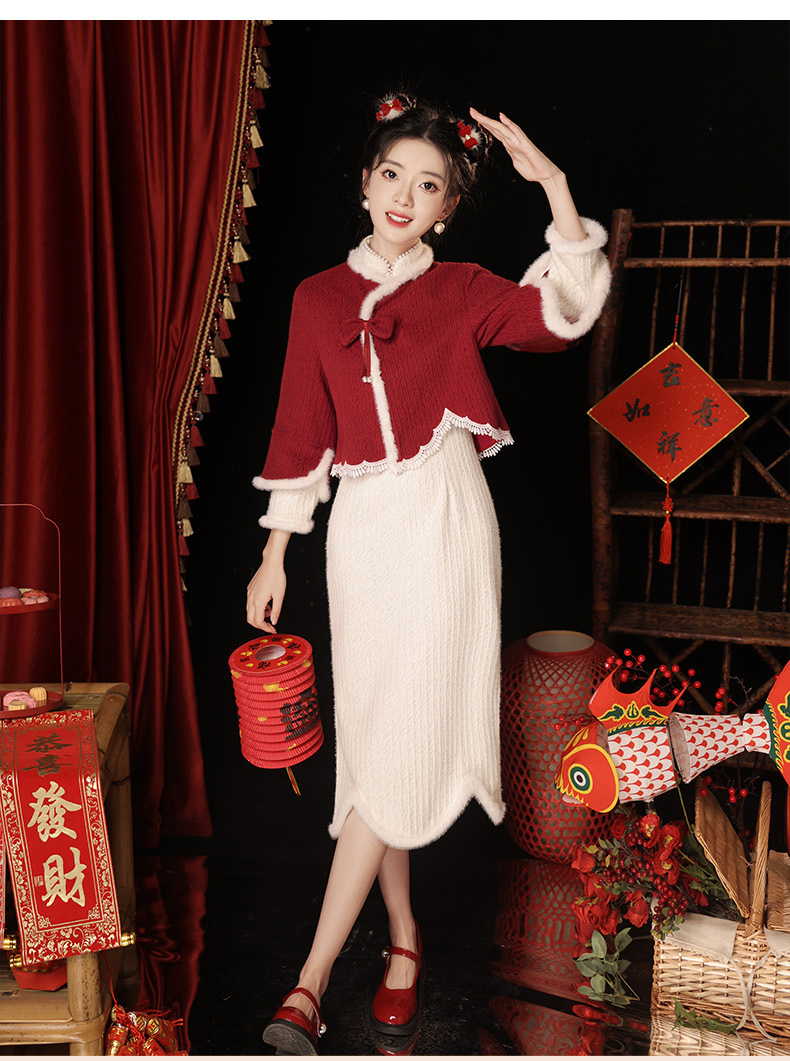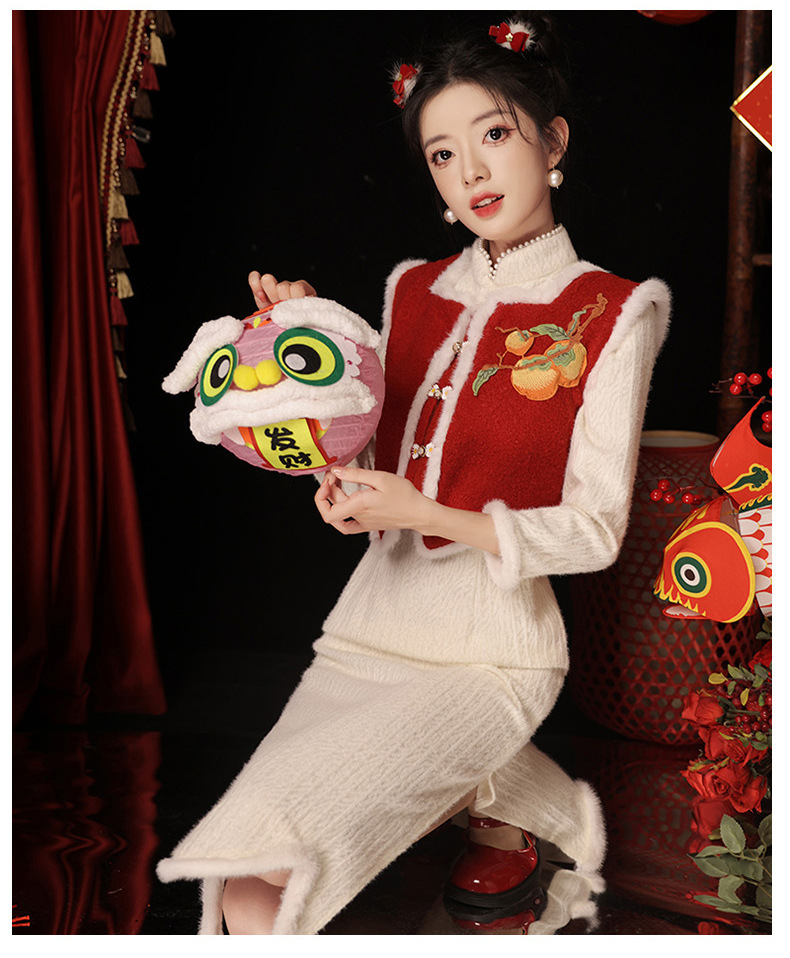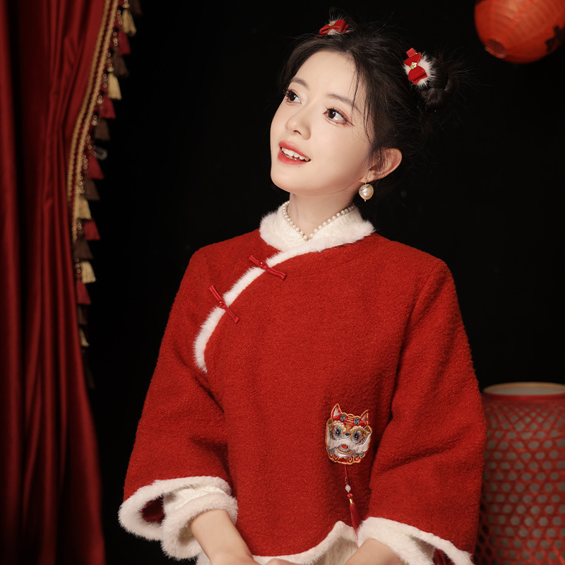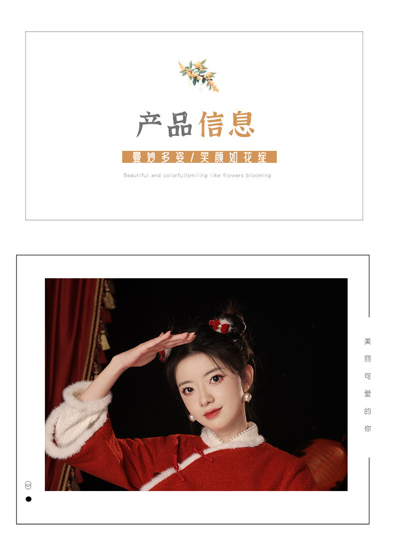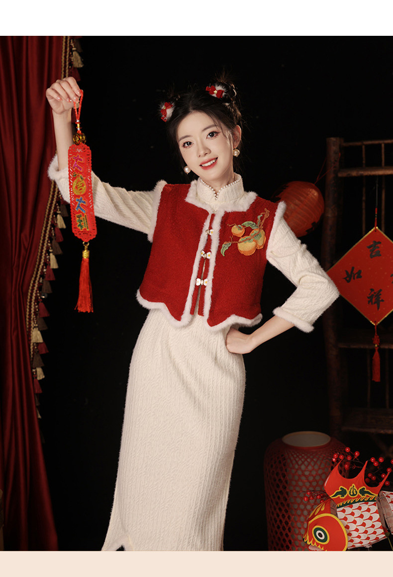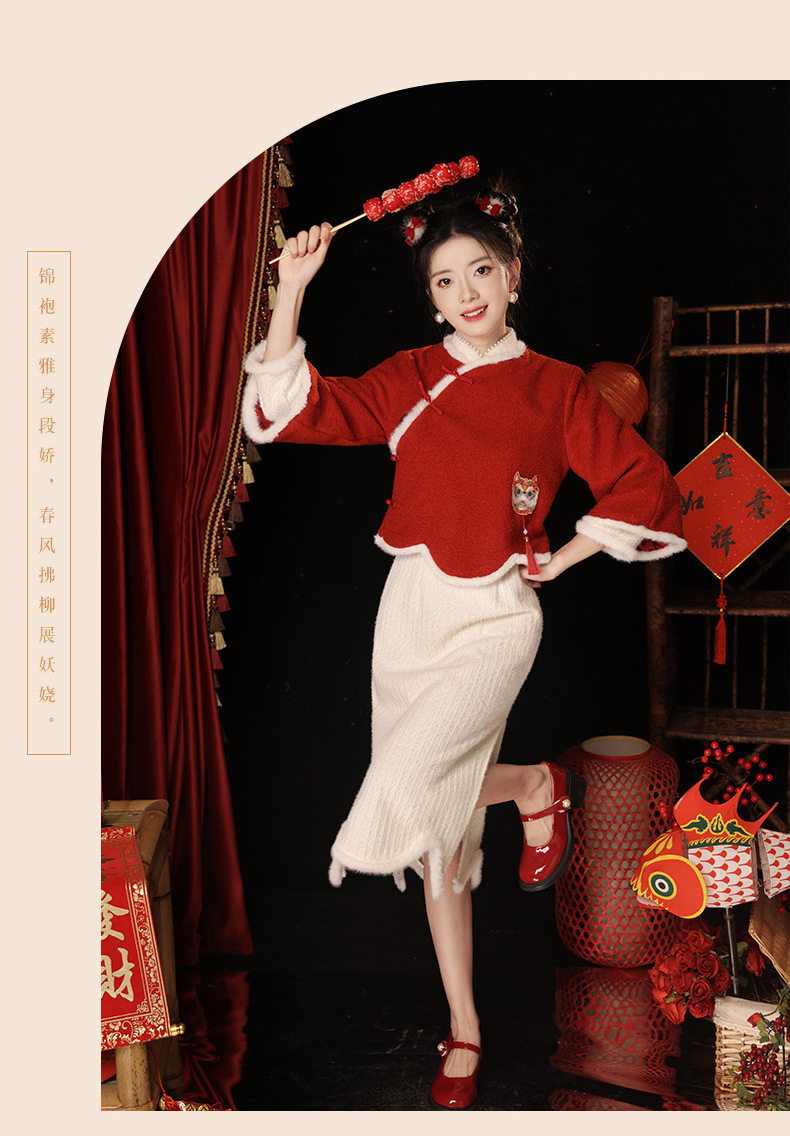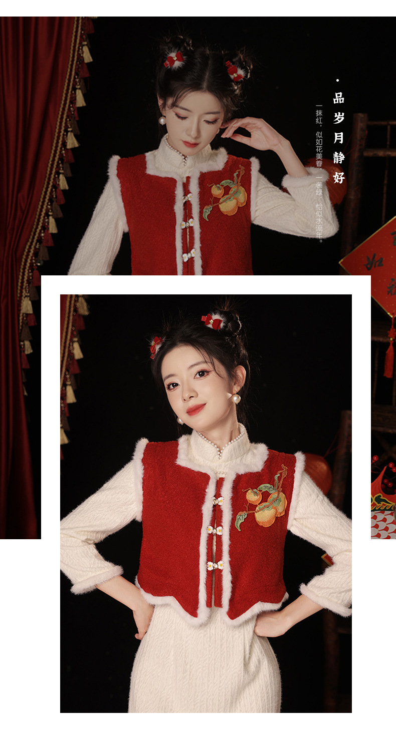 加绒羽毛纱袖口带毛旗袍,宴会拜年日常短袄马夹两件套JQZ-856