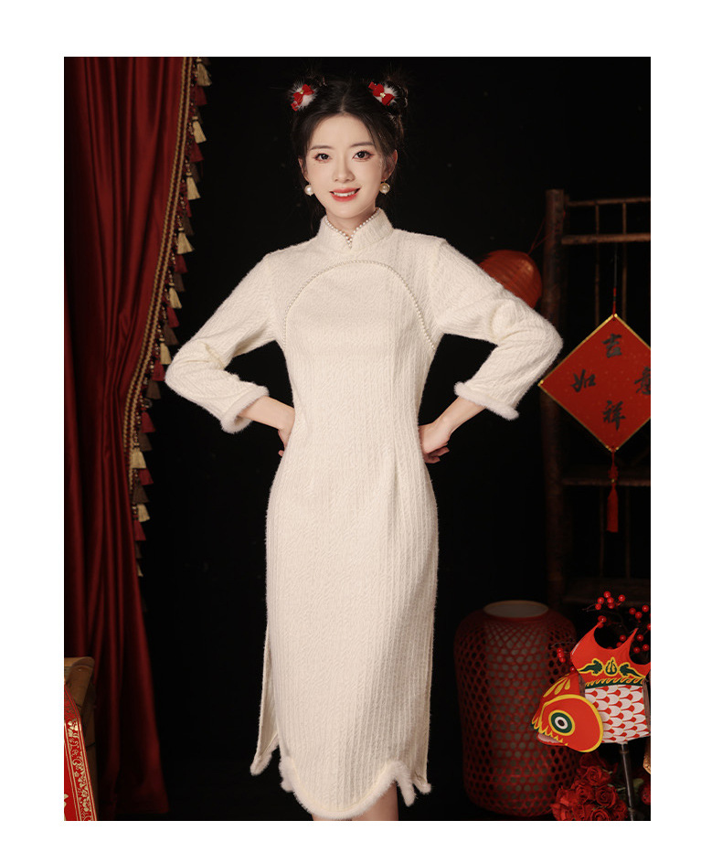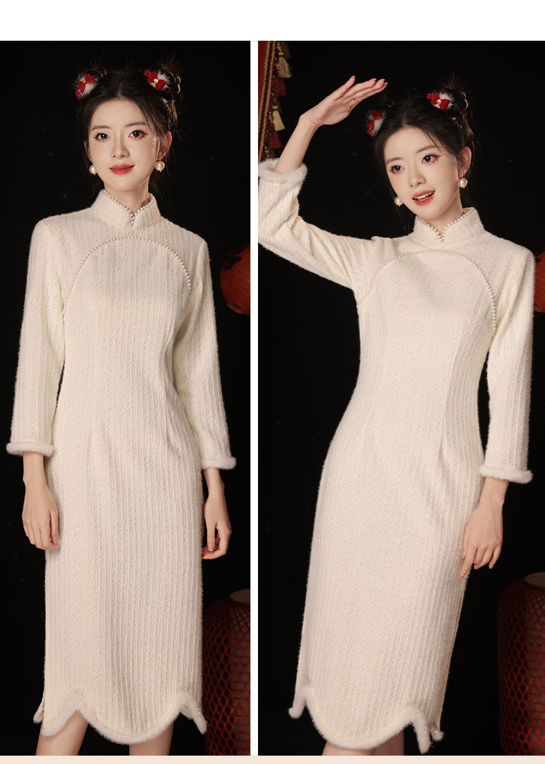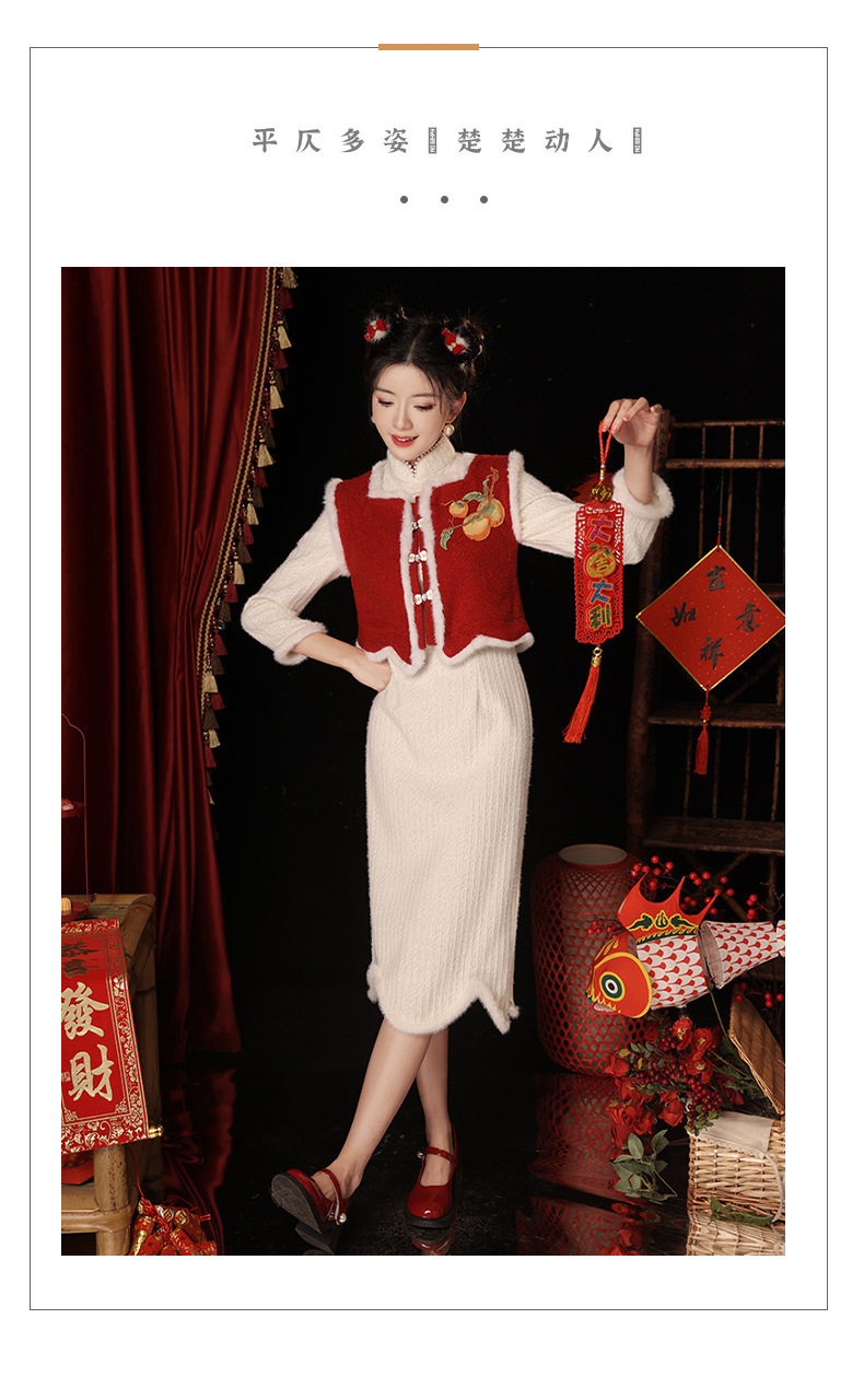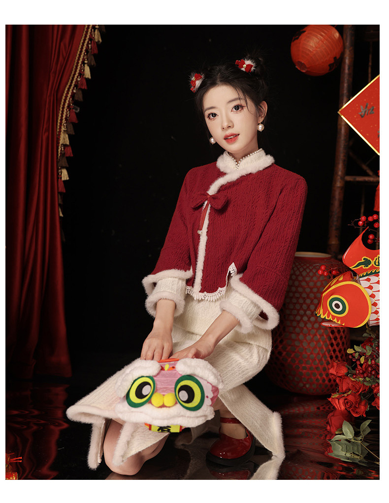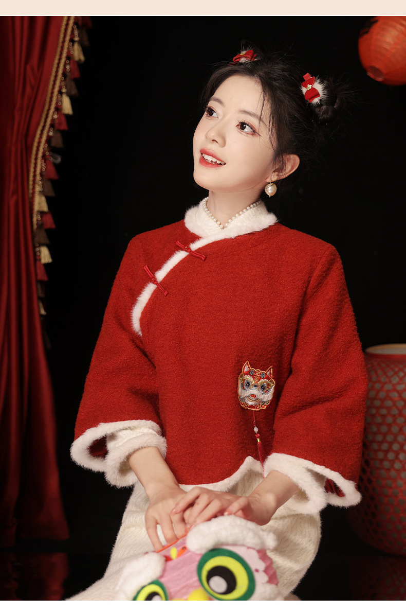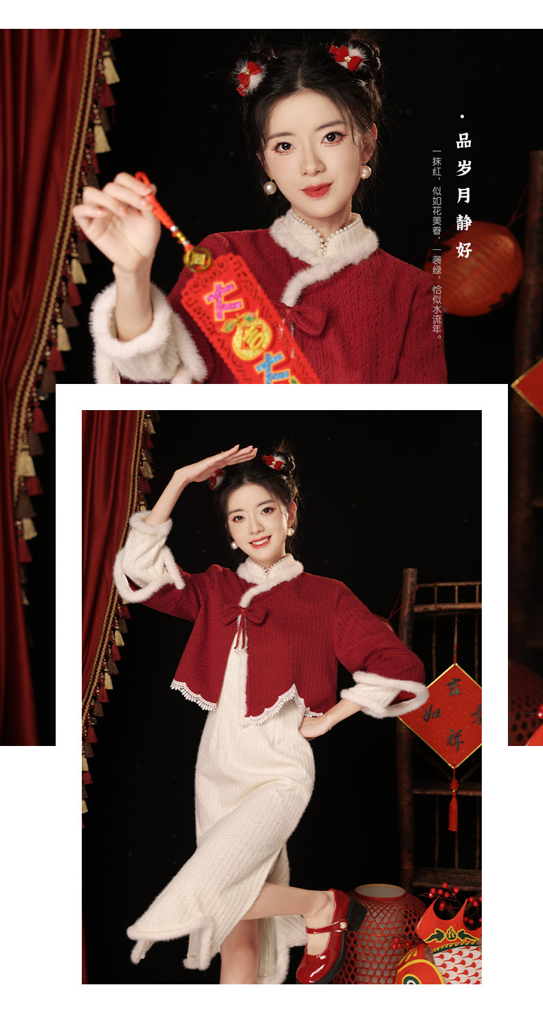 加绒羽毛纱袖口带毛旗袍,宴会拜年日常短袄马夹两件套JQZ-856