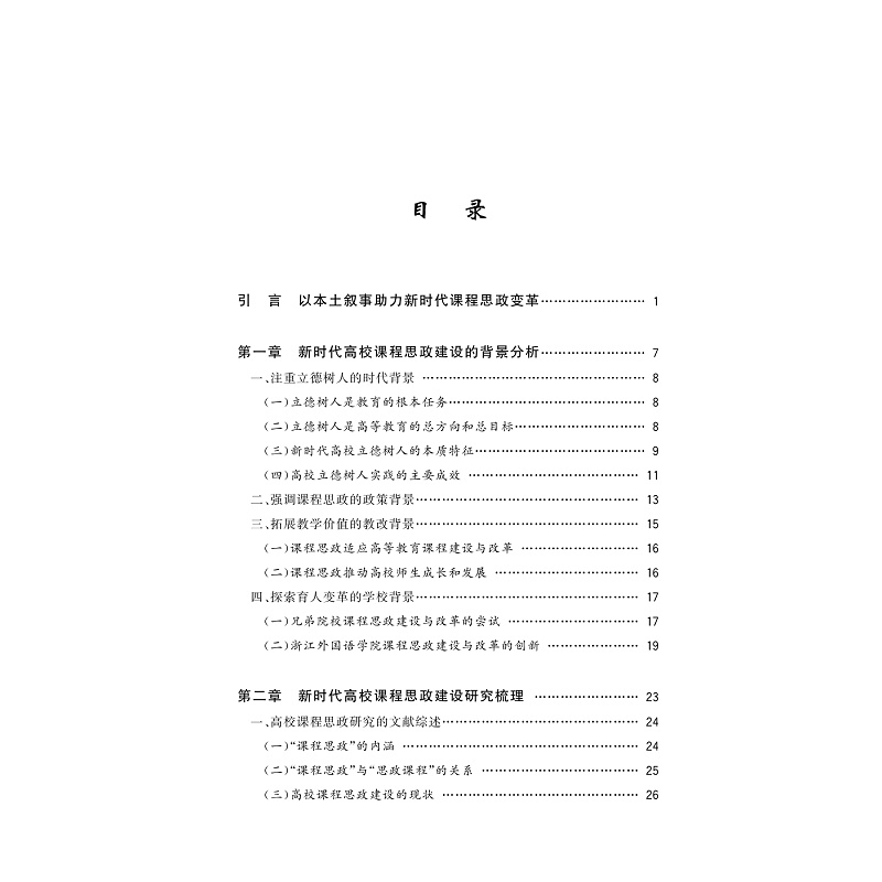 本书紧密围绕“立德树人”的教育根本任务,以当下党、政府及学界普遍关注的高校课程思政改革为题域,通过系统性的理论分析和大样本的实证调查,全面呈现和分析了新时代高校课程思政建设的理论与实务问题。全书既包括新时代高校课程思政建设的背景分析、研究梳理和理论框架建构,也包括基于浙江高校师生问卷调查的课程思政建设现状分析、问题呈现、方法设计与保障体系建构。研究既立足浙江,又着眼整个高等教育系统;既有一定的理论思考,又充分关照实践领域师生的感受与需求;既有宏观的分析,也有微观领域大量真实案例的呈现。本书对于廓清高校课程思政建设与改革的认识,丰富高校课程思政的方法论体系和提升课程思政的实效性具有较强的参考借鉴价值。
