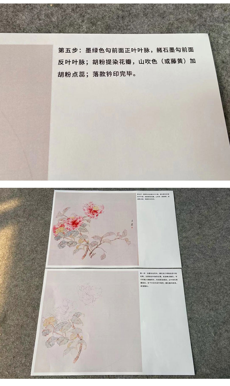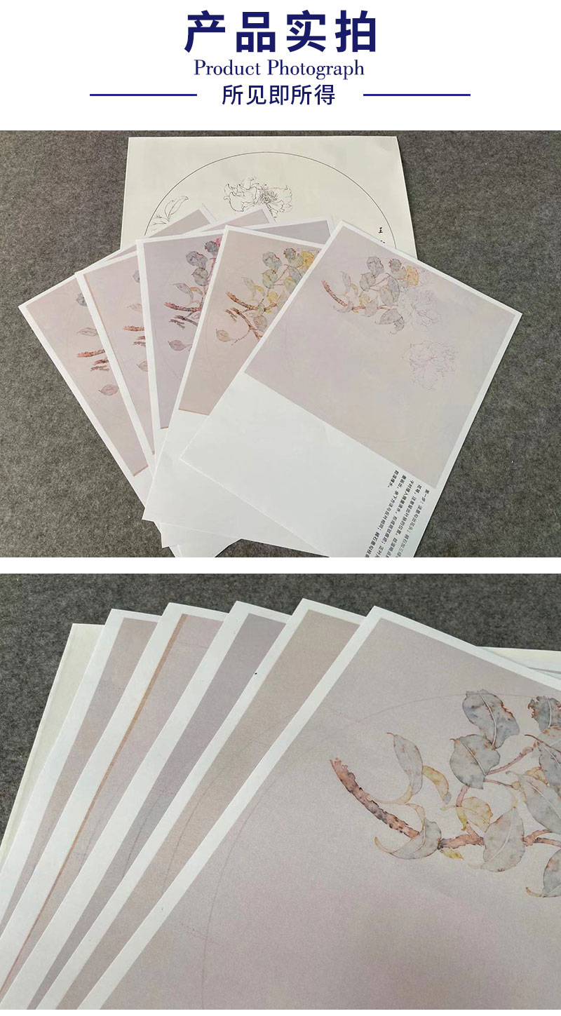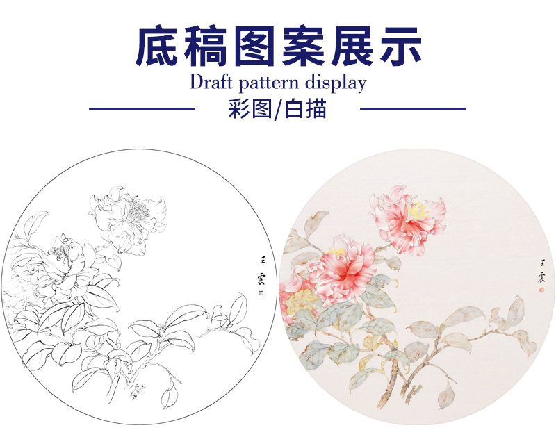 【有步骤】王震工笔画白描底稿圆形小品《茶花图》初学者临摹花鸟线稿WZ24