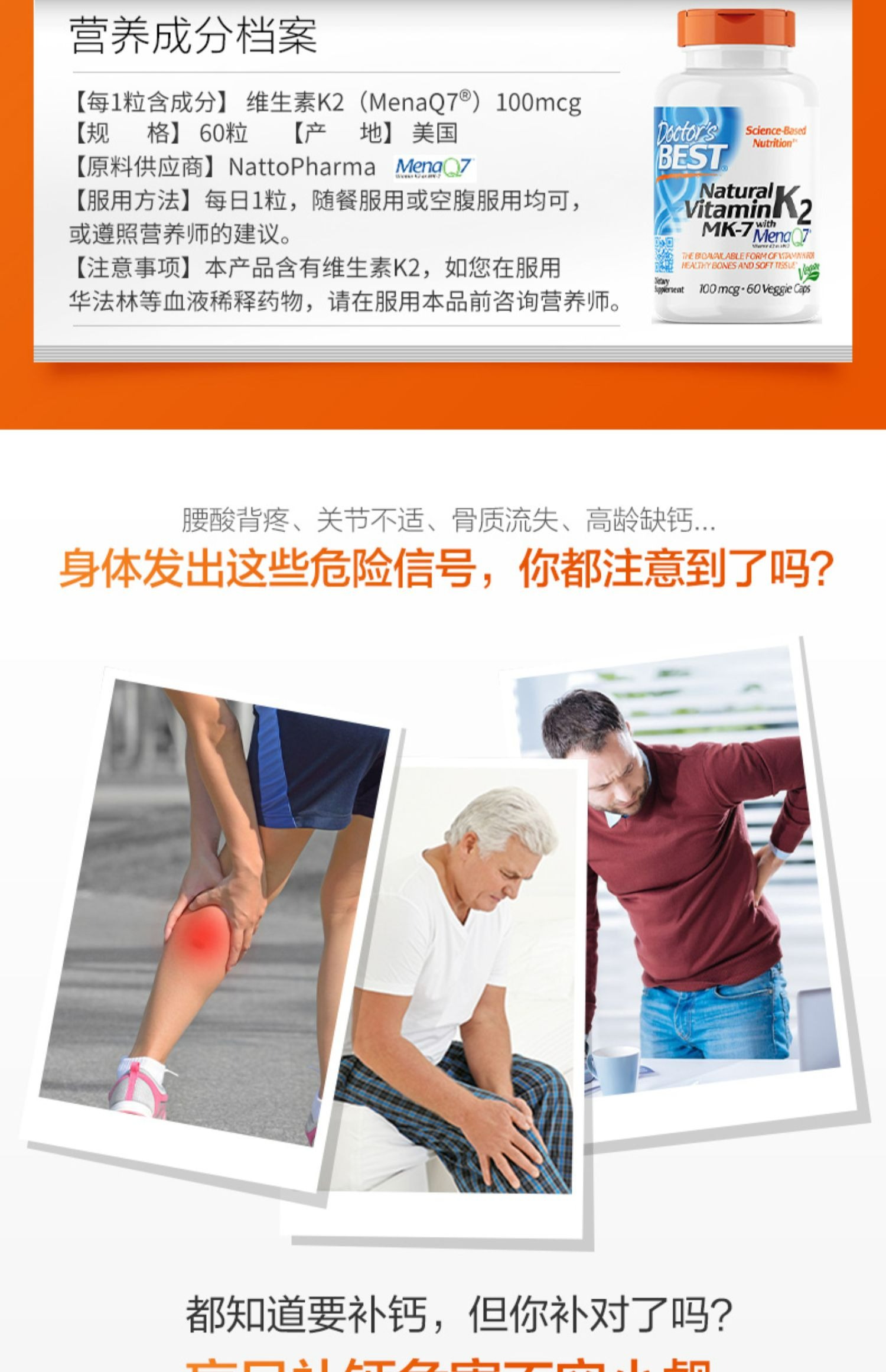 【Doctor's Best】美国 多特倍斯 天然维生素K2 mk7补钙入骨 100mcg 60粒 金达威