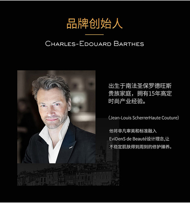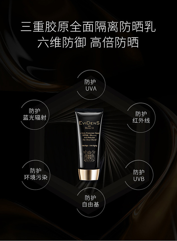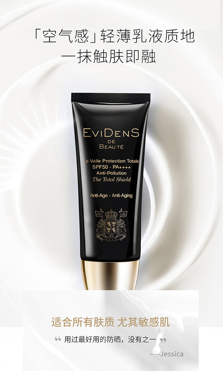 EviDenS de Beauté是法国小众贵妇高奢护肤品牌,灵感源自查尔斯·爱德华·巴尔特的妻子美丽而敏感的肌肤,于是建立了全球首个专为敏感肌肤研发的抗衰老品牌;此款防晒乳能全面多效保护几乎免受UVB UVA射线损伤,避免年龄斑点出现,隔离环境污染,色素沉淀高效防晒,卓效抗光老,质地轻薄,快速成膜不搓泥,建立肌肤防御膜,无惧蓝光侵害。