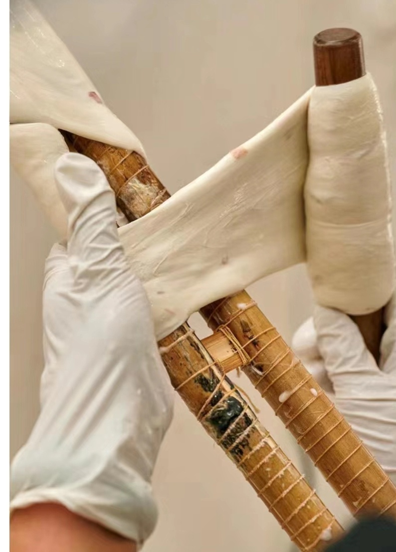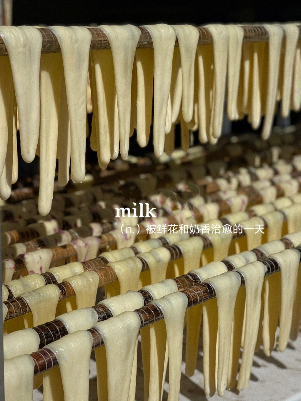 奶白色雪花泛起,捞起拉伸成似透非透的薄片,缠绕于细竿上晾干,阳光正好,微风不躁,全天下的乳香都凝固进这一方乳扇里。