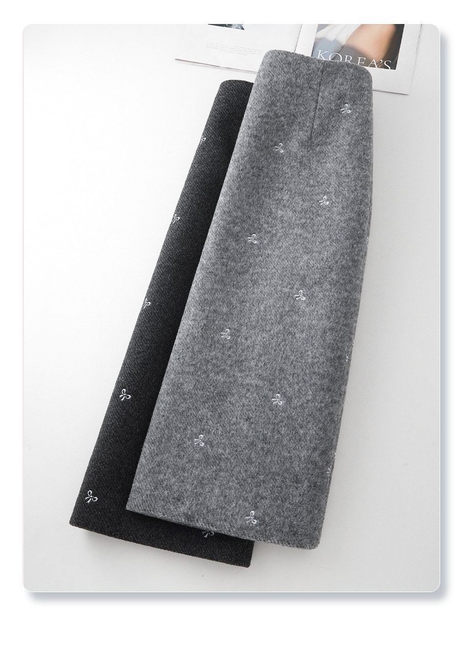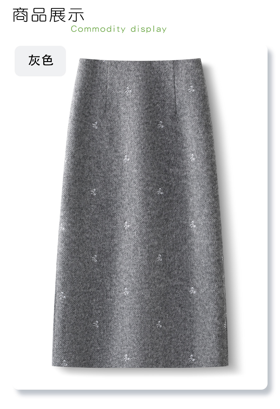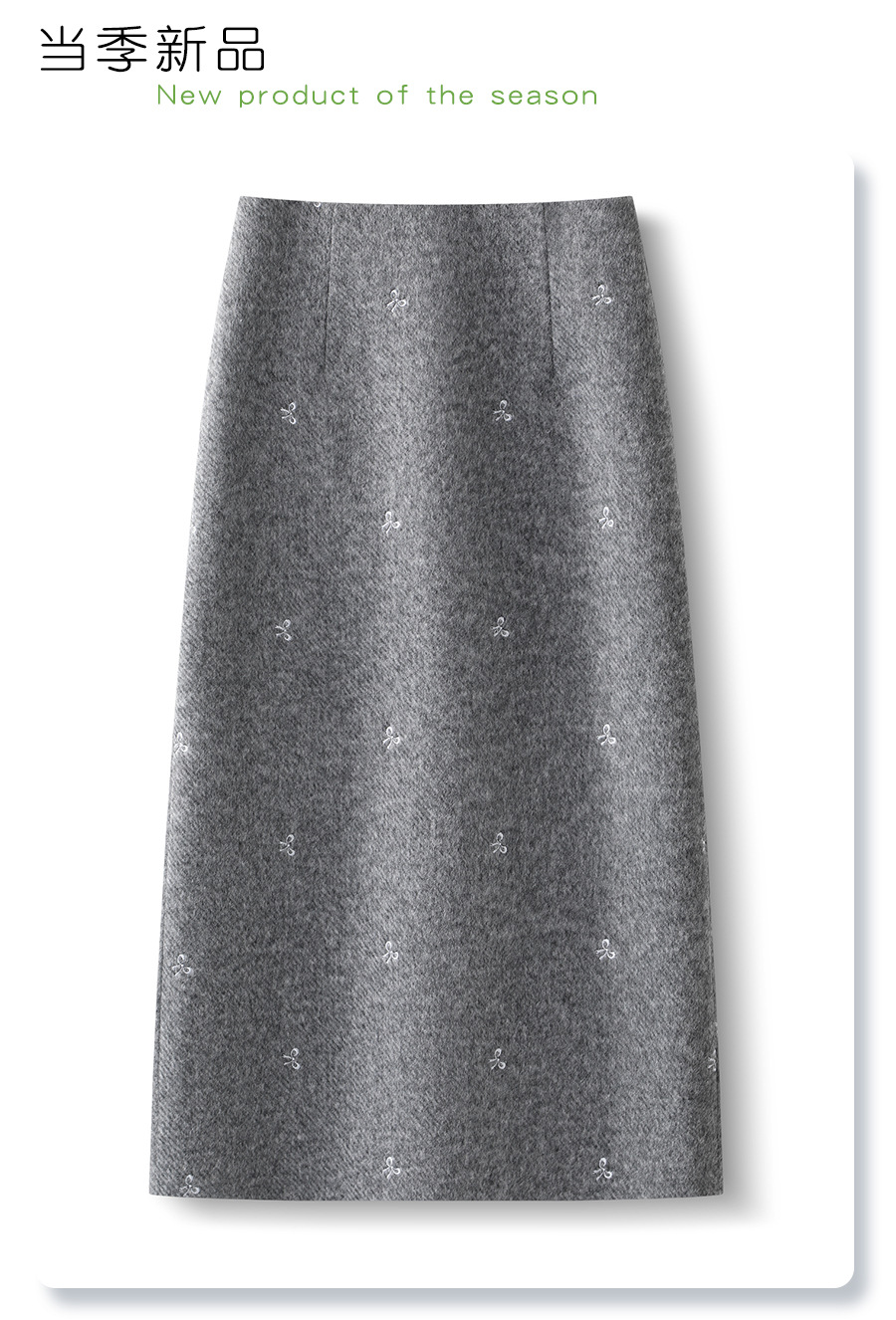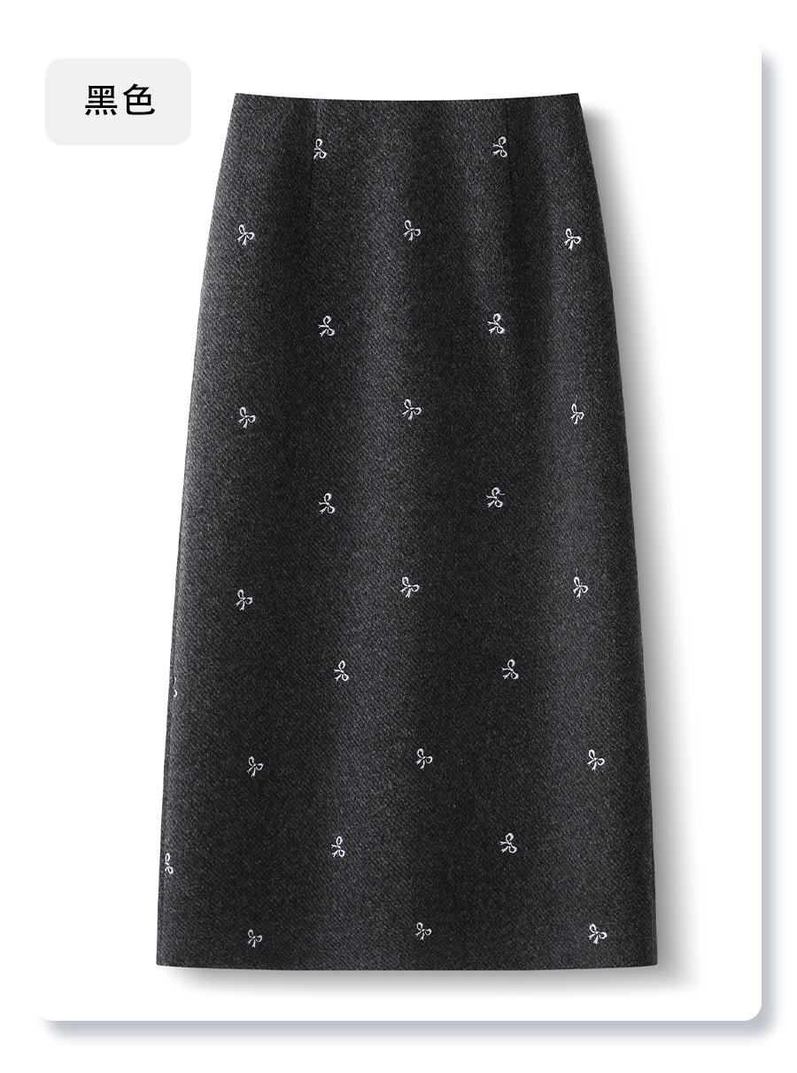 丁摩 黑色刺绣毛呢直筒半身裙女秋季新款高腰显瘦中长款开叉一步裙5ZF-28706
