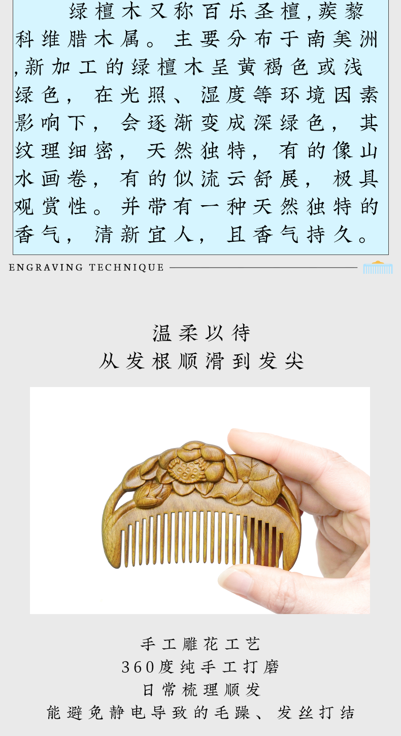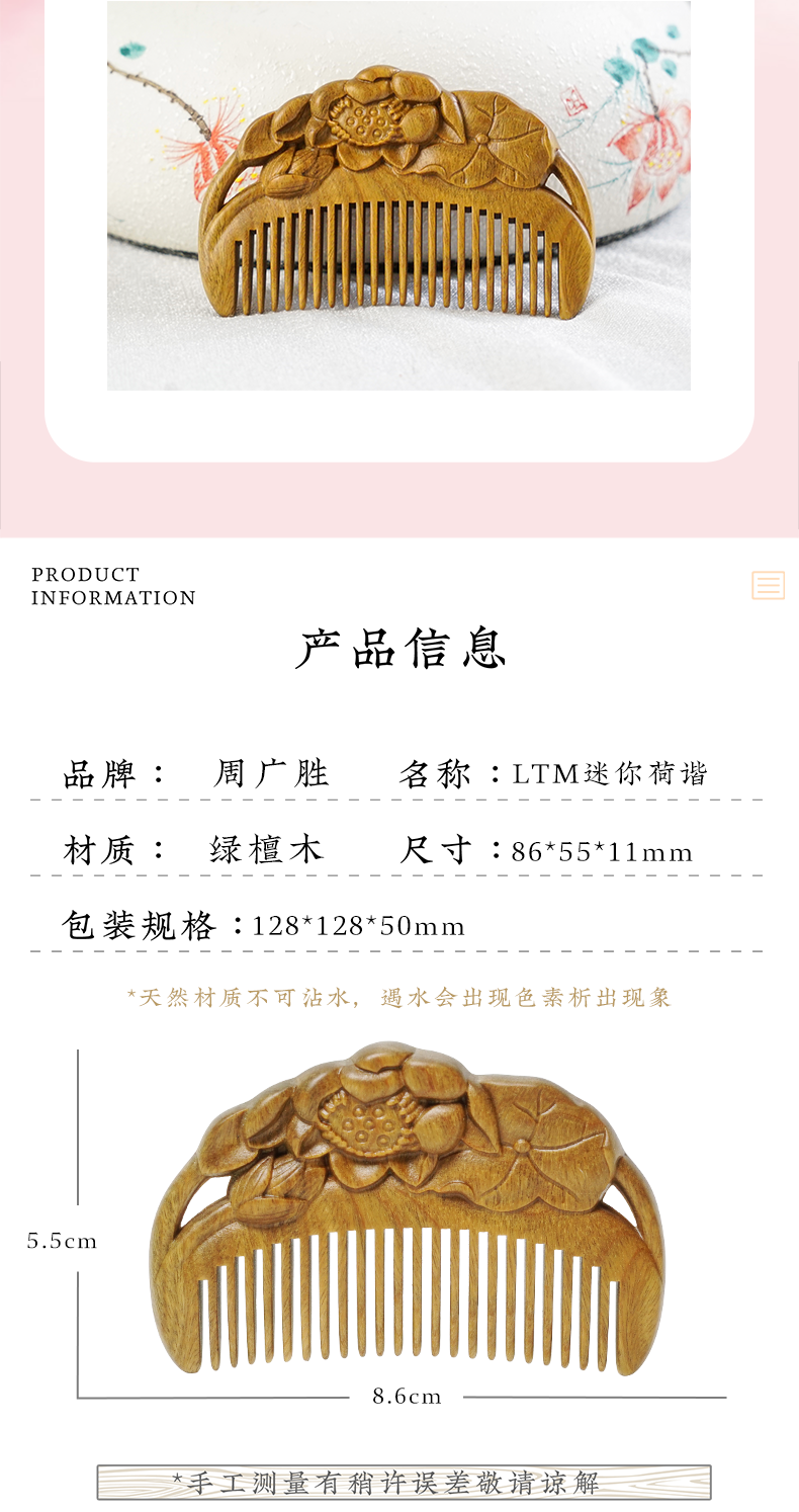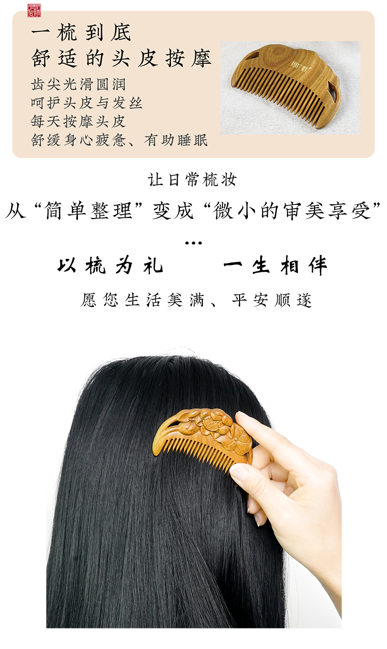 周广胜天然绿檀木雕花梳子古风盘发梳礼盒装小巧便携顺发护发蓬发