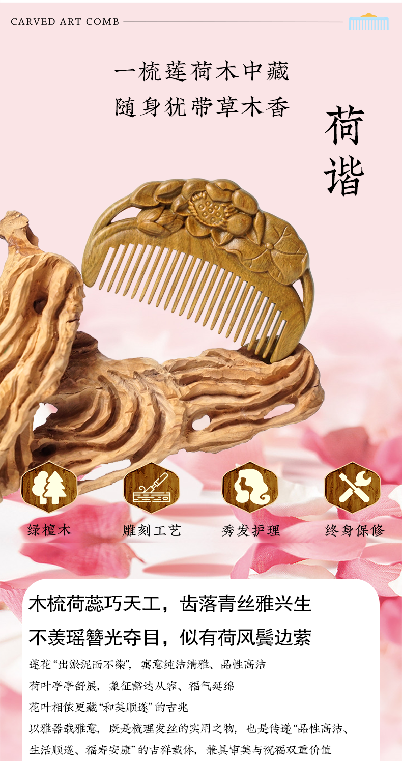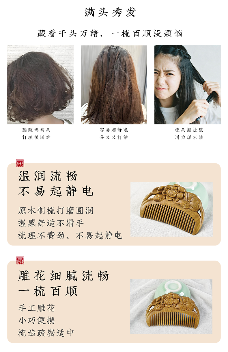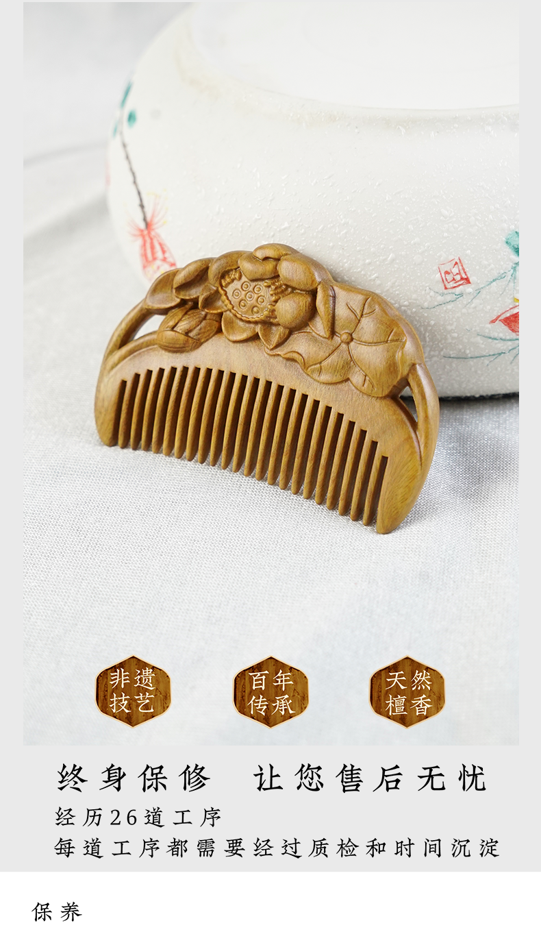 周广胜天然绿檀木雕花梳子古风盘发梳礼盒装小巧便携顺发护发蓬发