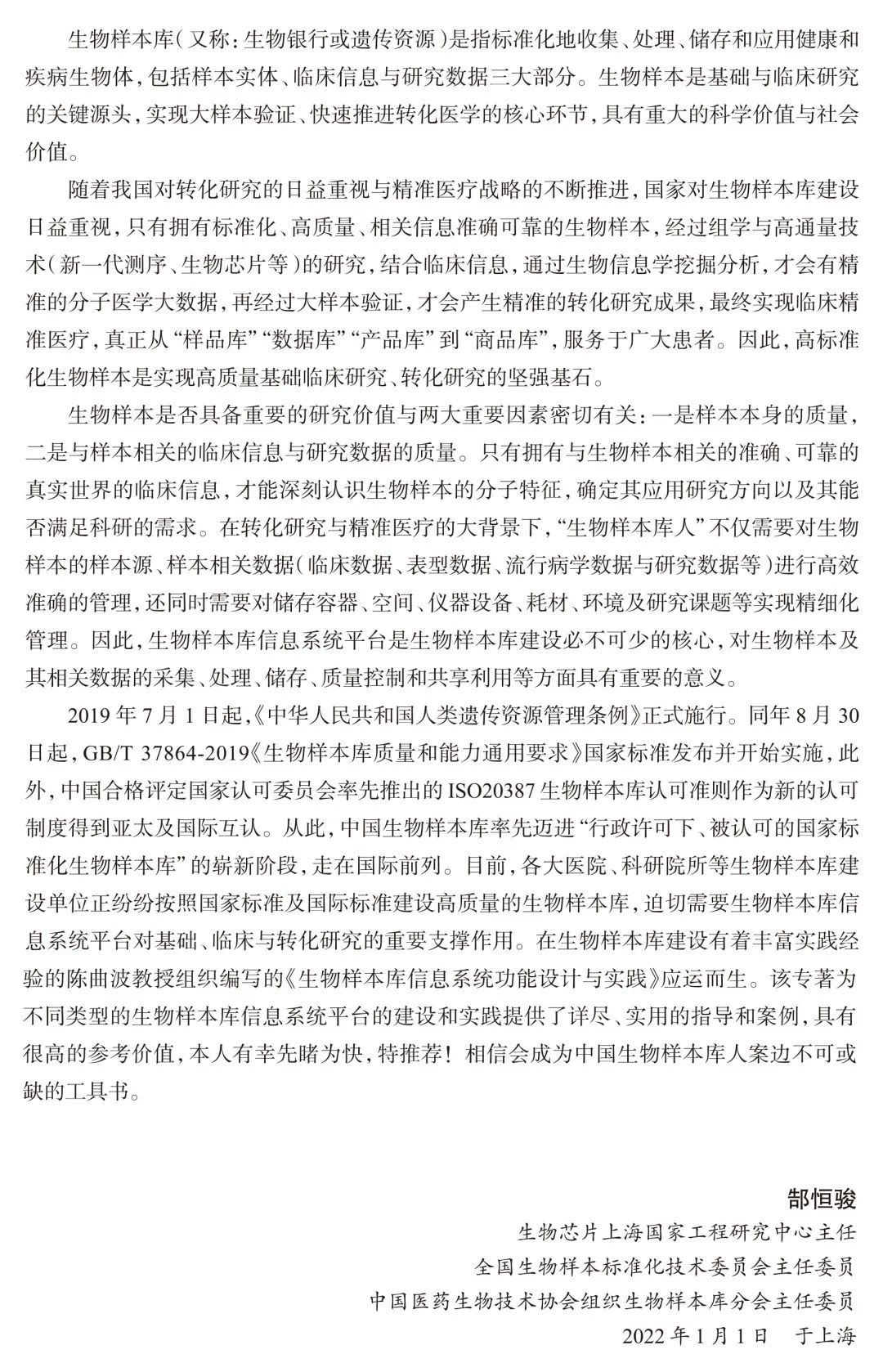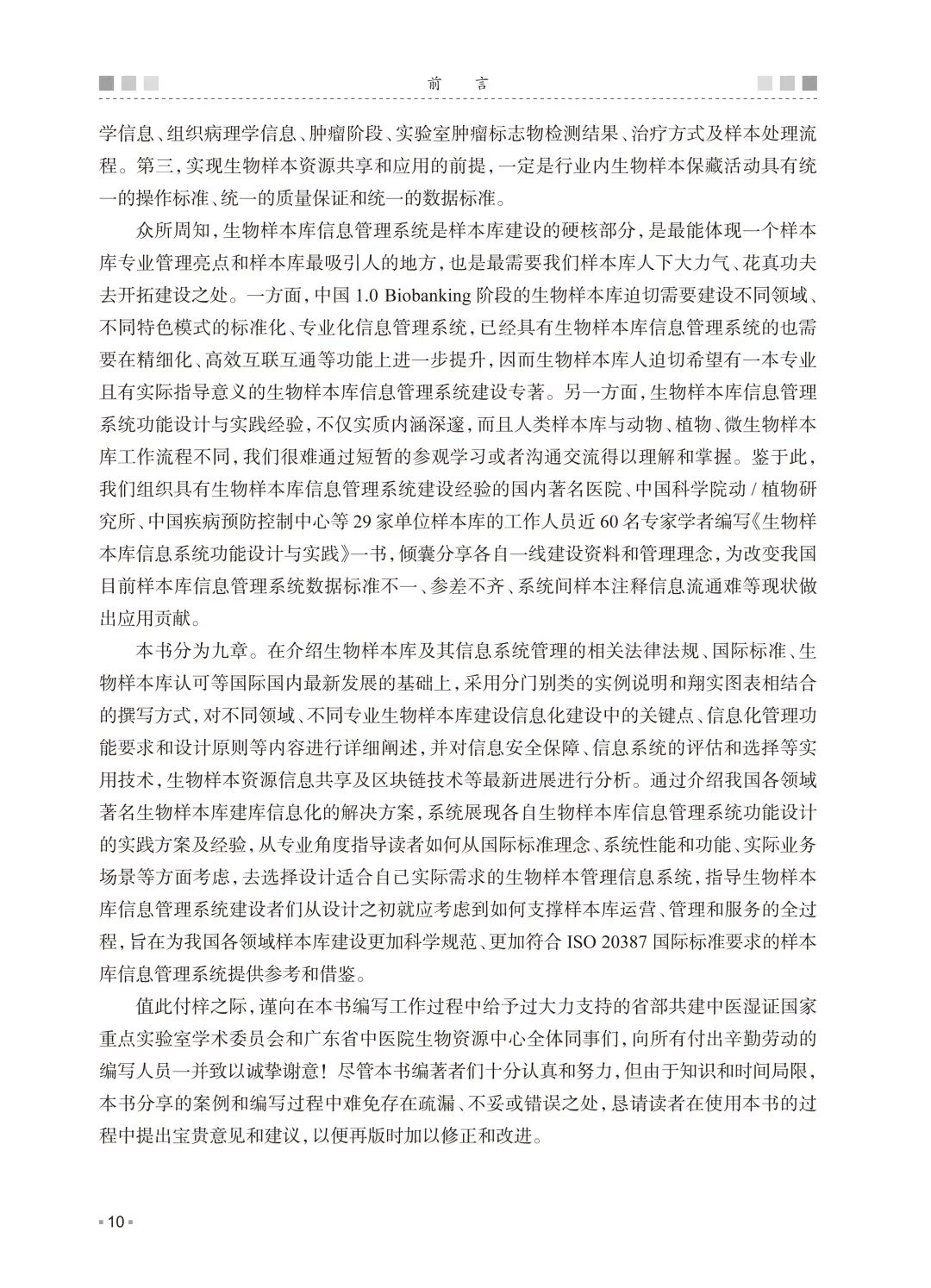 通过介绍我国各领域著名生物样本库建库信息化的解决方案,系统展现各自生物样本库信息管理系统功能设计的实践方案及经验,从专业角度指导读者如何从国际标准理念、系统性能和功能、实际业务场景等方面考虑,去选择设计适合自己实际需求的生物样本管理信息系统,指导生物样本库信息管理系统建设者们从设计之初就应考虑到如何支撑样本库运营、管理和服务的全过程,旨在为我国各领域样本库建设更加科学规范、更加符合ISO 20387国际标准要求的样本库信息管理系统提供参考和借鉴。