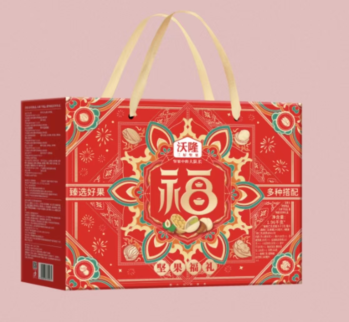 ③沃隆吉祥如意坚果盒装1.96kg【内配:开心果50g*1、榛子100g*1、夏威夷果100g*1、盐焗纸皮核桃110g*1、小白杏核100g*1、提子干200g*1、鱼皮花生(裹衣花生)180g*1、灰枣160g*1、扁桃仁乳(植物蛋白饮料)240ml*4】