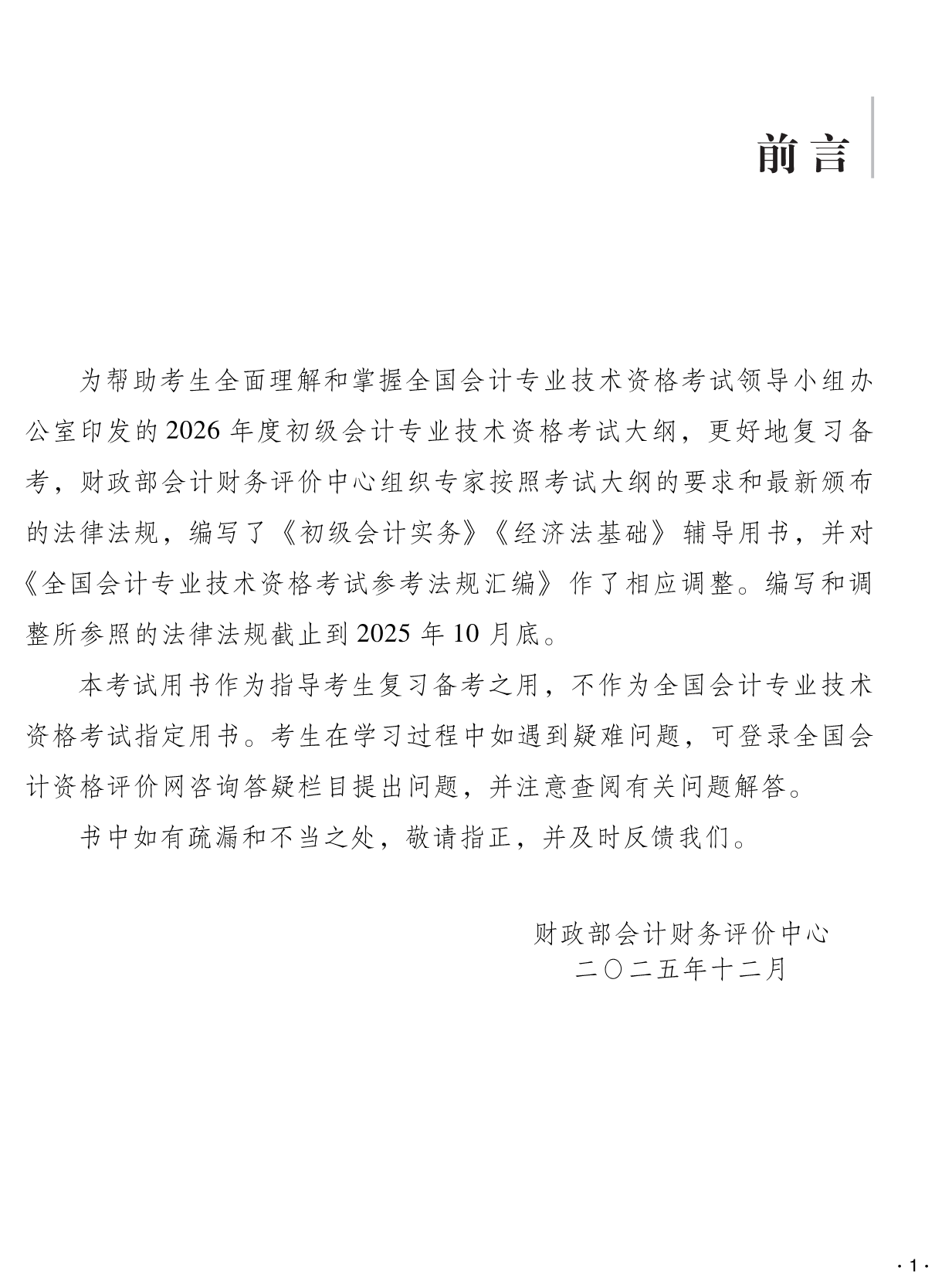 2026年度全国会计专业技术初级资格考试辅导教材由财政部会计财务评价中心组织专家根据考试大纲的要求和最新颁布的法律法规编写,旨在指导考生复习备考。