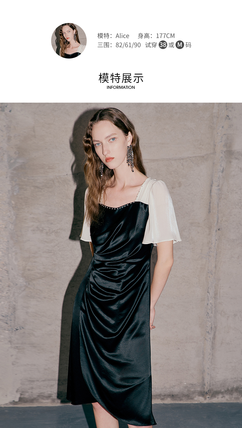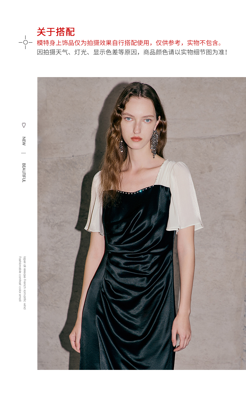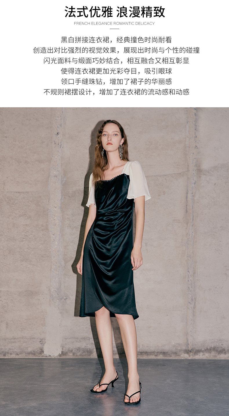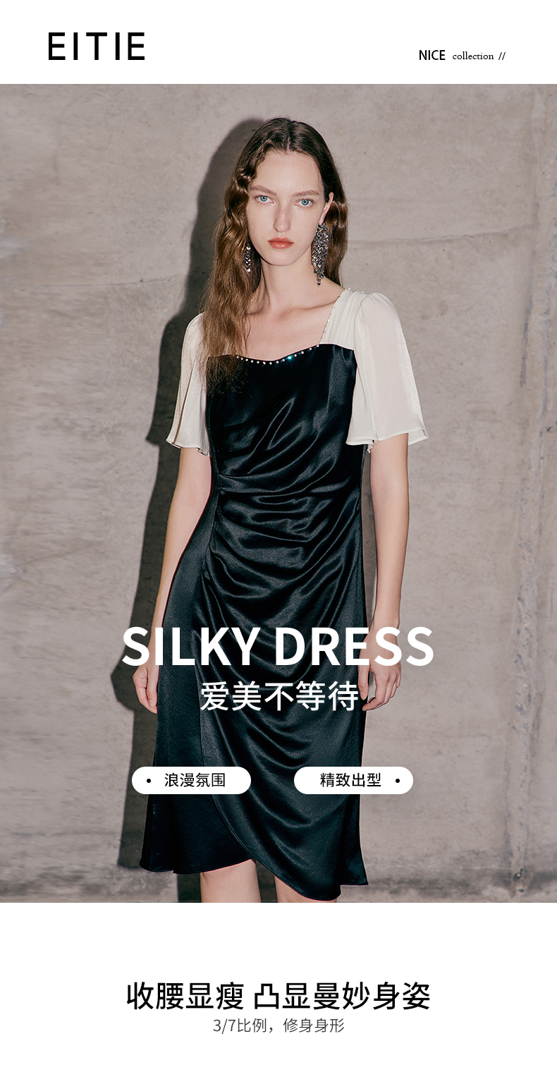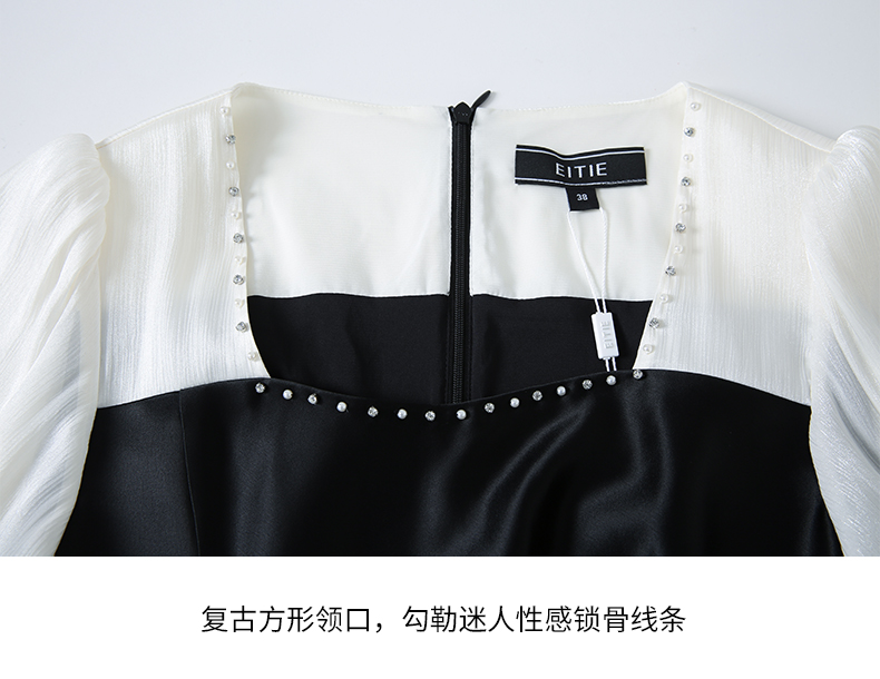 EITIE爱特爱春夏新款时尚气质方领收腰撞色显瘦连衣裙7307027