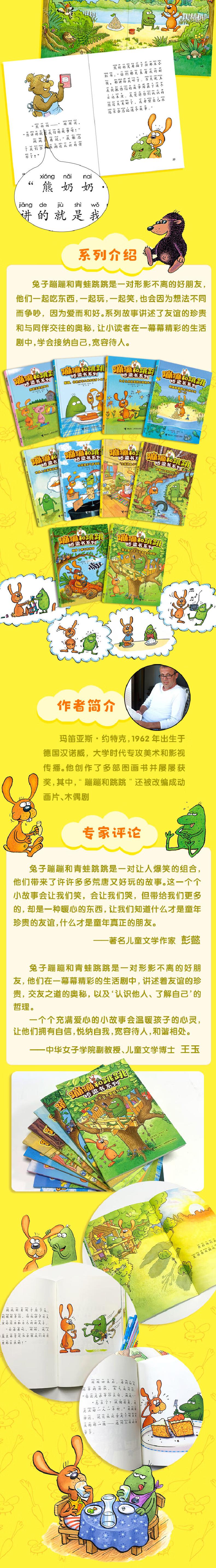 ·这是一套帮助家长育儿的好书。兔子蹦蹦和青蛙跳跳之间发生的矛盾冲突,既具有普遍性,又具有针对性,孩子们可以通过读故事来了解与朋友相处的方法——敞开心扉、接受劝告、互相体谅。每本书都堪称是一个不说教又能有效解决问题的方案!在这个人人都焦虑地追求所谓成功的时代,书中所蕴含的价值观、哲学观,不正是我们大人希望传递给孩子的吗?