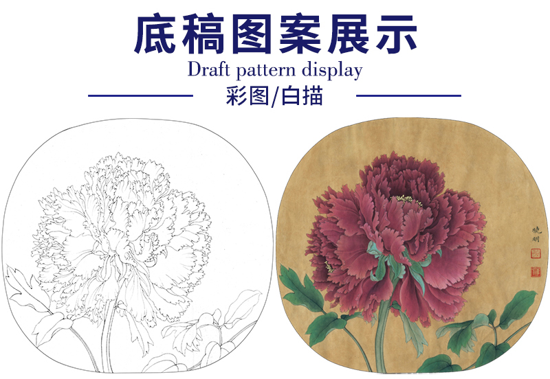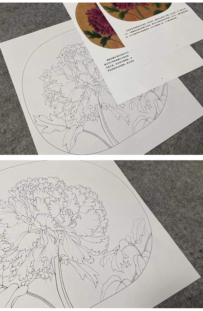 【有步骤、大彩图】李晓明工笔画白描底稿圆形小品《临宋品字牡丹图》牡丹初学者临摹花鸟线稿KL08