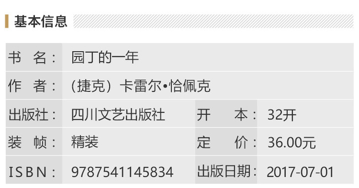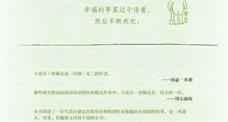 《园丁的一年》是诺贝尔文学奖提名候选人、《鲵鱼之乱》作者卡雷尔·恰佩克的代表作品之一,以鲜活生动的语言塑造了一位波西亚园丁一年四季的园艺生活,配以其兄长约瑟夫·恰佩克的多幅插画,幽默有趣。受到兰·昆德拉、阿瑟·勒、博尔赫斯高度赞许,被誉为自然文学的经典。这是属于卡雷尔·恰佩克的“园丁手册”,也是属于“心灵花园”。