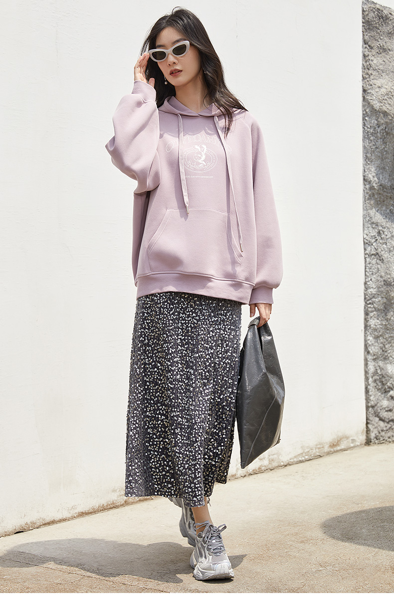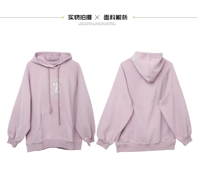 淡紫色连帽卫衣 复古风字母印花宽松上衣 春秋季慵懒感显瘦百搭女式带帽衫
