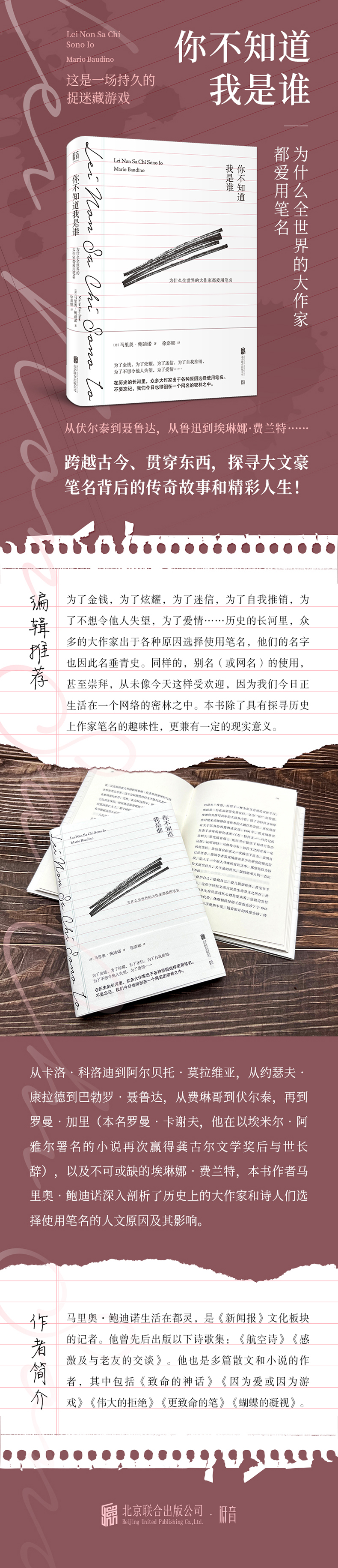 从卡洛•科洛迪(原名罗伦齐尼)到阿尔贝托•莫拉维亚(原名平凯尔莱),从约瑟夫•康拉德到巴勃罗•聂鲁达,从特奥菲洛•福伦戈到伏尔泰,从翁贝托•萨巴到佩索阿,再到罗曼•加里(本名罗曼•卡谢夫,他在以埃米尔•阿贾尔署名的小说再次赢得龚古尔大奖后与世长辞),以及不可或缺的埃琳娜•费兰特,本书作者马里奥•鲍迪诺深入剖析了历史上的大作家和诗人们选择使用笔名的人文原因及其影响。
