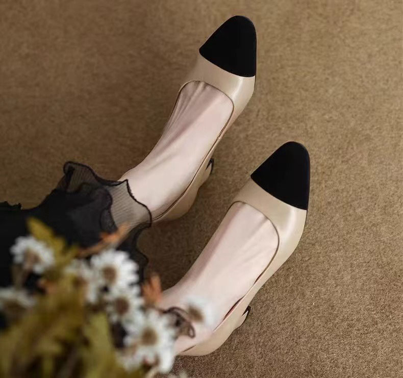 整只鞋子采用了这种套包拼色工艺,驼色鞋头黑色部分采用的是山东丝绸,防刮耐磨的同时还很好打理!这个小设计不仅美观而且还很实用呢!
