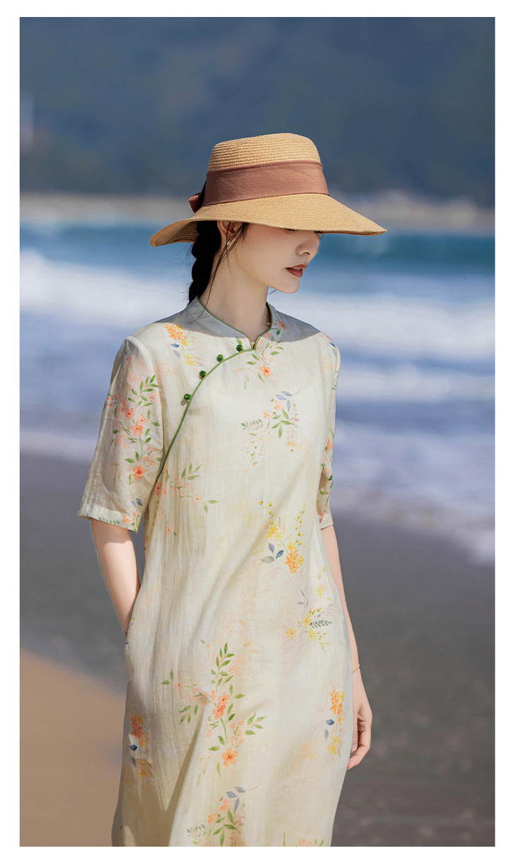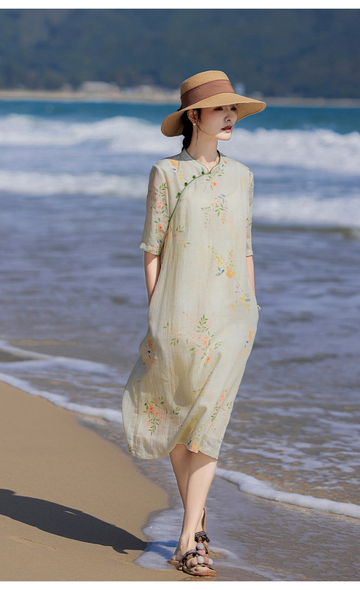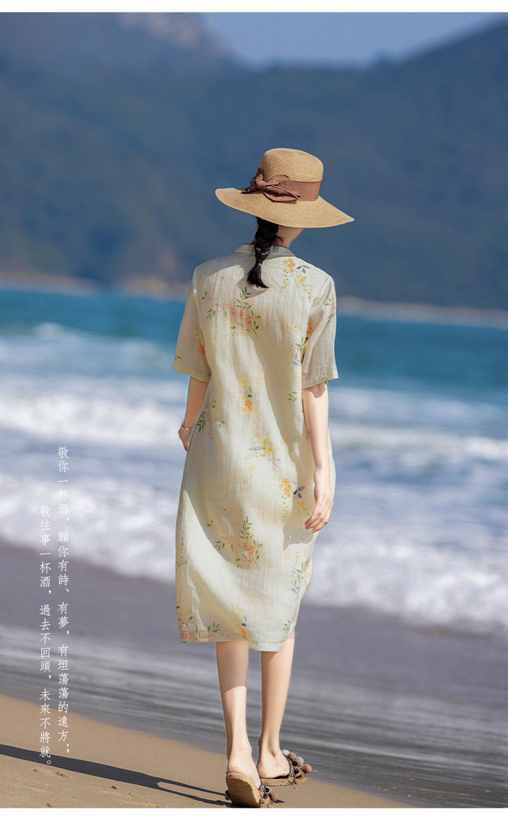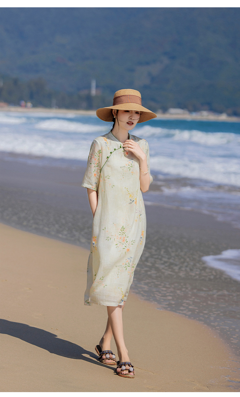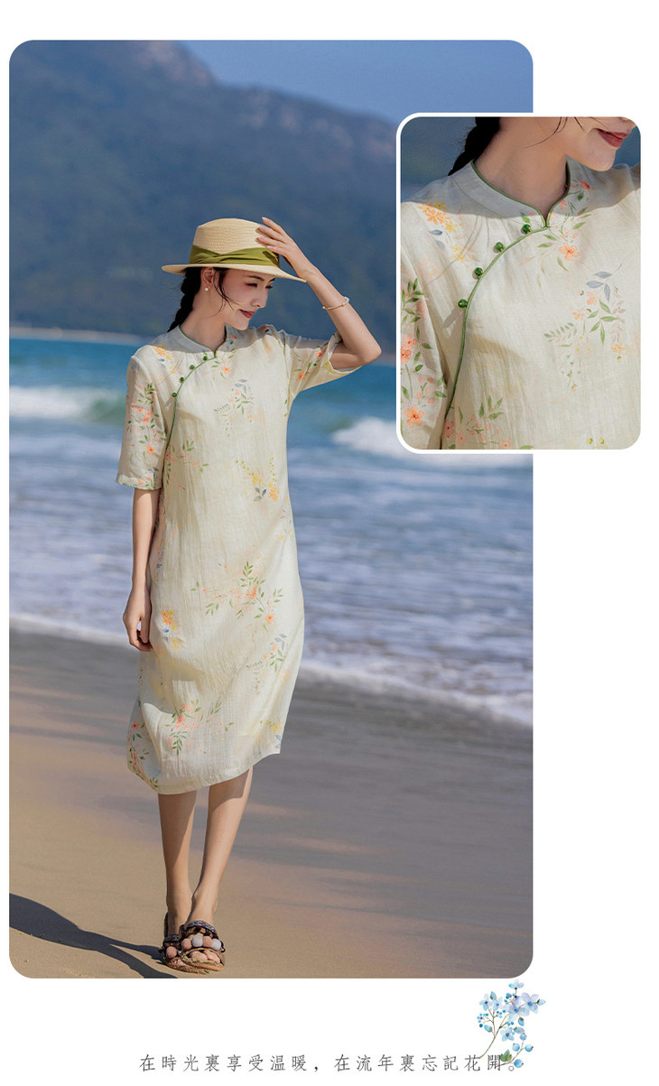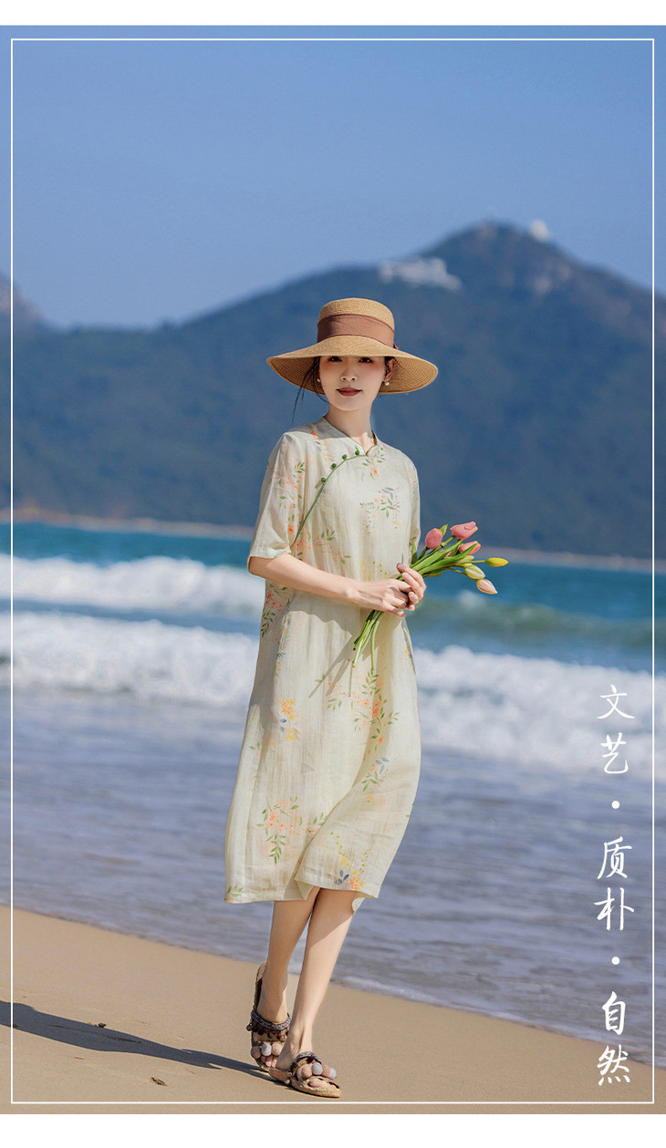 HM-S465春夏原创新款旅行文艺苎麻印花改良旗袍古典立领中袖连衣裙女