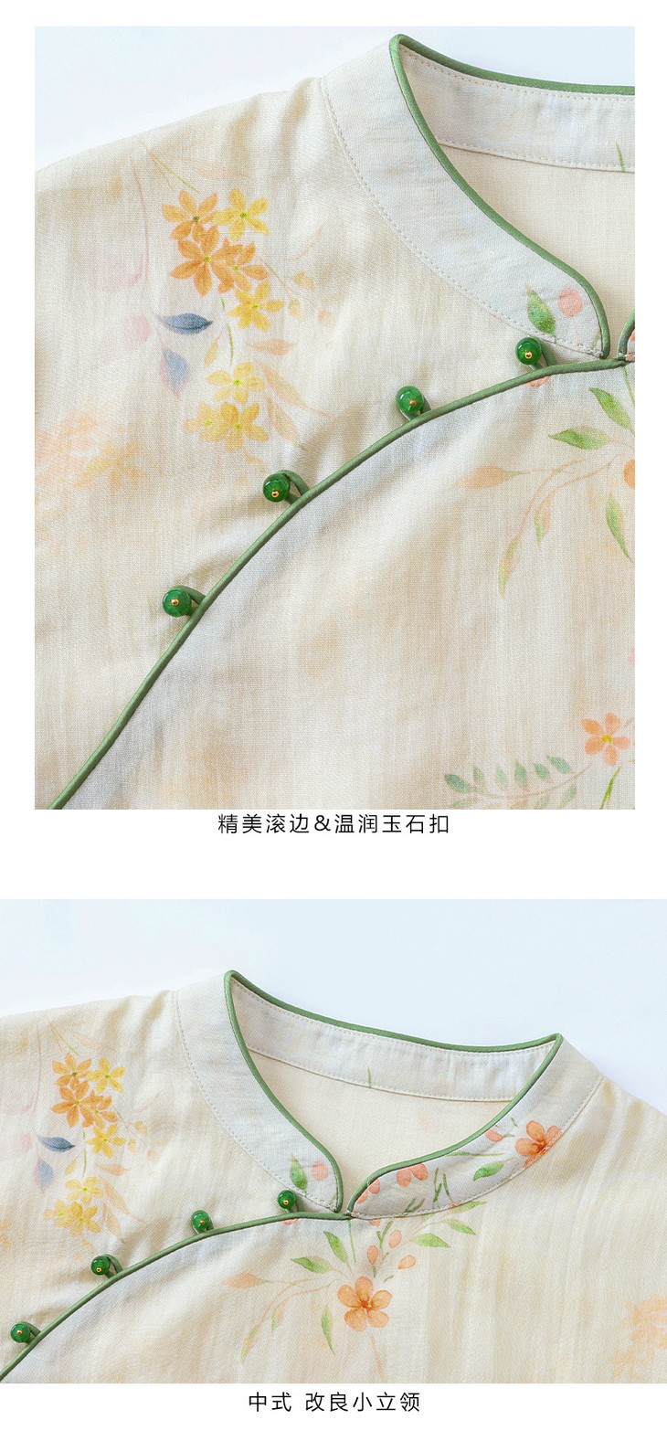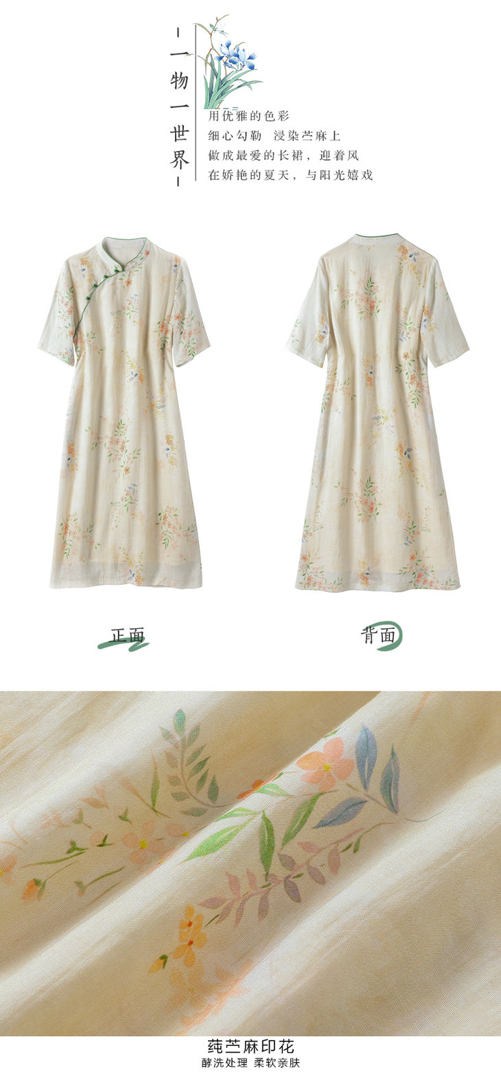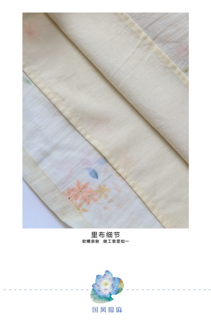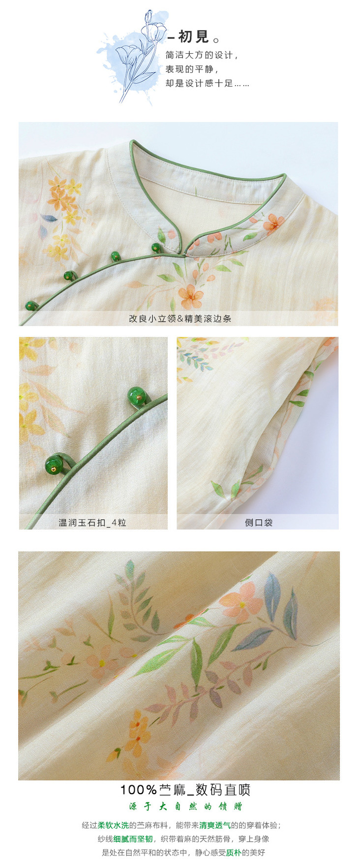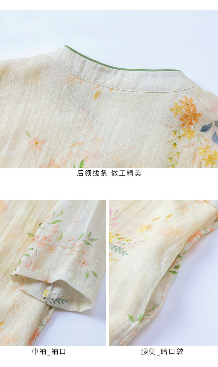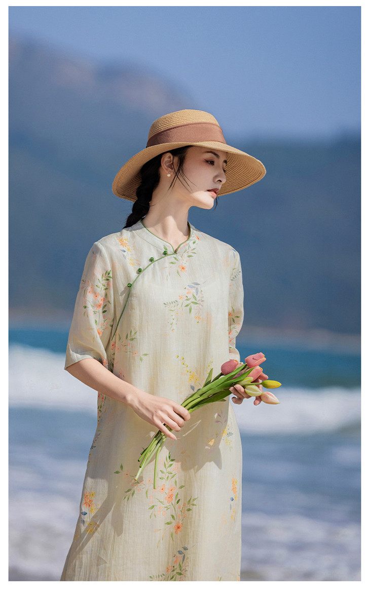 HM-S465春夏原创新款旅行文艺苎麻印花改良旗袍古典立领中袖连衣裙女