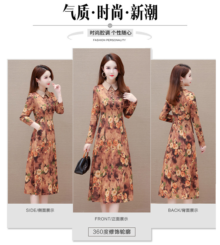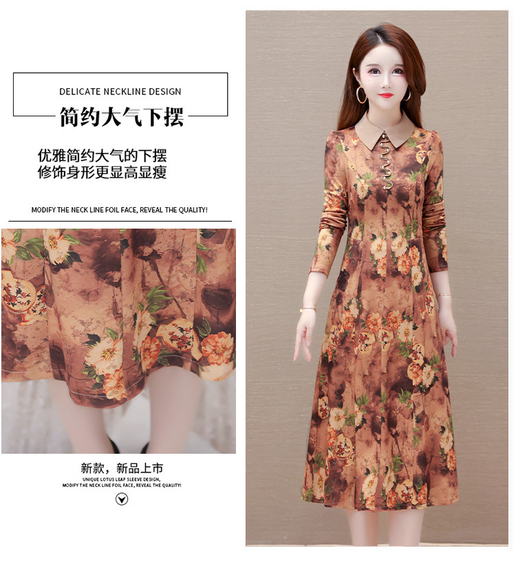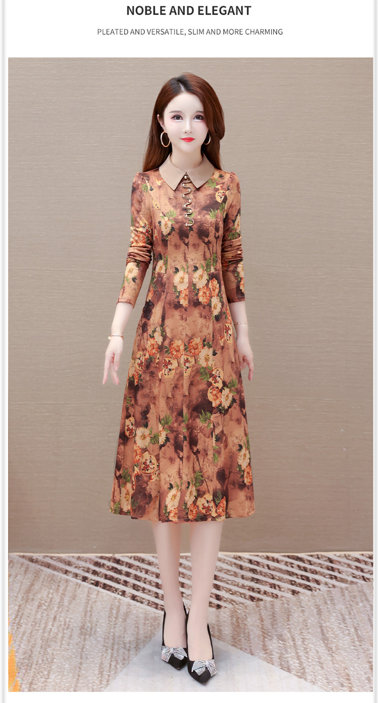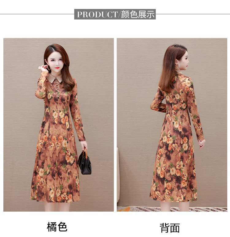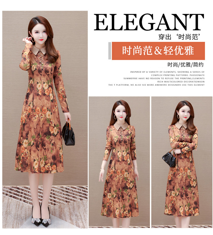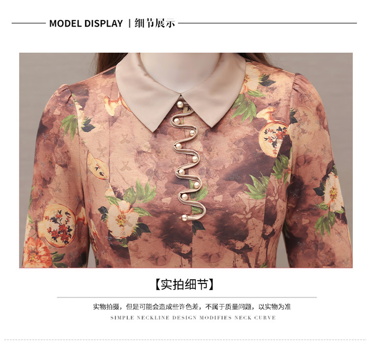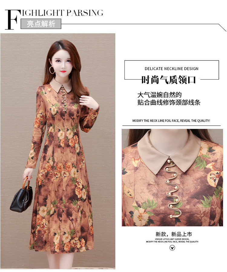 秋季新款,妈妈装中长裙长袖女装长款A字裙娃娃领印花连衣裙QYM-LRX-HJY9771-Y