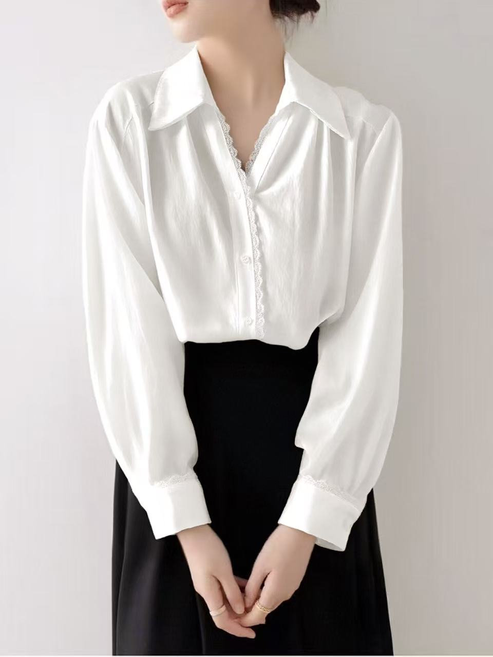 【秋新品】2618 v领70%黏胶纤维蕾丝边秋季衬衫-喜出
